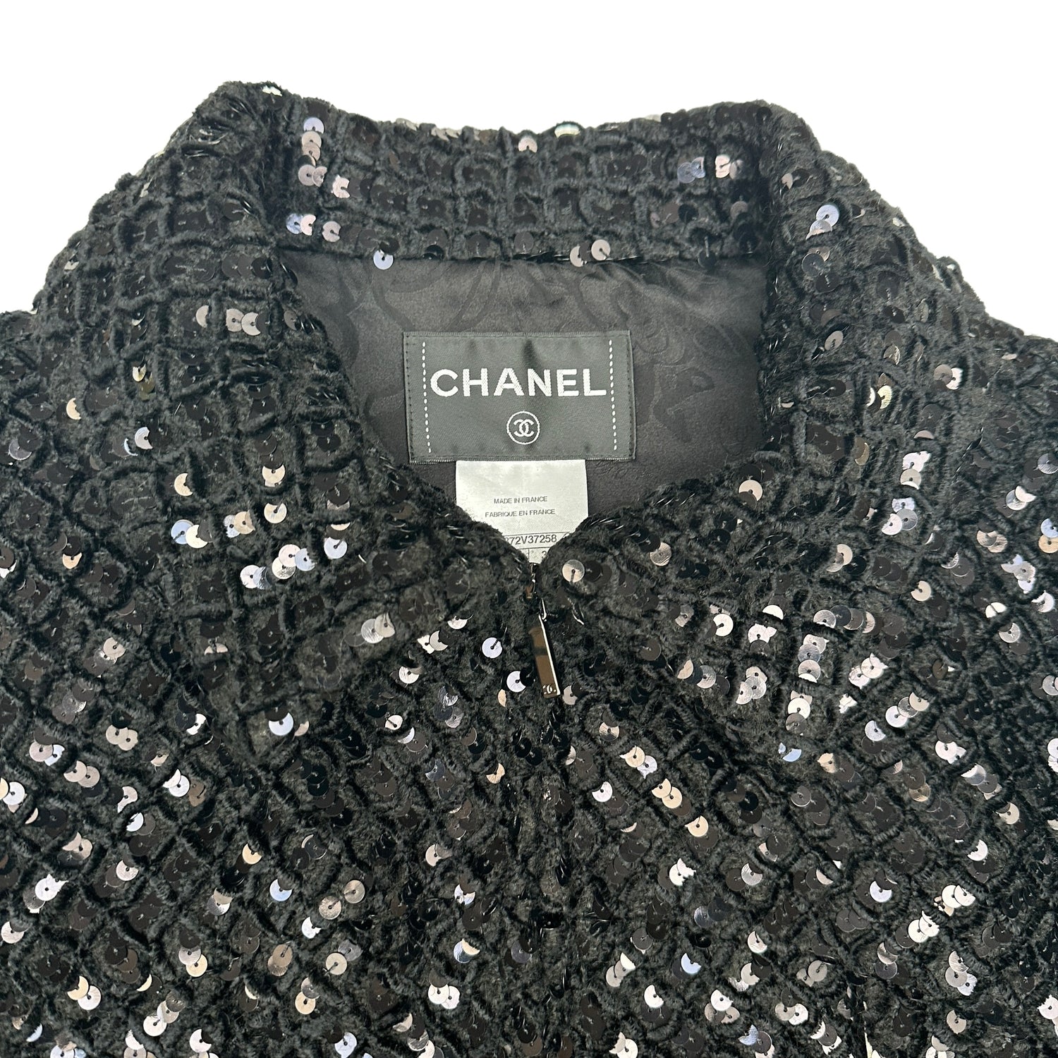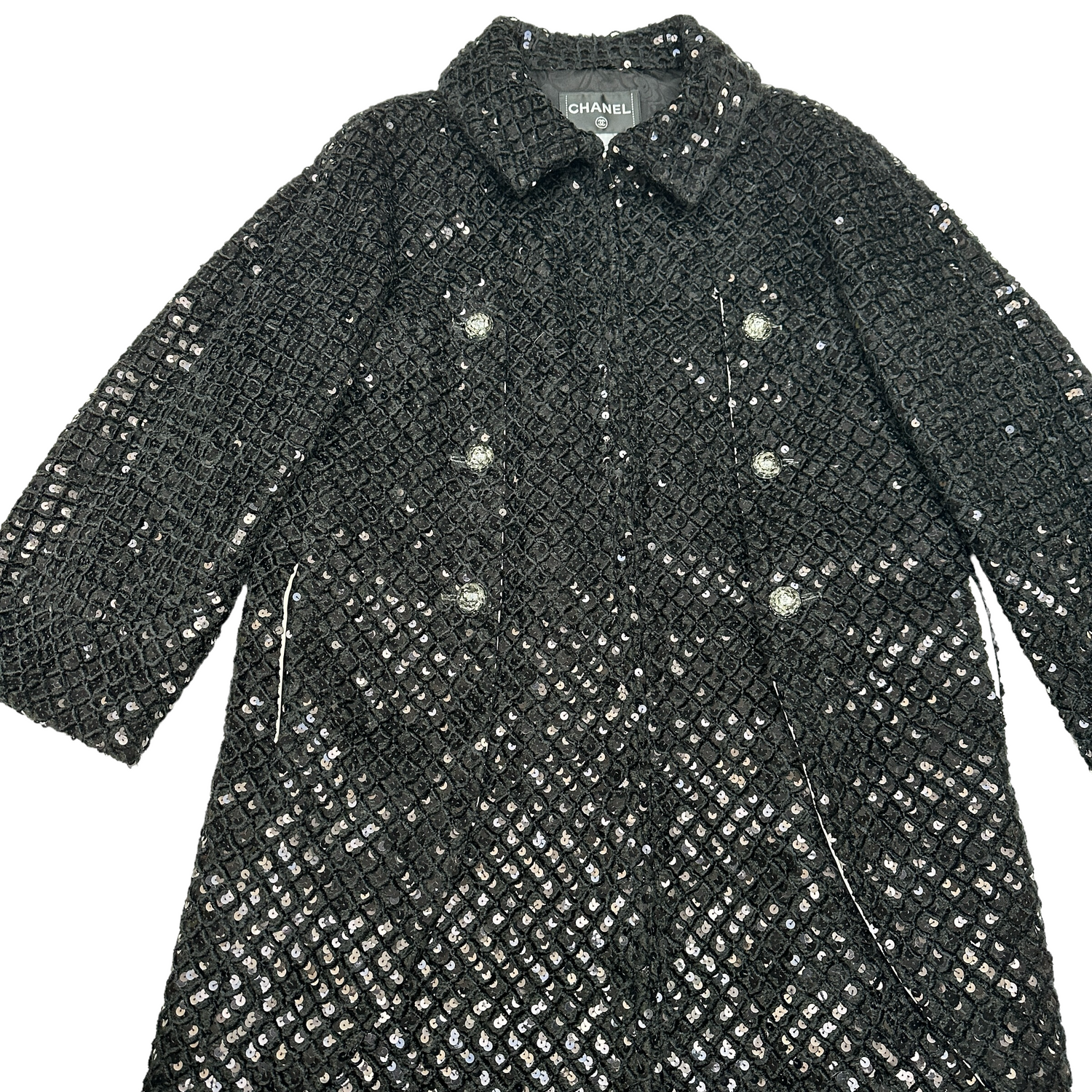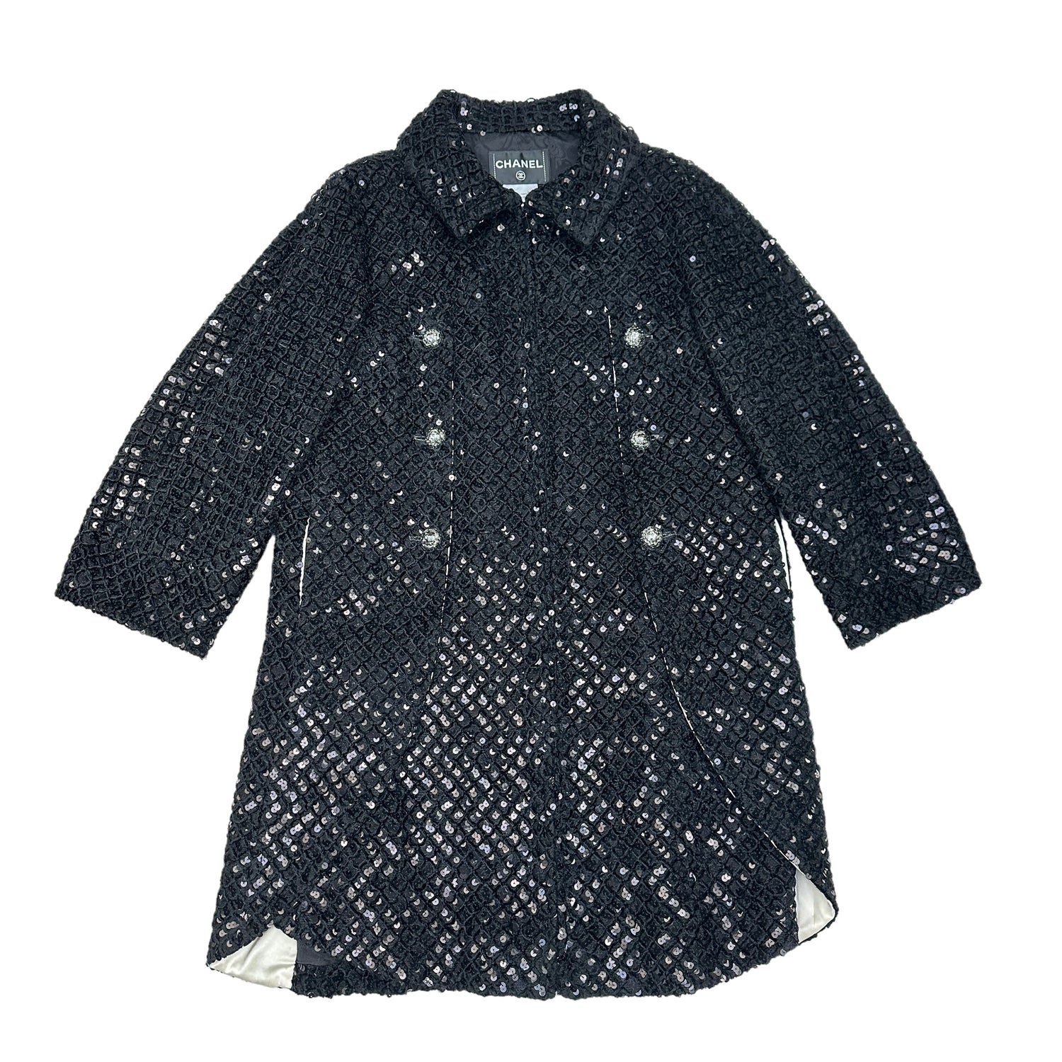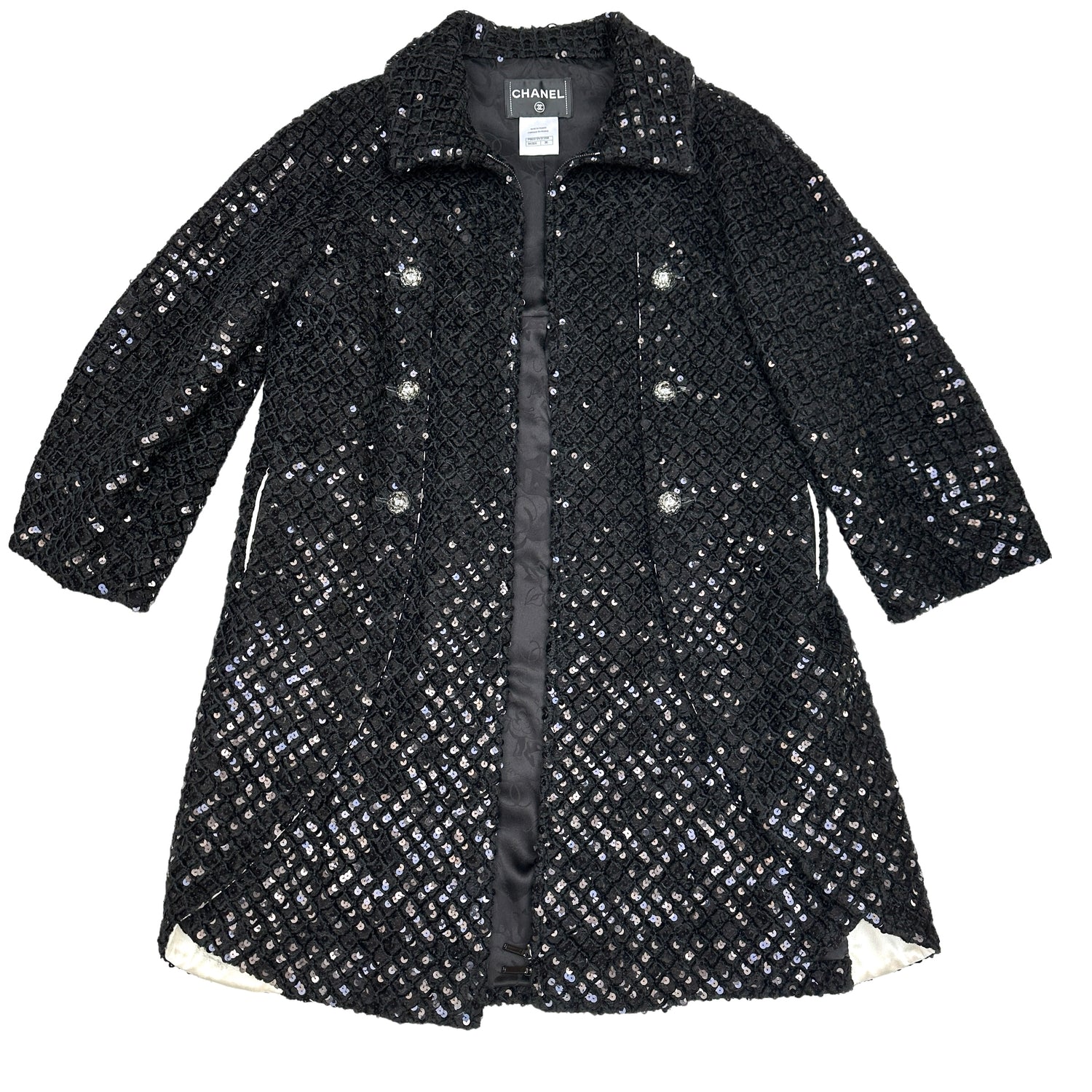 Chanel black sequins coat. This is a very rare and limited edition coat by Chanel. Zipper closure at front. Sequins throughout the coat with sliding panels over a white satin lining. Sequins are embedded in a quilted soft velvet like fabric which gives this coat a very smooth touch. Buttons are sequins in a flower pattern enclaved in clear acrylic with CC in silver at the middle.