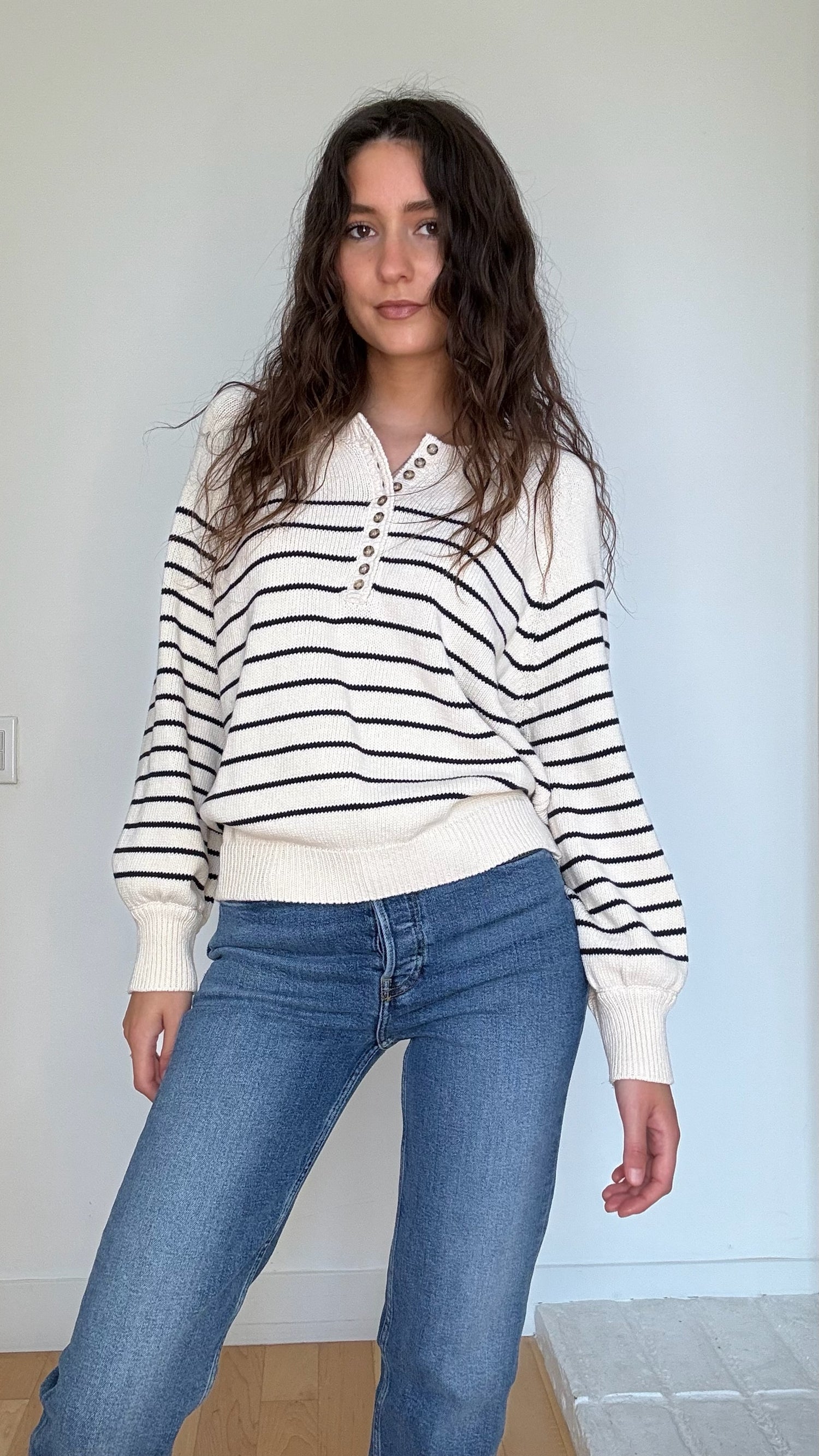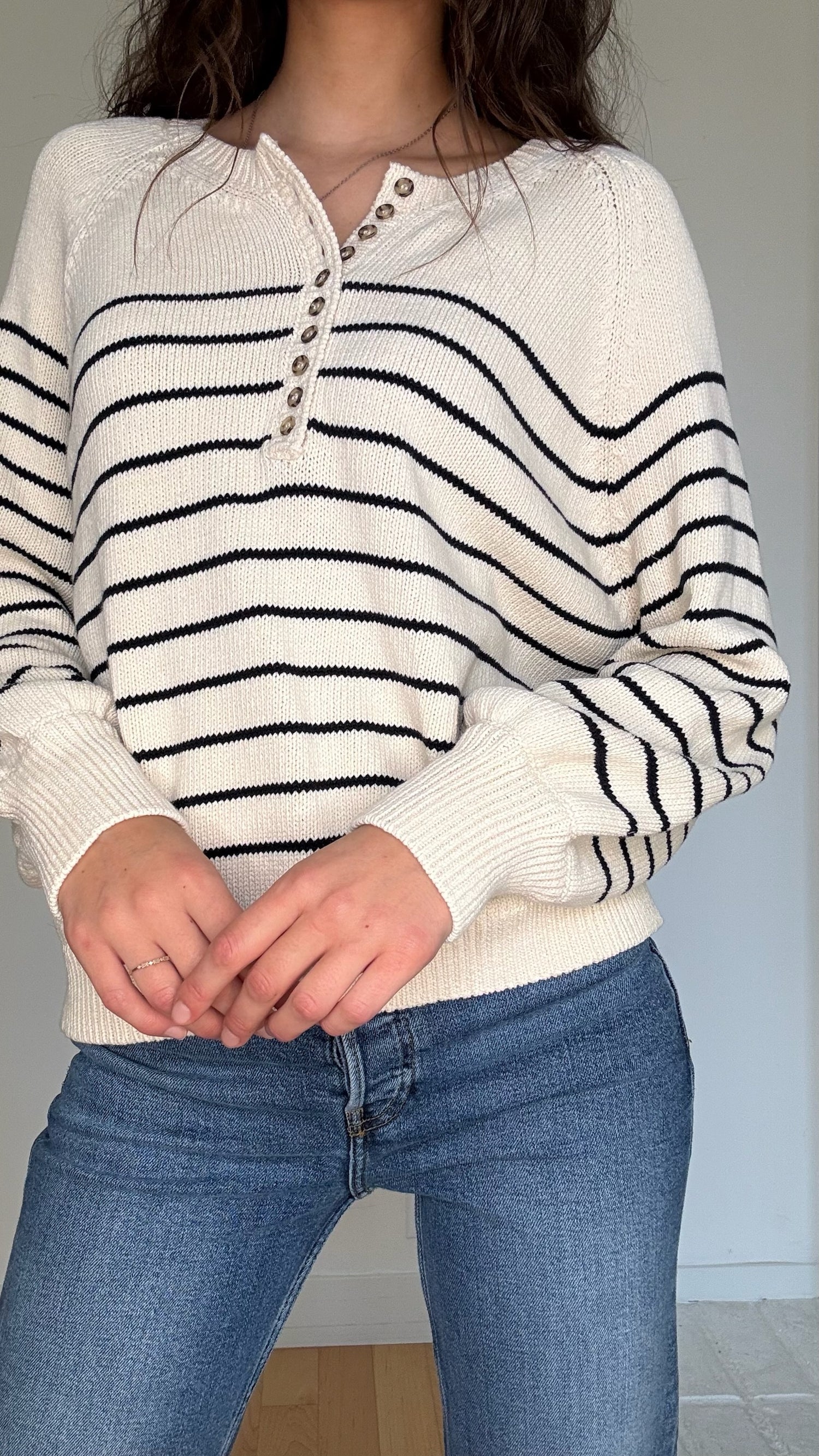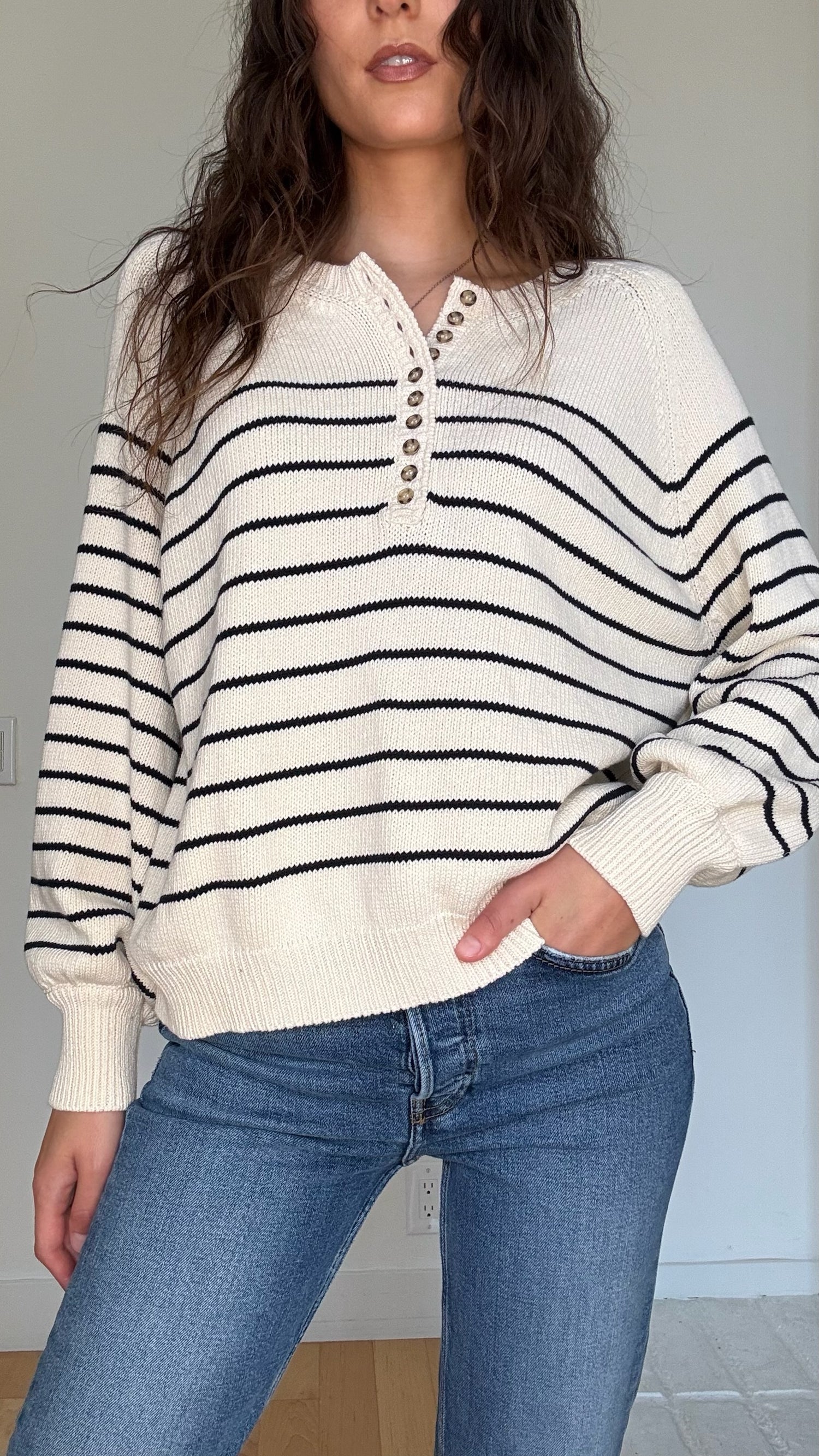 Sezane knit sweater. Quintessential strips. Button details at front. Designer size Large.