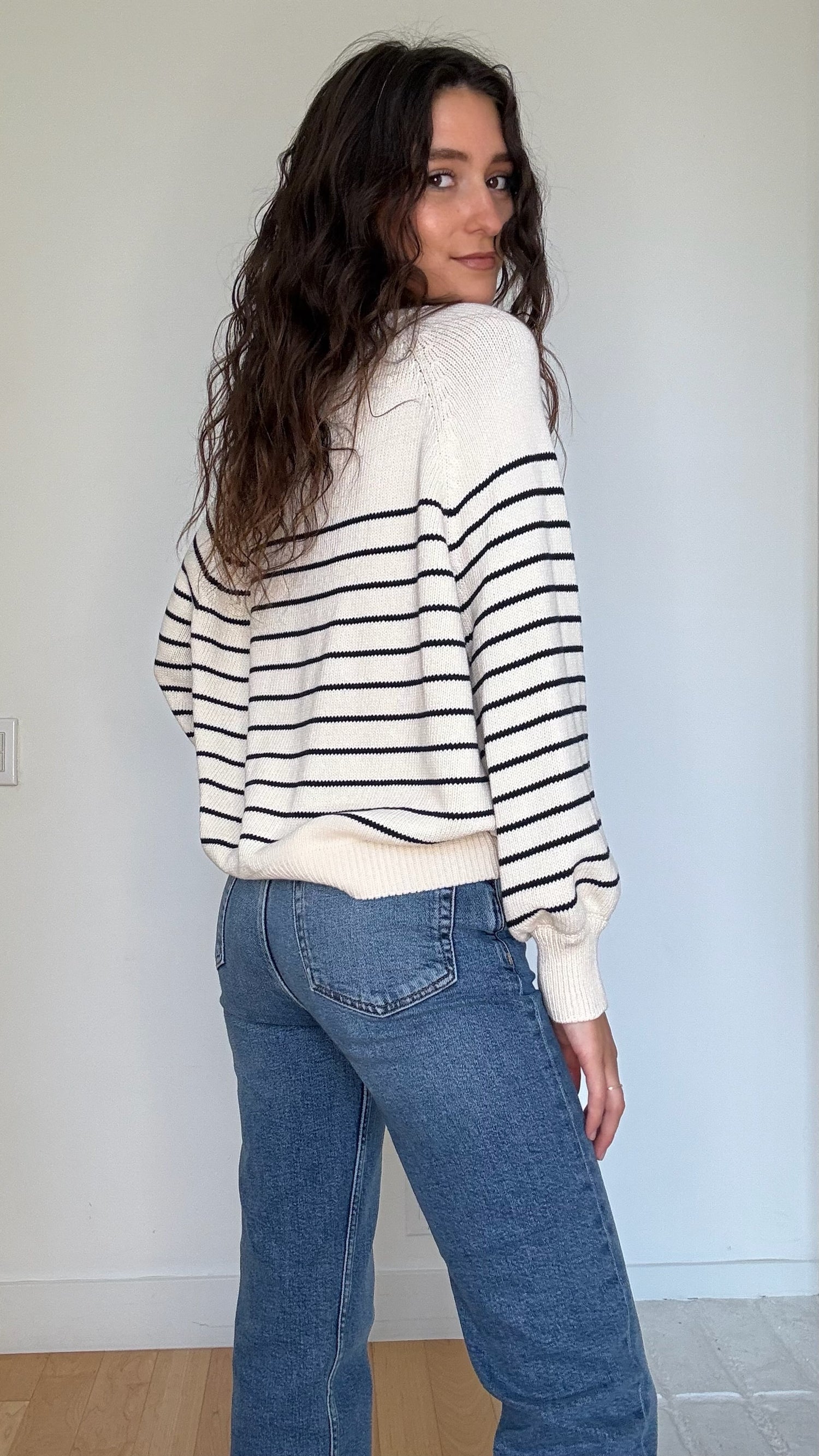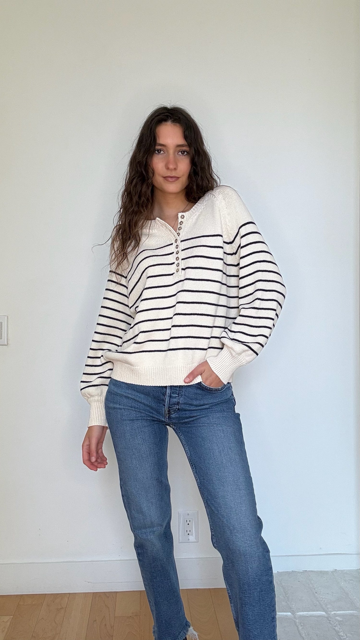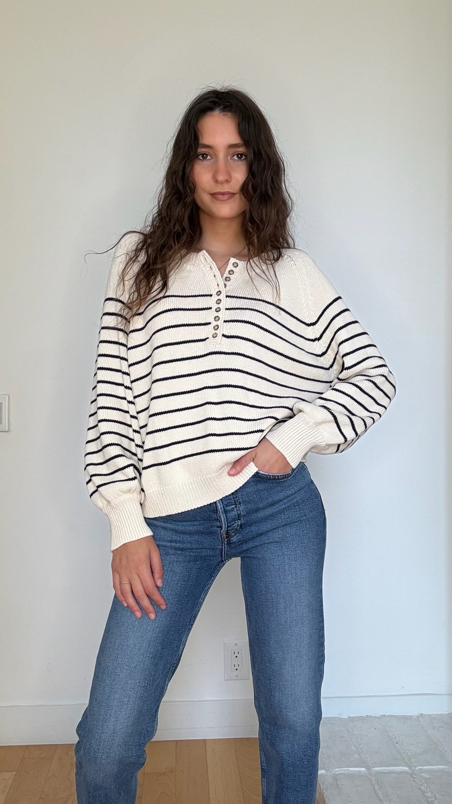 Sezane knit sweater. Quintessential strips. Button details at front. Designer size Large.