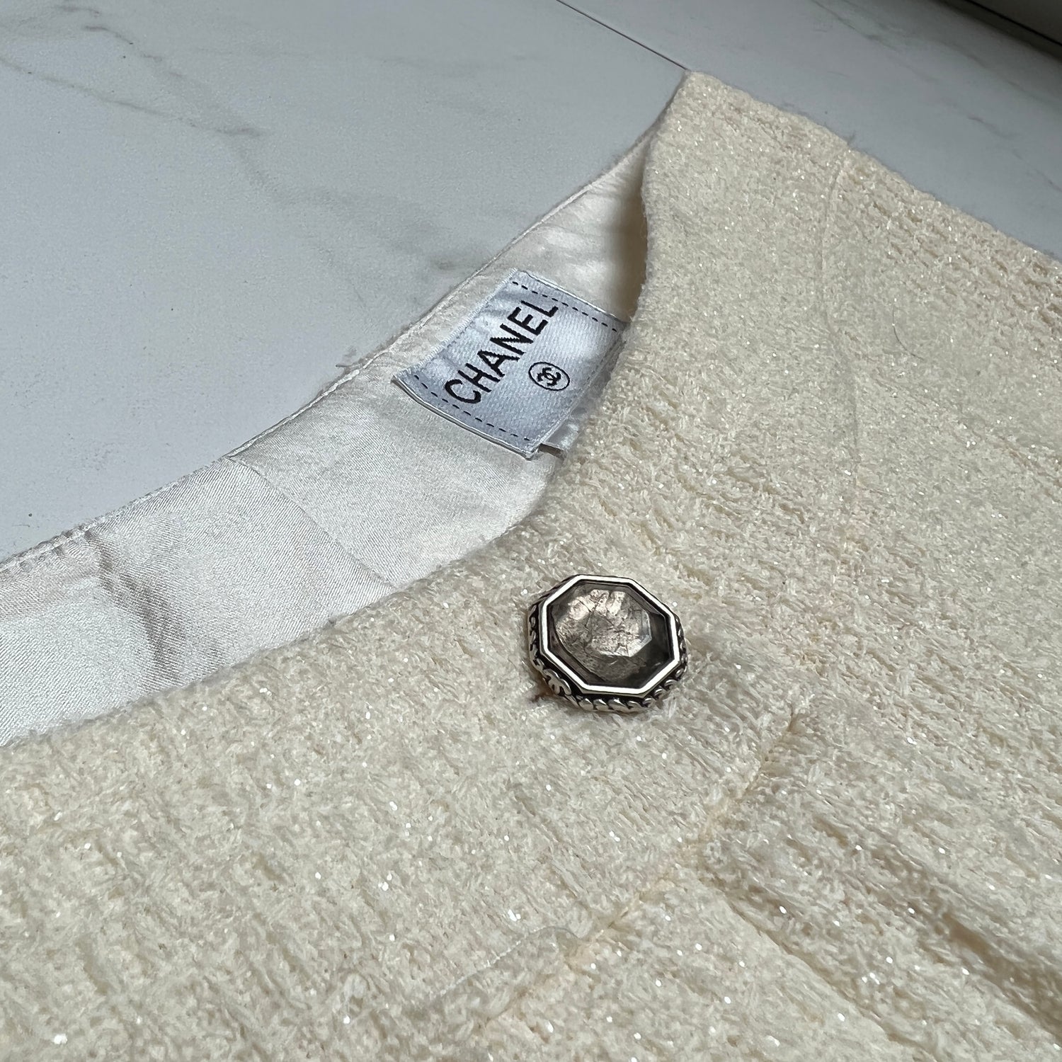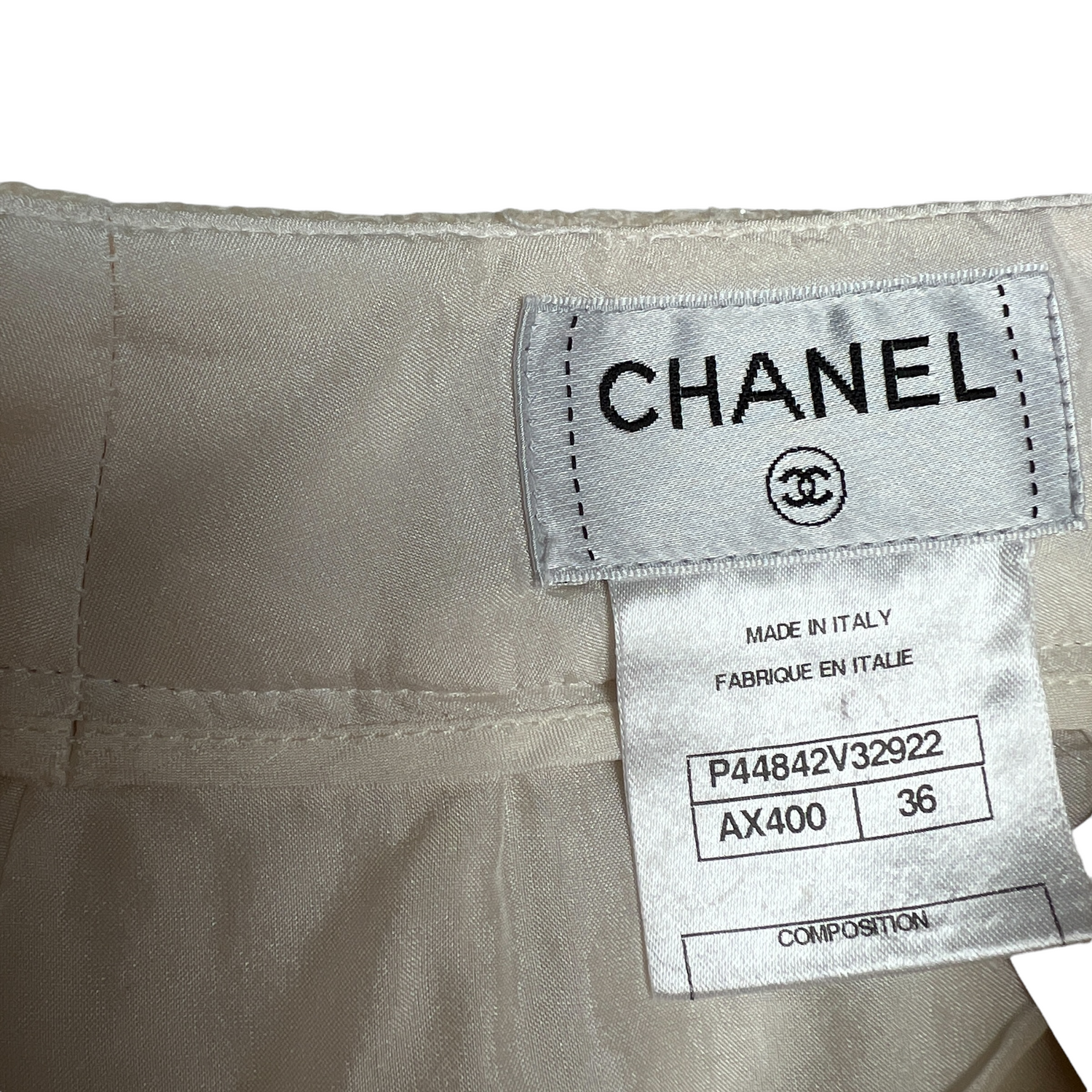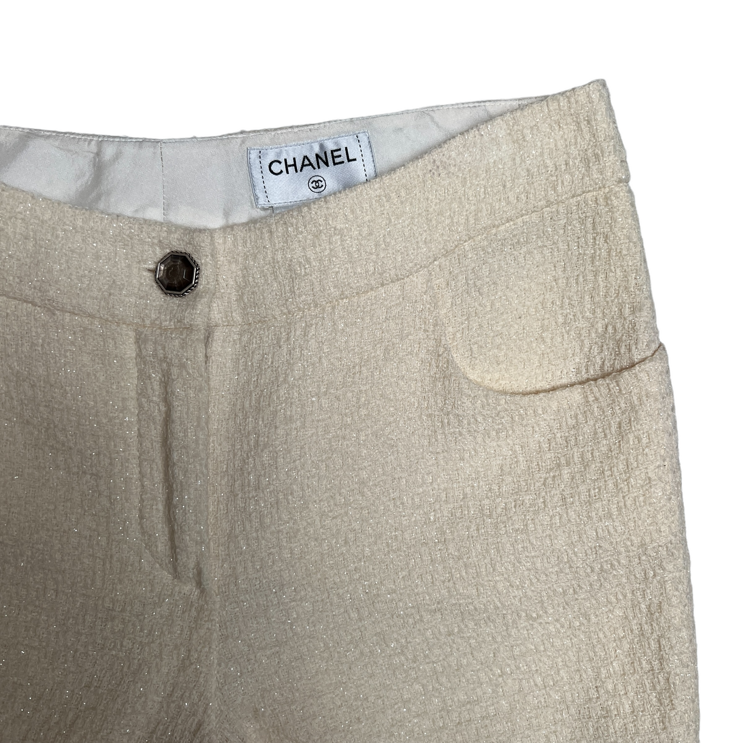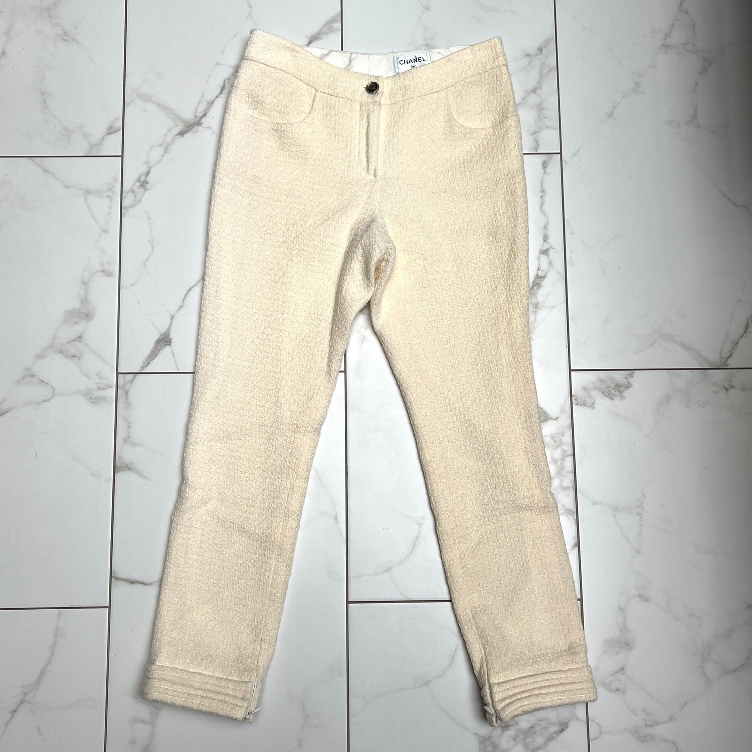 Beige wool pants from Chanel. Tweed pattern with shimmery effect. Two pockets at front. Concealed zippers at bottom. Button and zipper closure at front. Designer size 36.