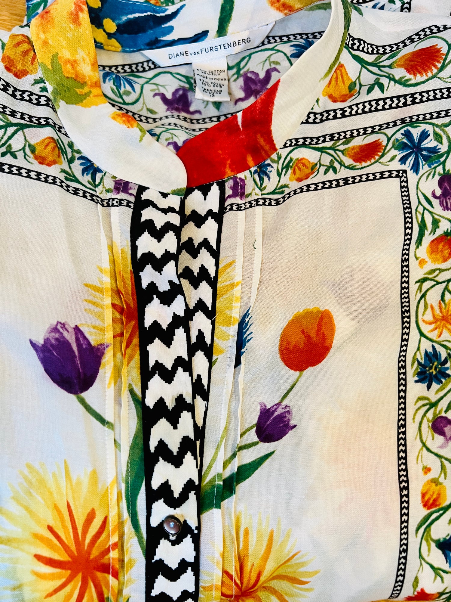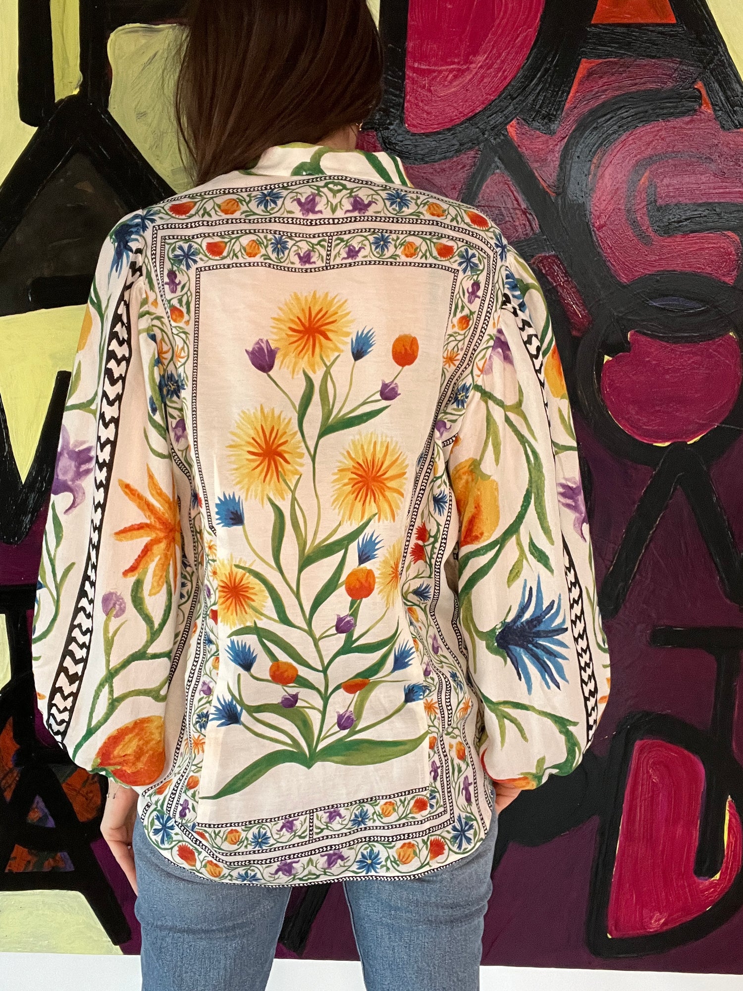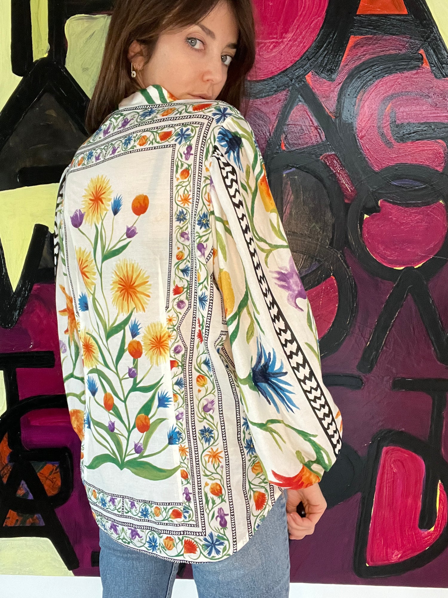 Very soft blouse with flower print. Buttons at chest. Oversized sleeves.