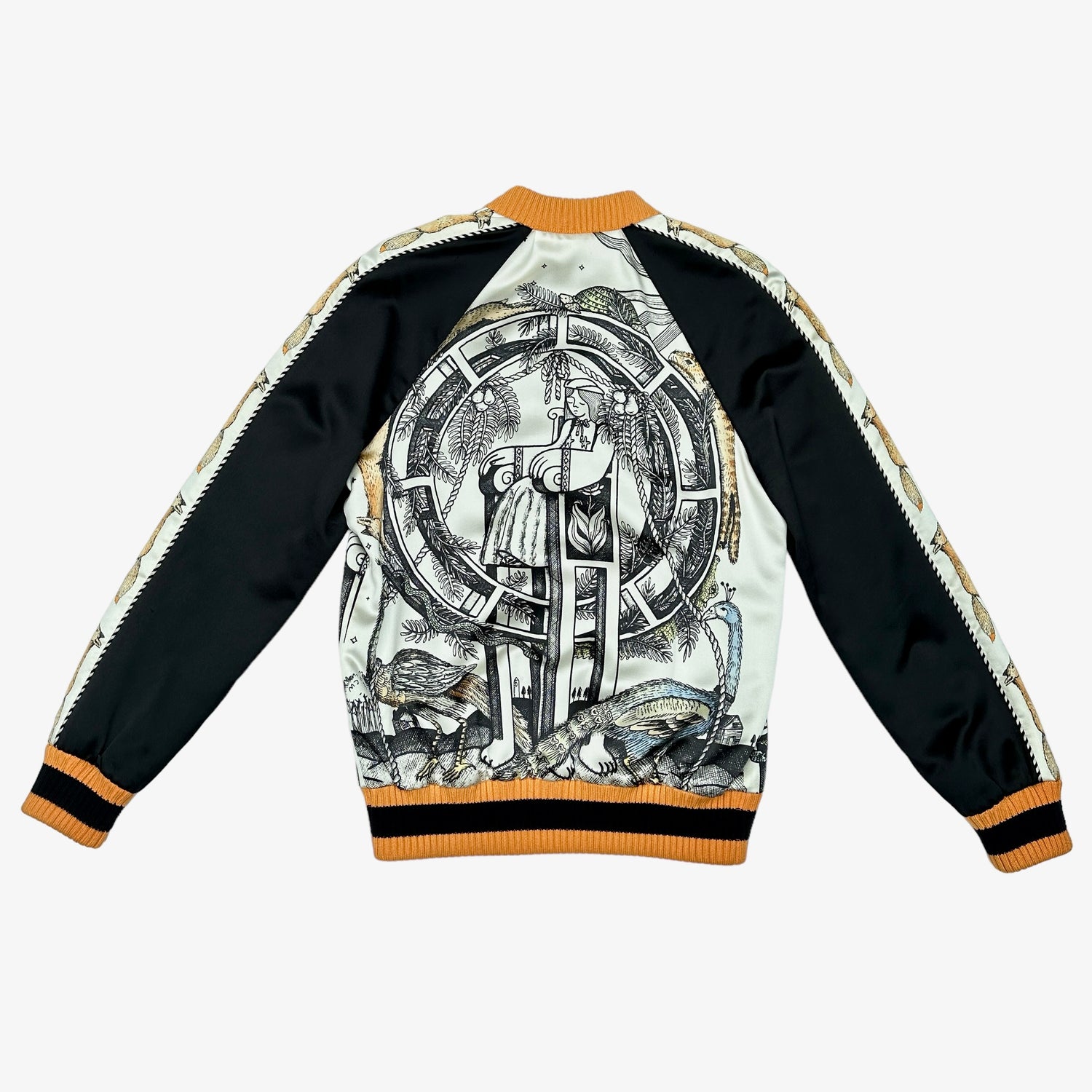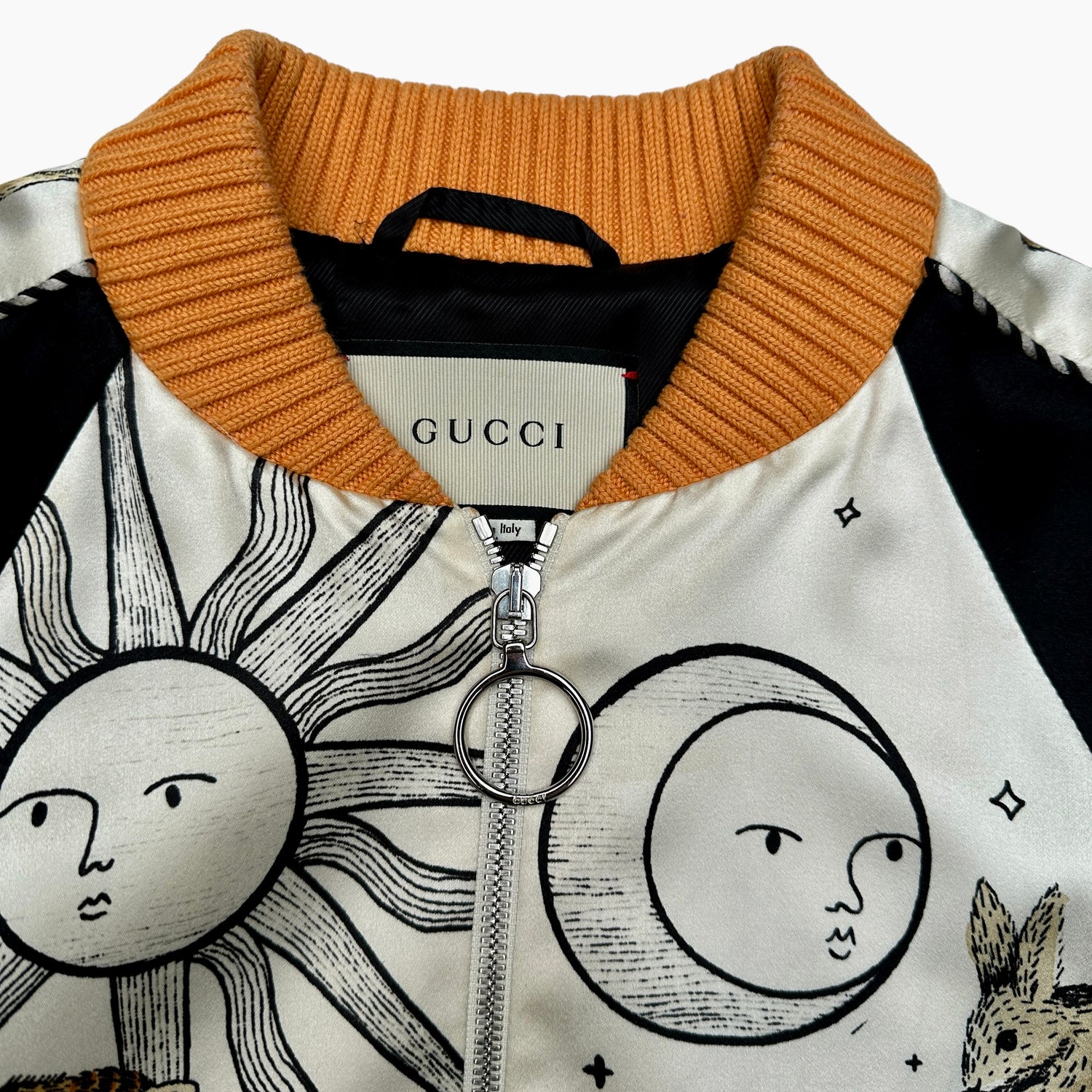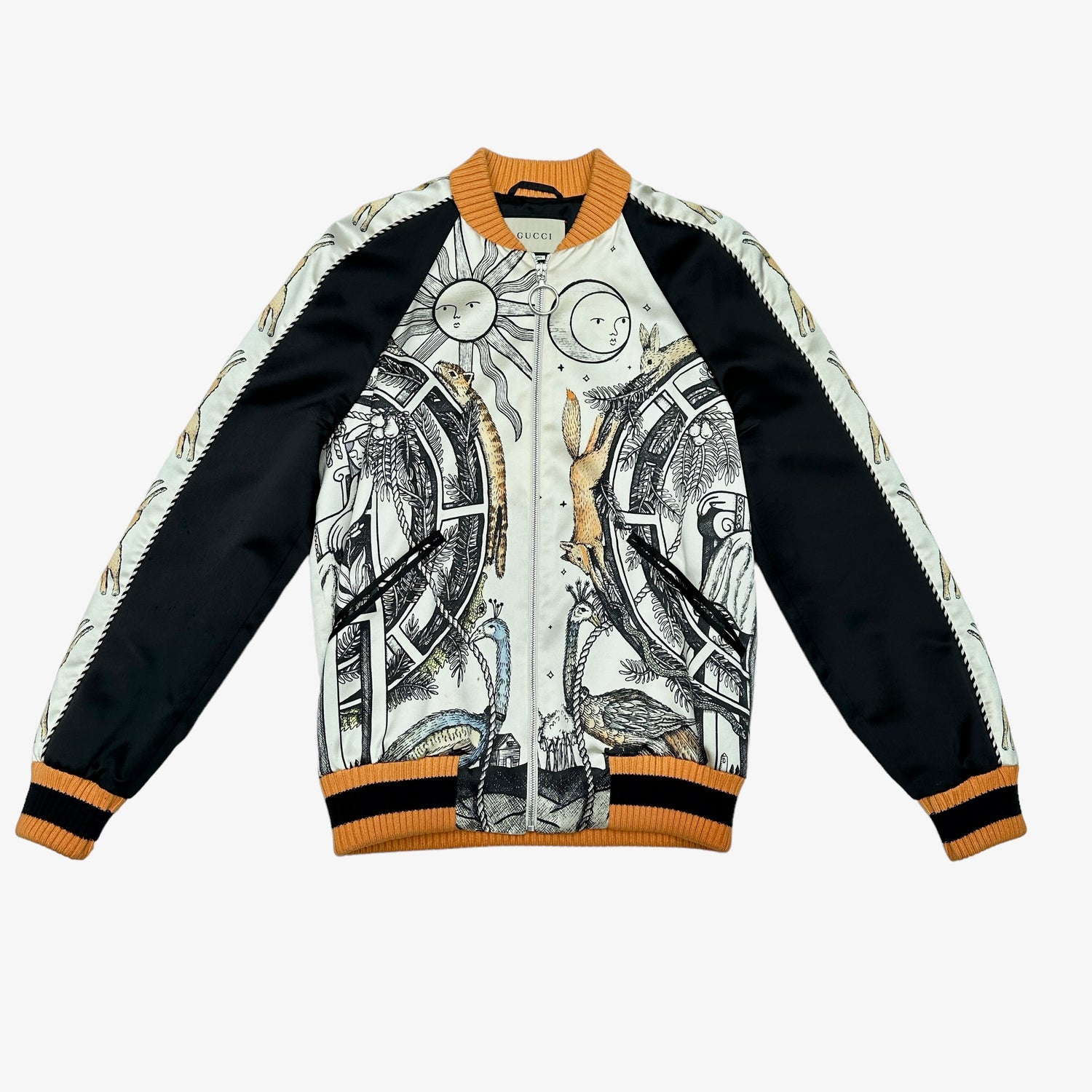 Gucci silk bomber with astrology print. 2017 Collection. Black, cream and orange colors. Ribbed elasticised waist, neck and wrists. Round collar. Silver-tone zipper closure at front. Two slit pockets. Designer size 38.