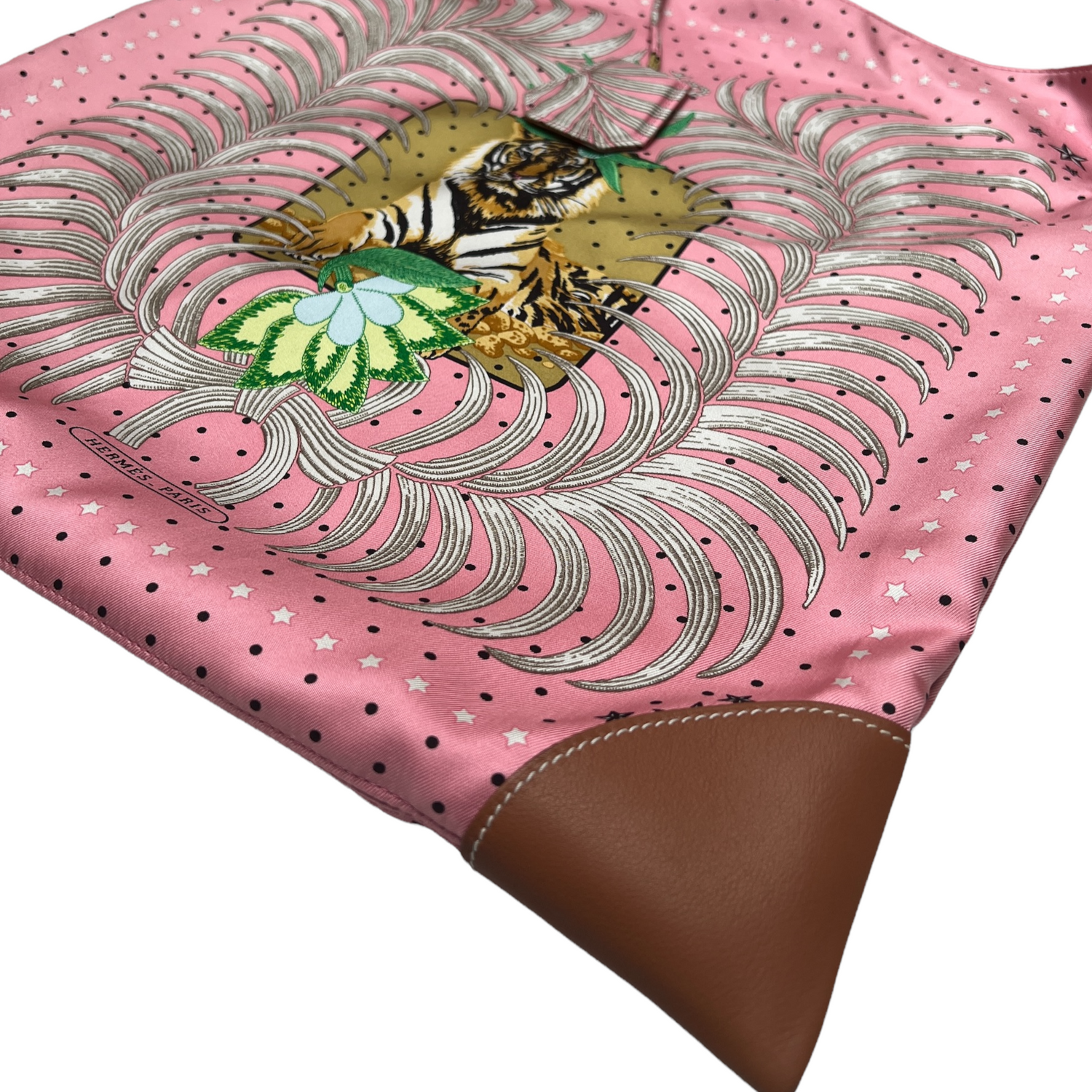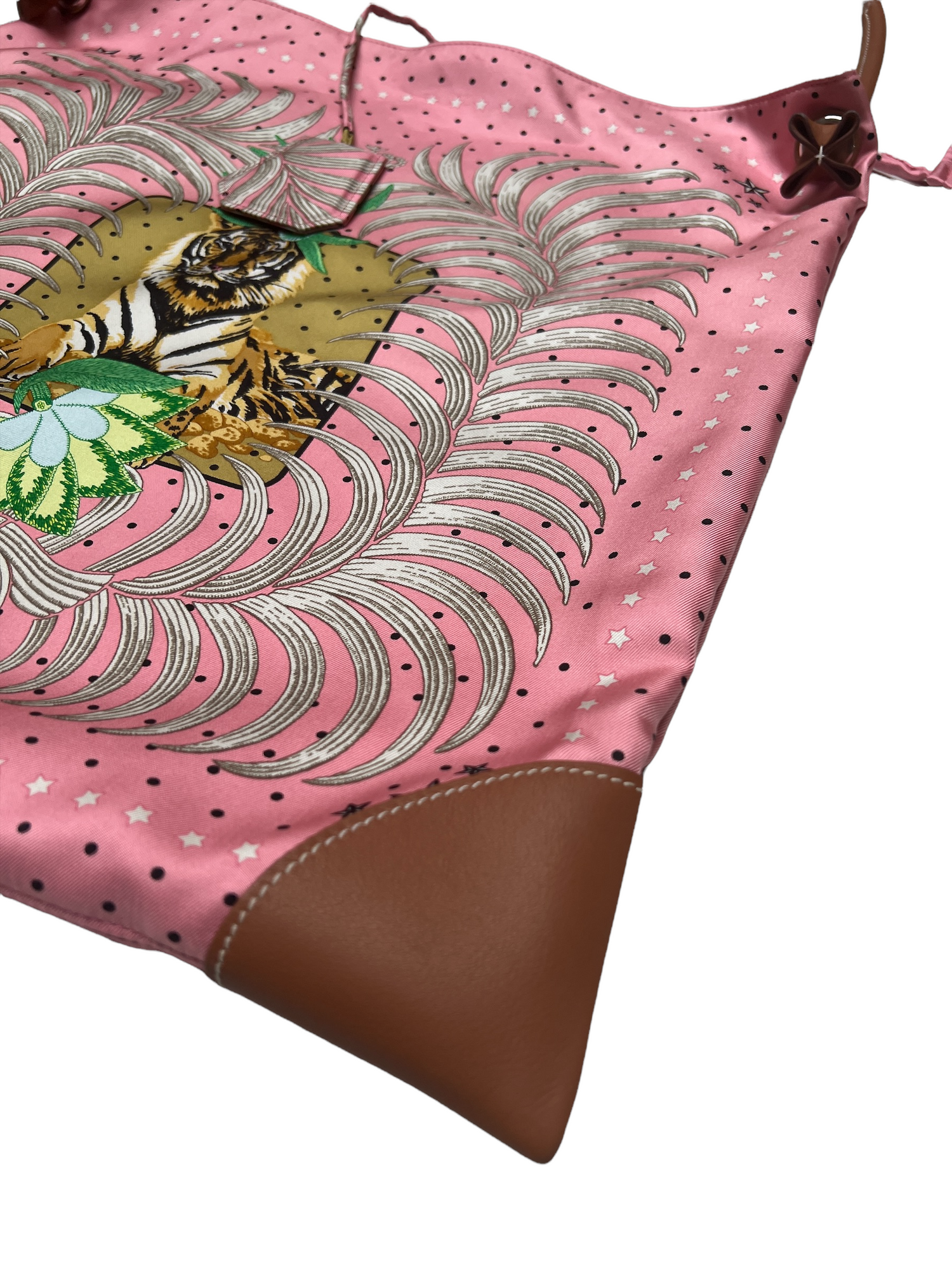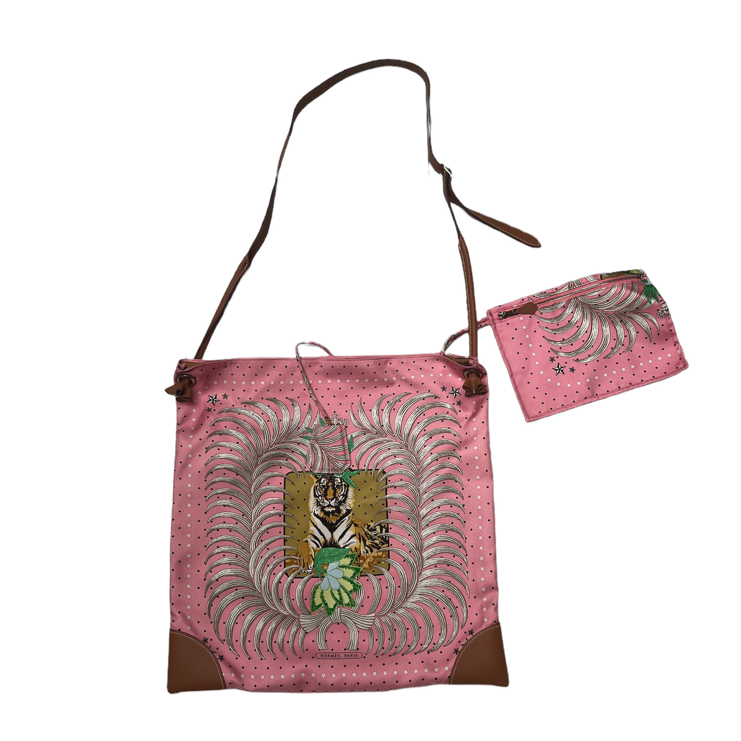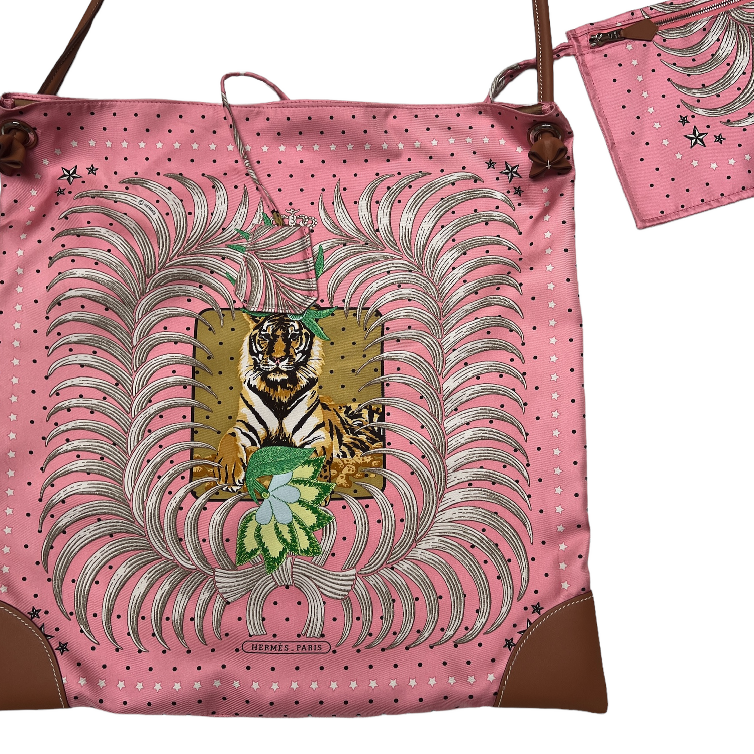 Pink silk Hermes crossbody bag. Tiger and stars print. Tan leather details and strap. Adjustable strap. This bag can be worn as a shoulder bag or crossbody. Silver-tone hardware. Mini Zipper pouch included.
