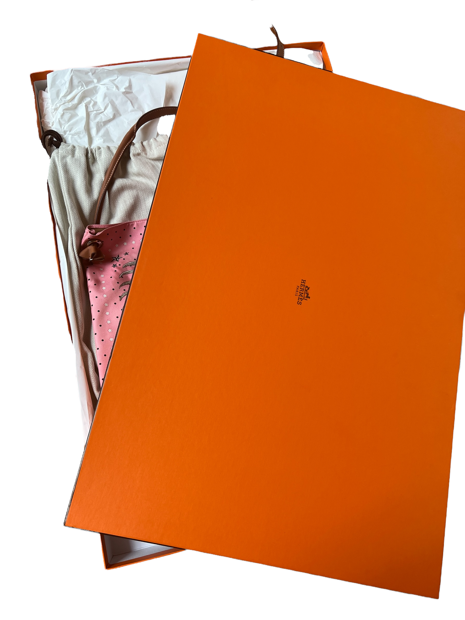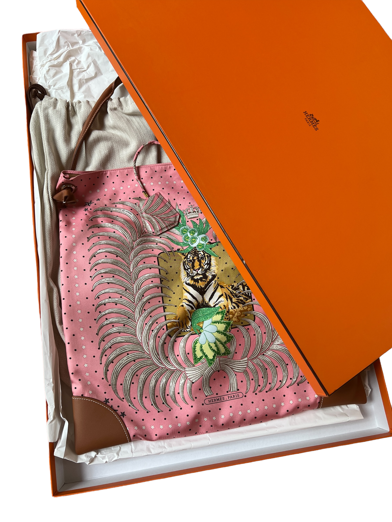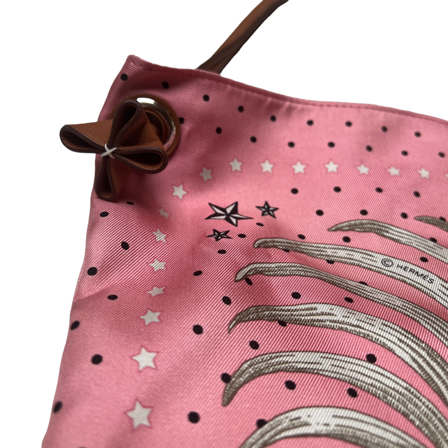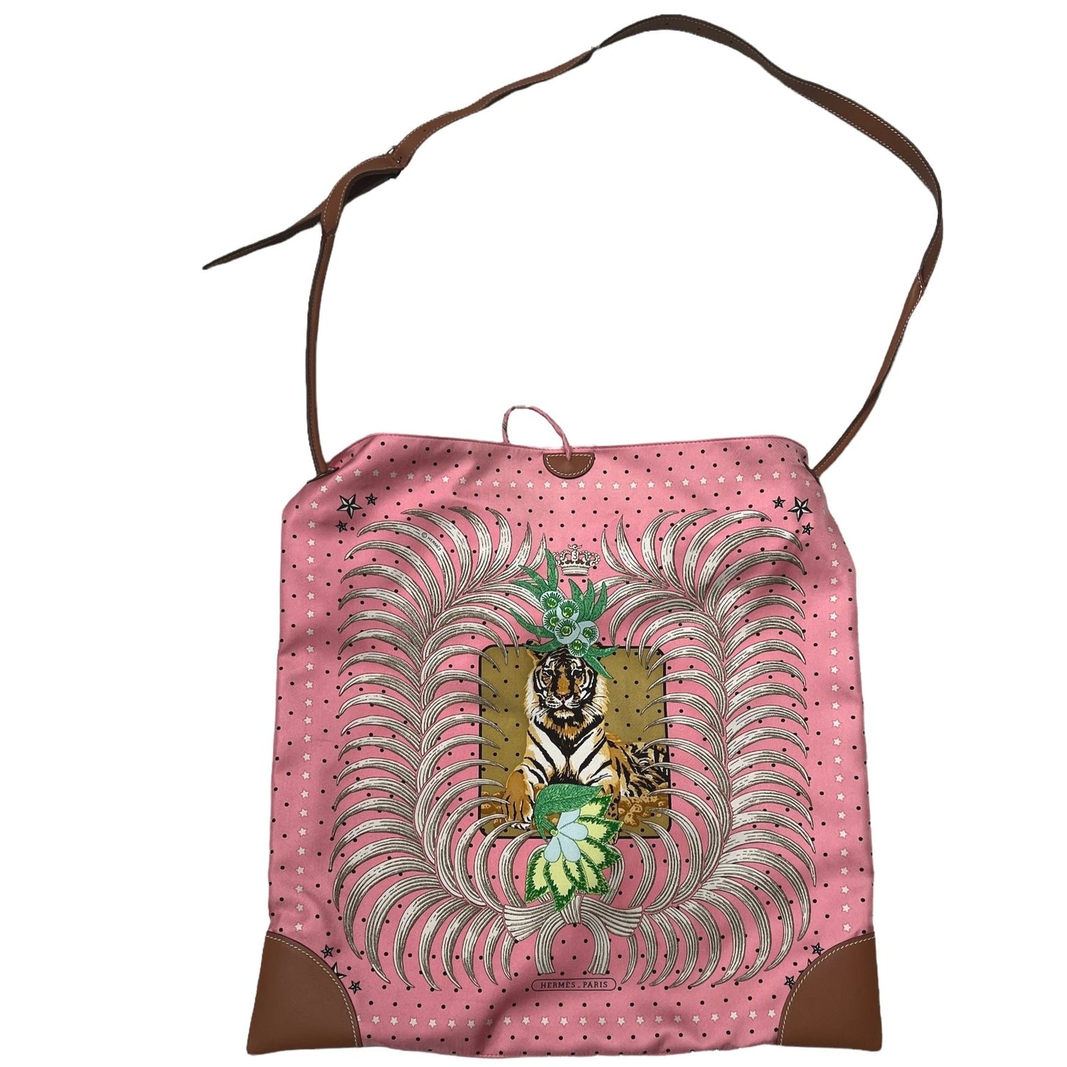 Pink silk Hermes crossbody bag. Tiger and stars print. Tan leather details and strap. Adjustable strap. This bag can be worn as a shoulder bag or crossbody. Silver-tone hardware. Mini Zipper pouch included.
