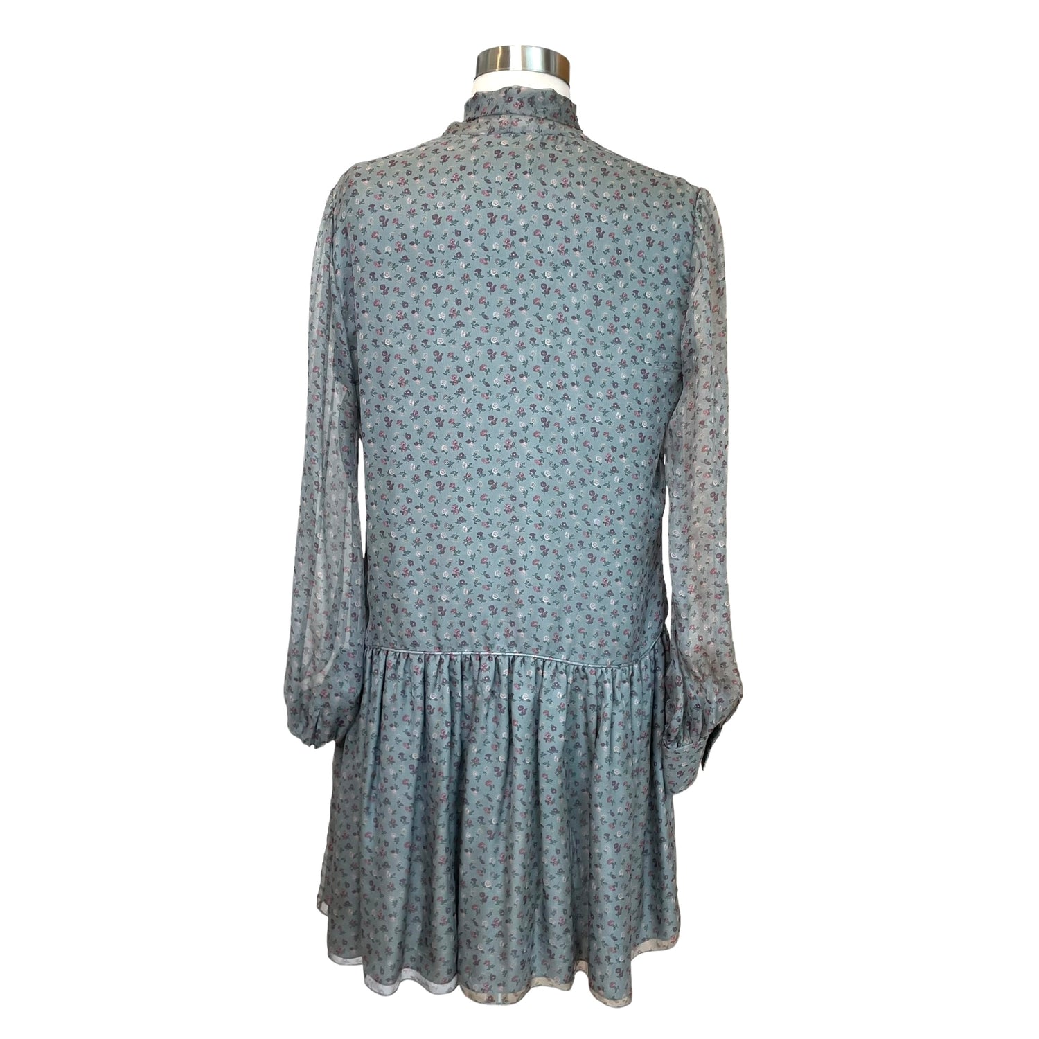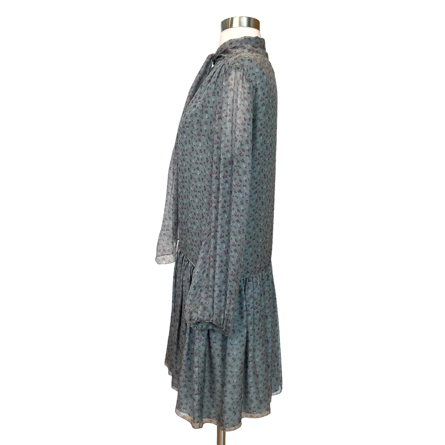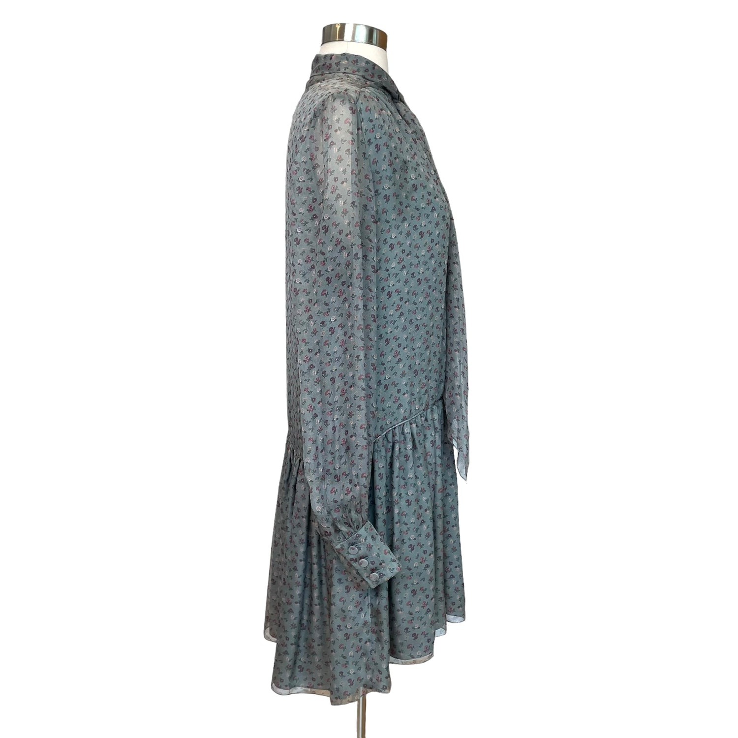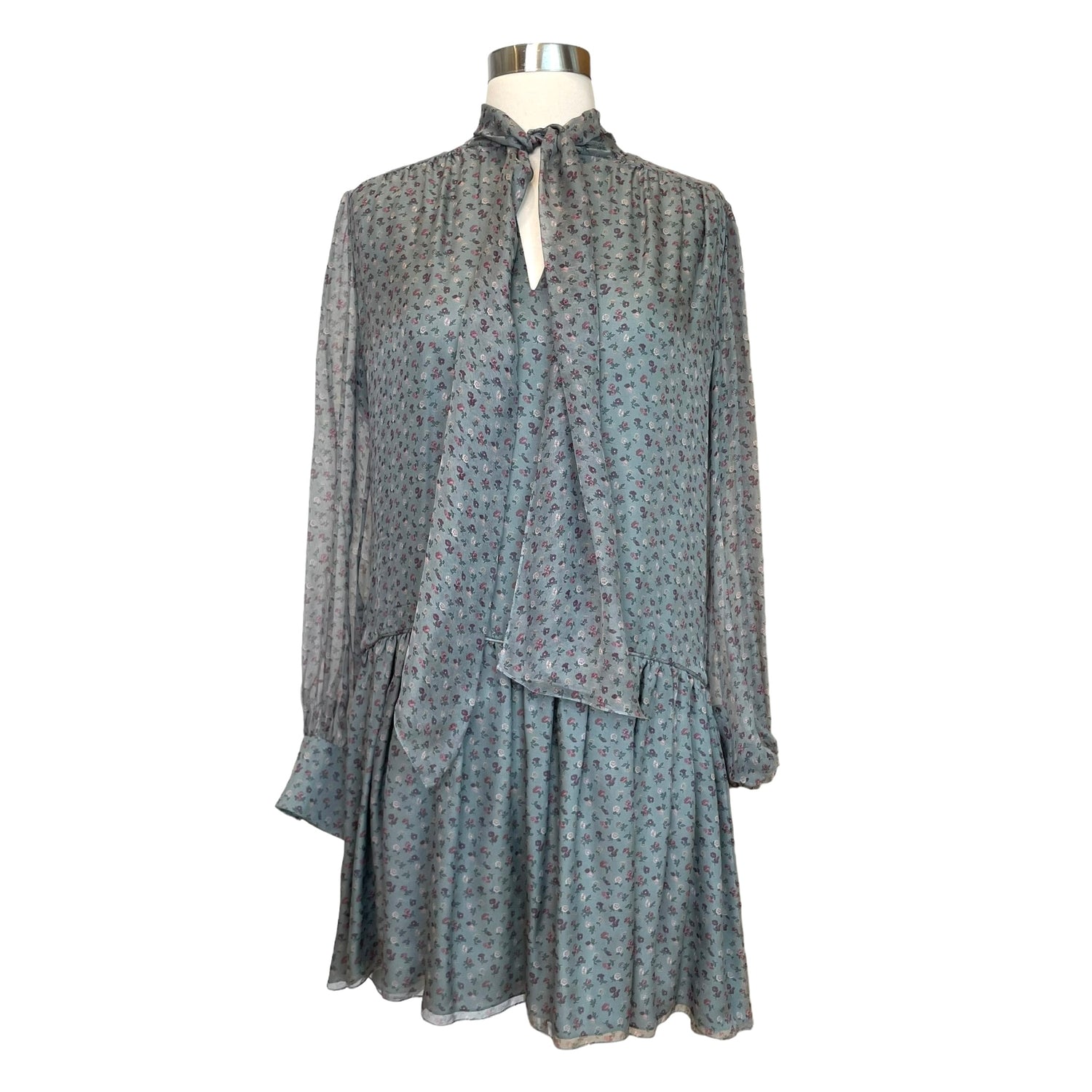Saint Laurent floral silk dress. Tie at neck. Sheer long sleeves. Lined. Designer size 40.