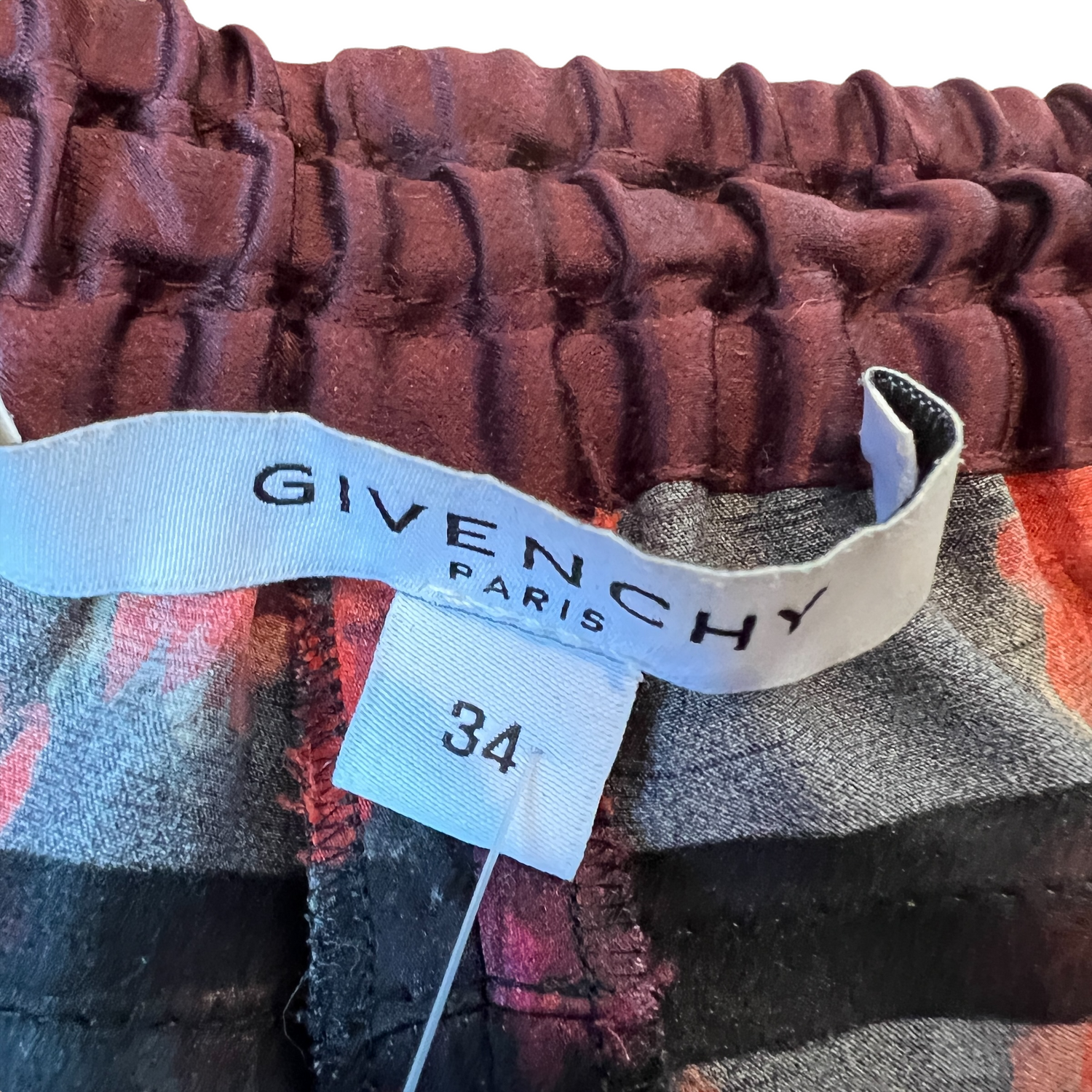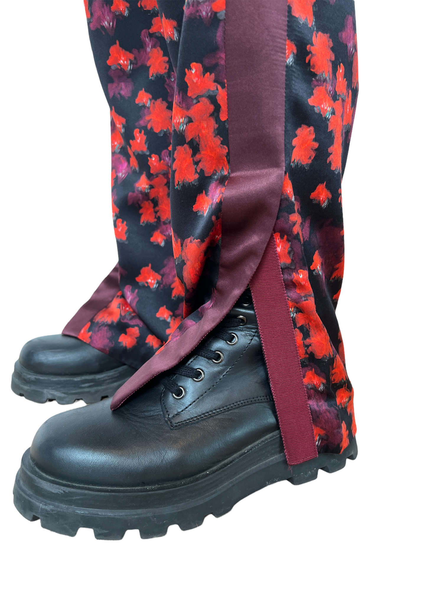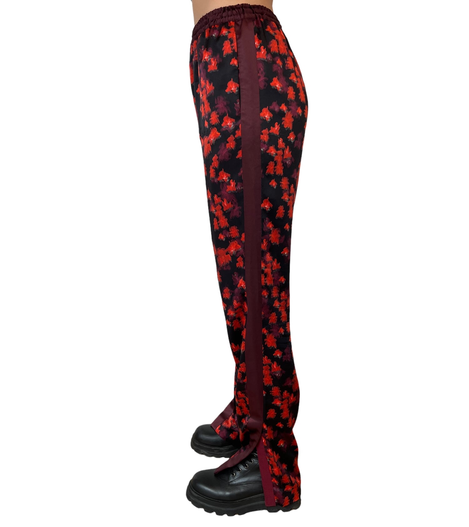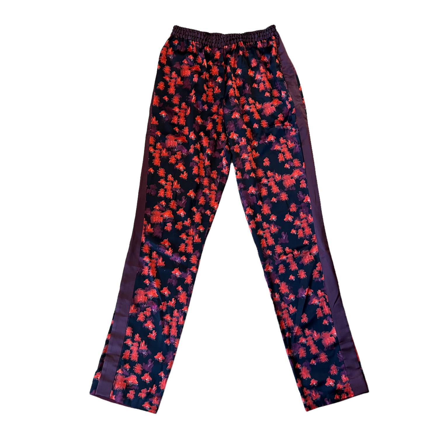 Black and Red flowery silk pants. Gros grain detail at sides. Two pockets. Slits at the bottom for added swag! Elasticised waistband. Designer size 34.