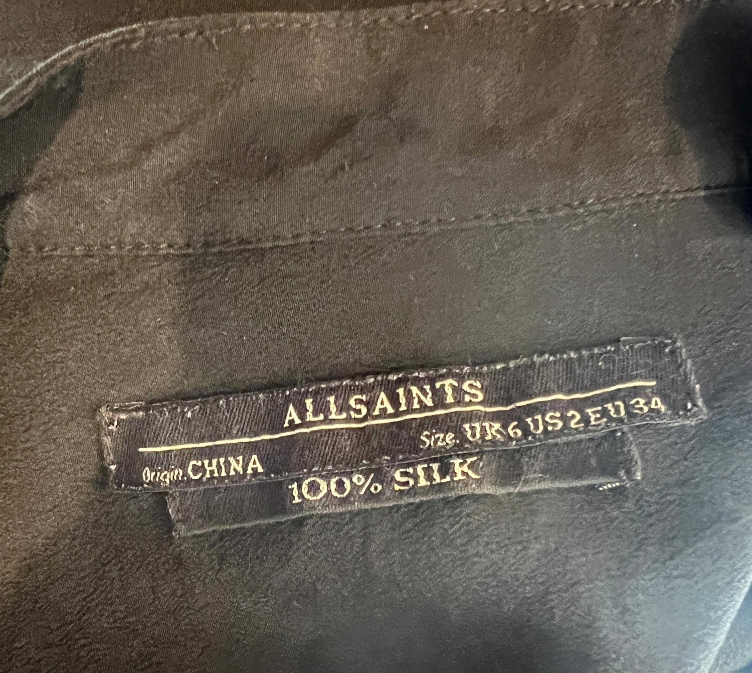 This is a button up shirt with concealed buttons except from the top button which is in silver for a nice rock'n'roll detail from British brand All Saints.