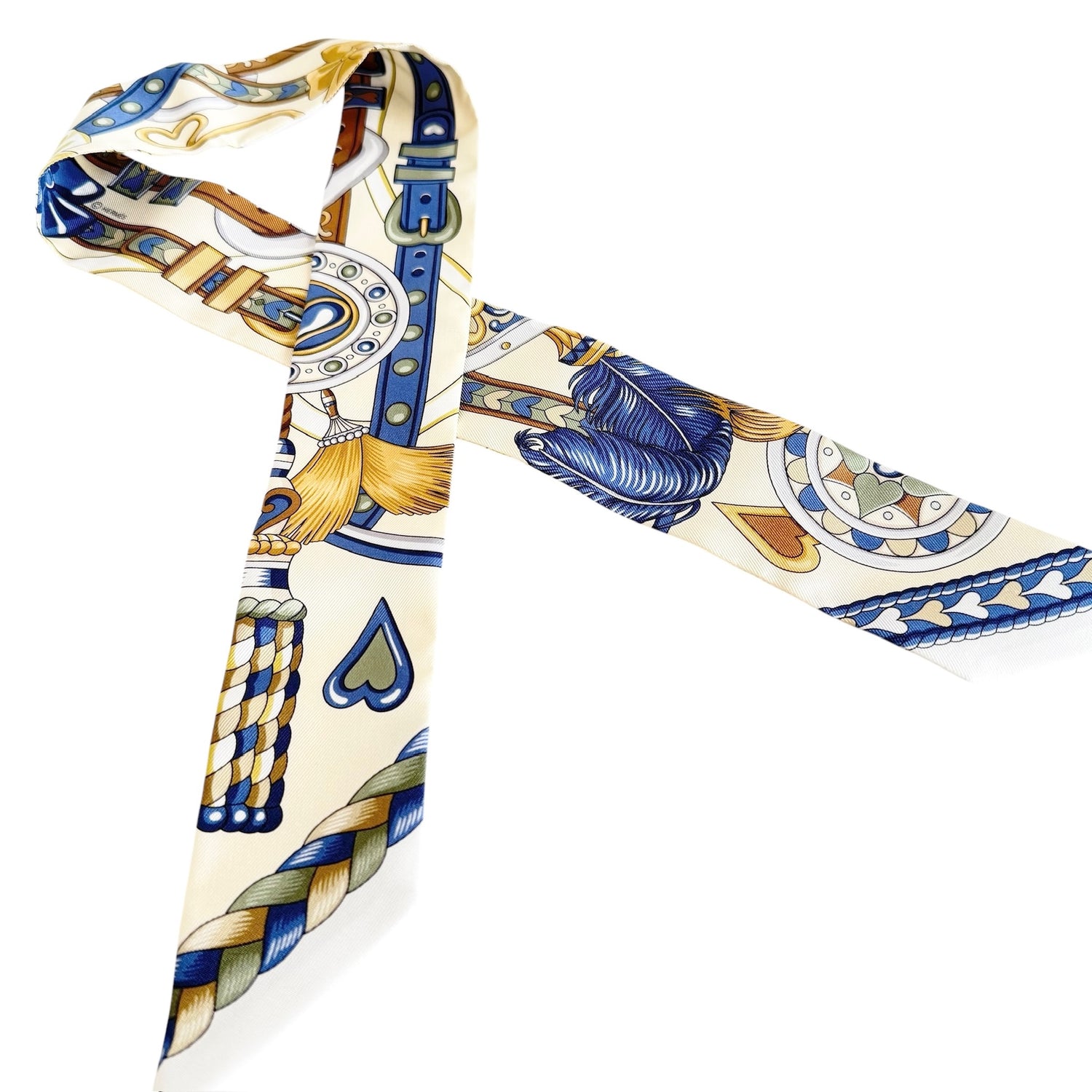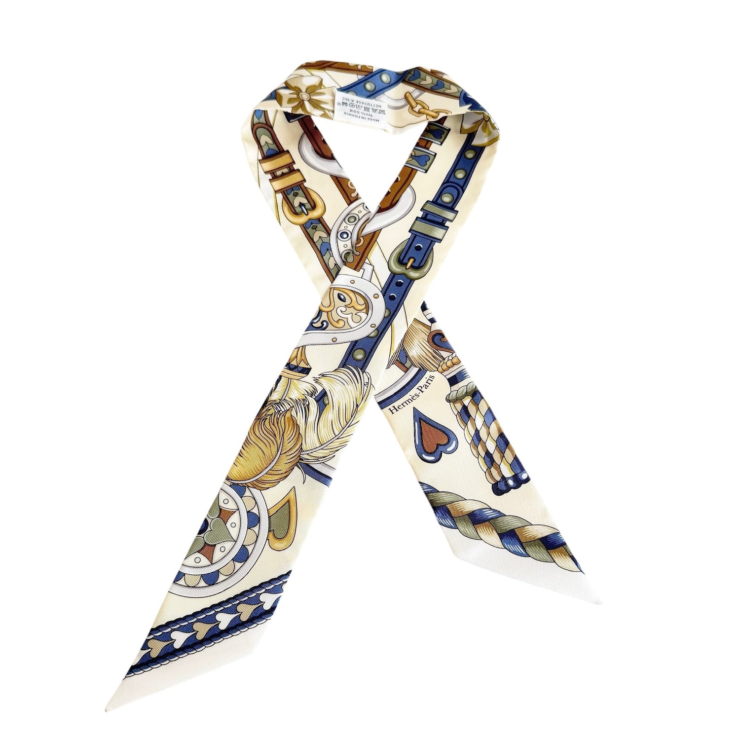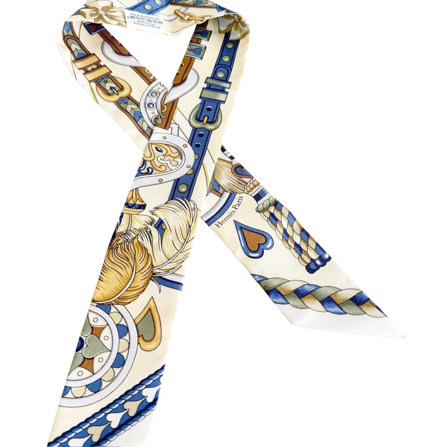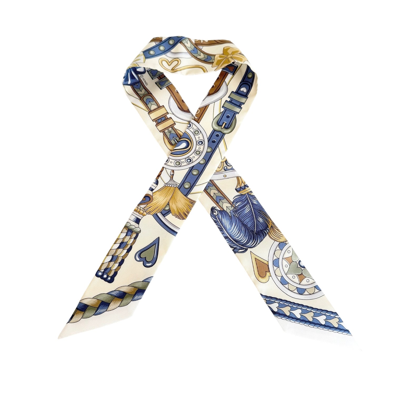 Hermes twilly silk scarf. Blue, beige and cream print.