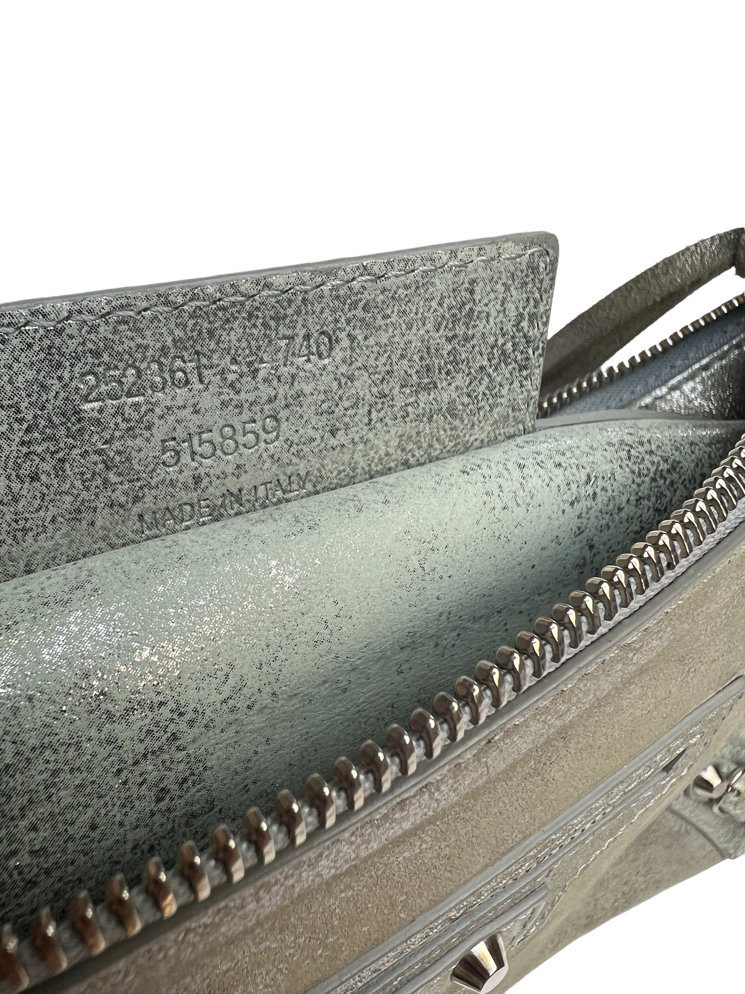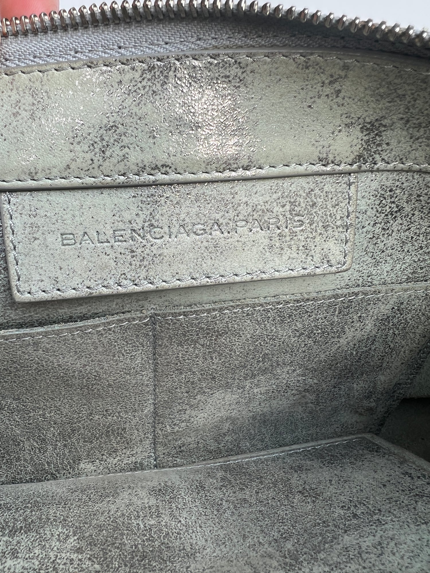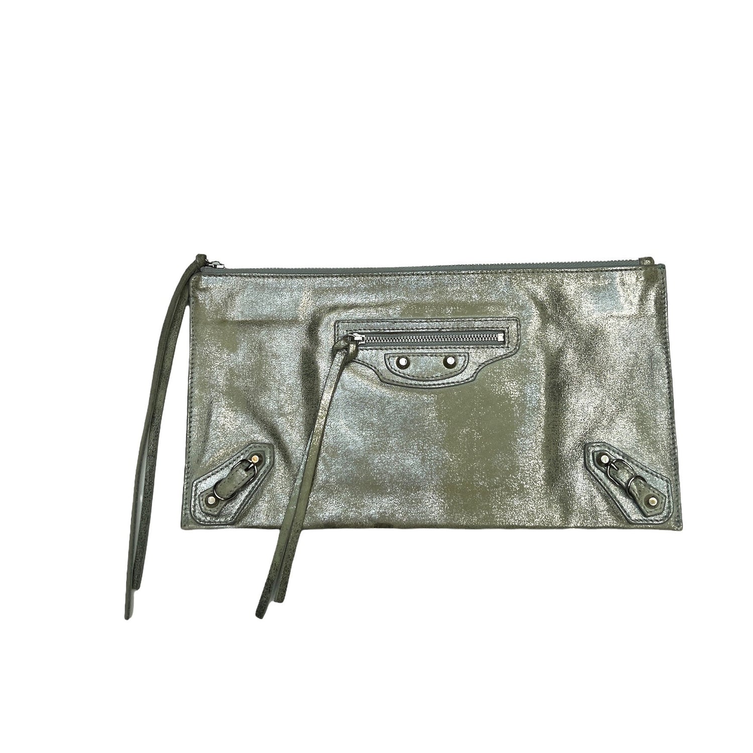 Balenciaga brushed and shiny leather. Inside dual card pockets and outside zipper pocket. Silver-tone hardware. Great piece for any occasion!