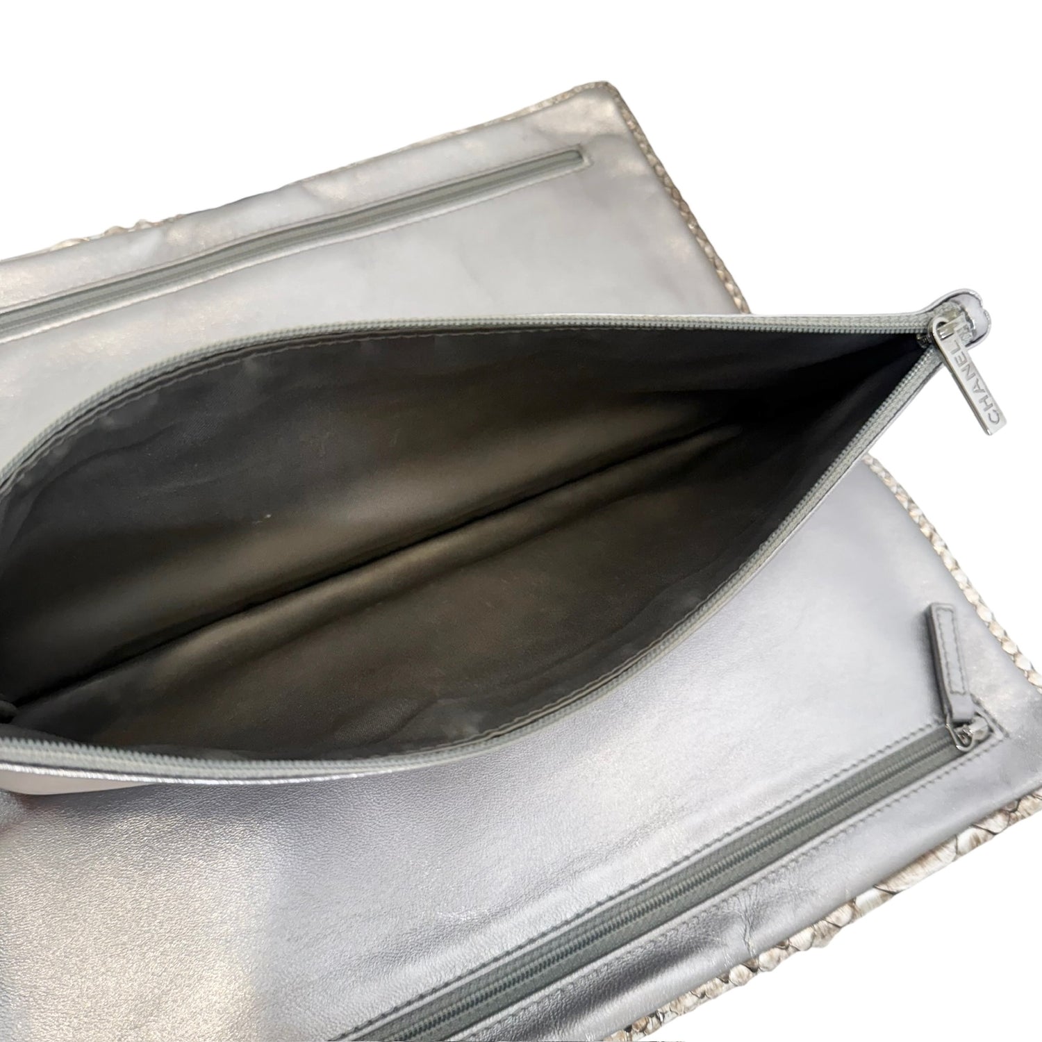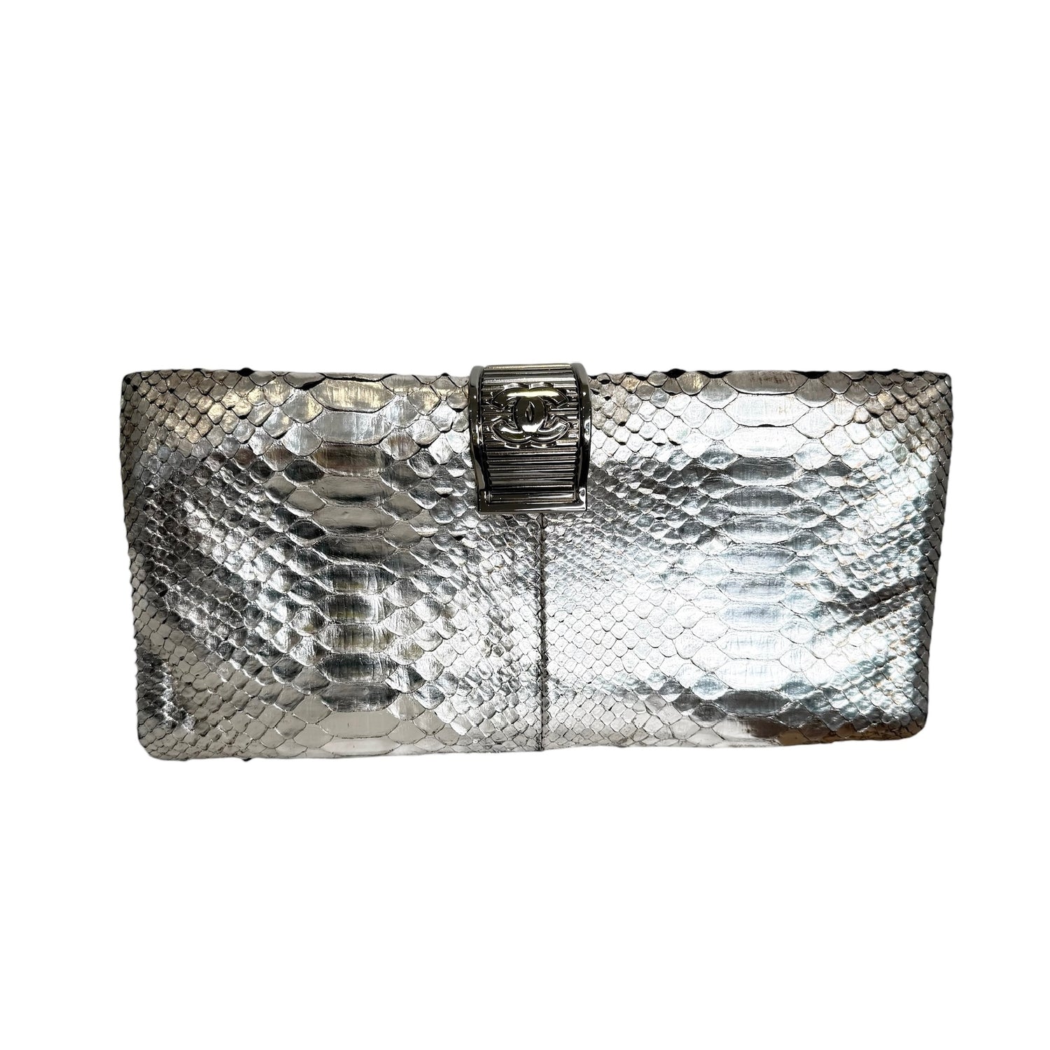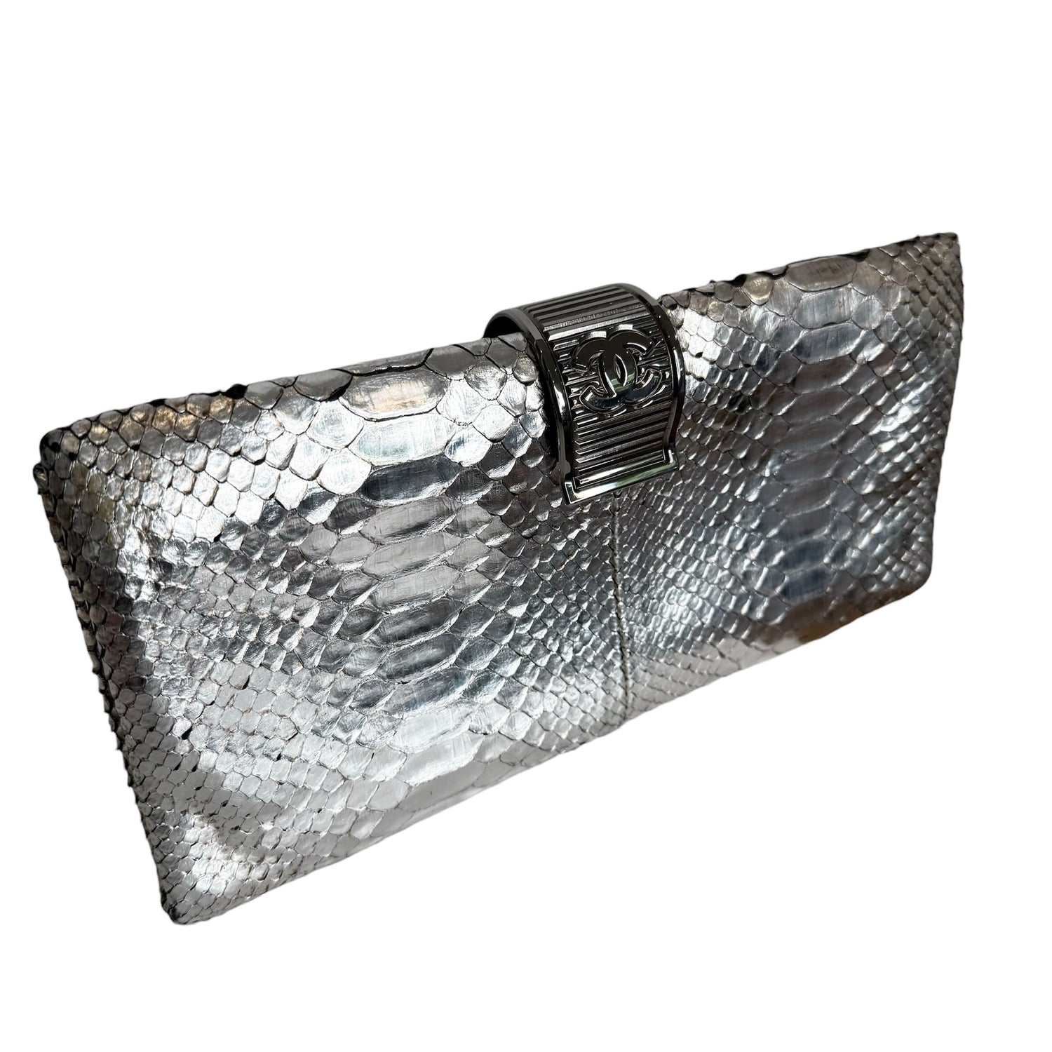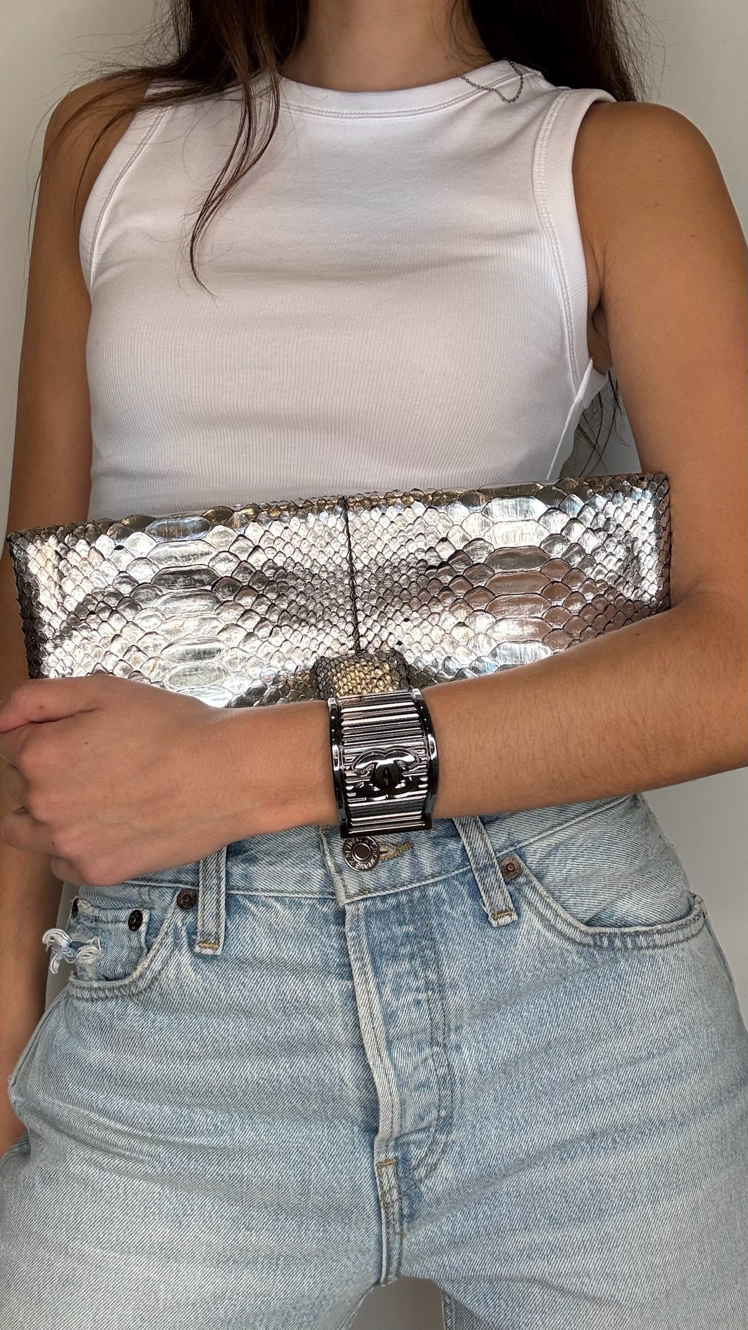Chanel silver python bracelet clutch. Metal CC logo bracelet closure. Multiple zipper pockets. Silver lambskin leather.