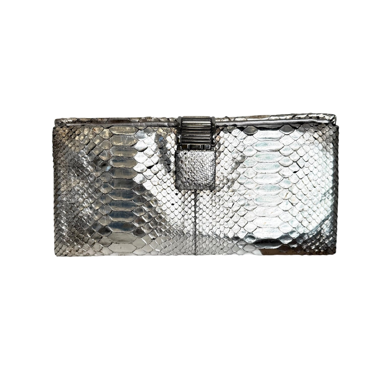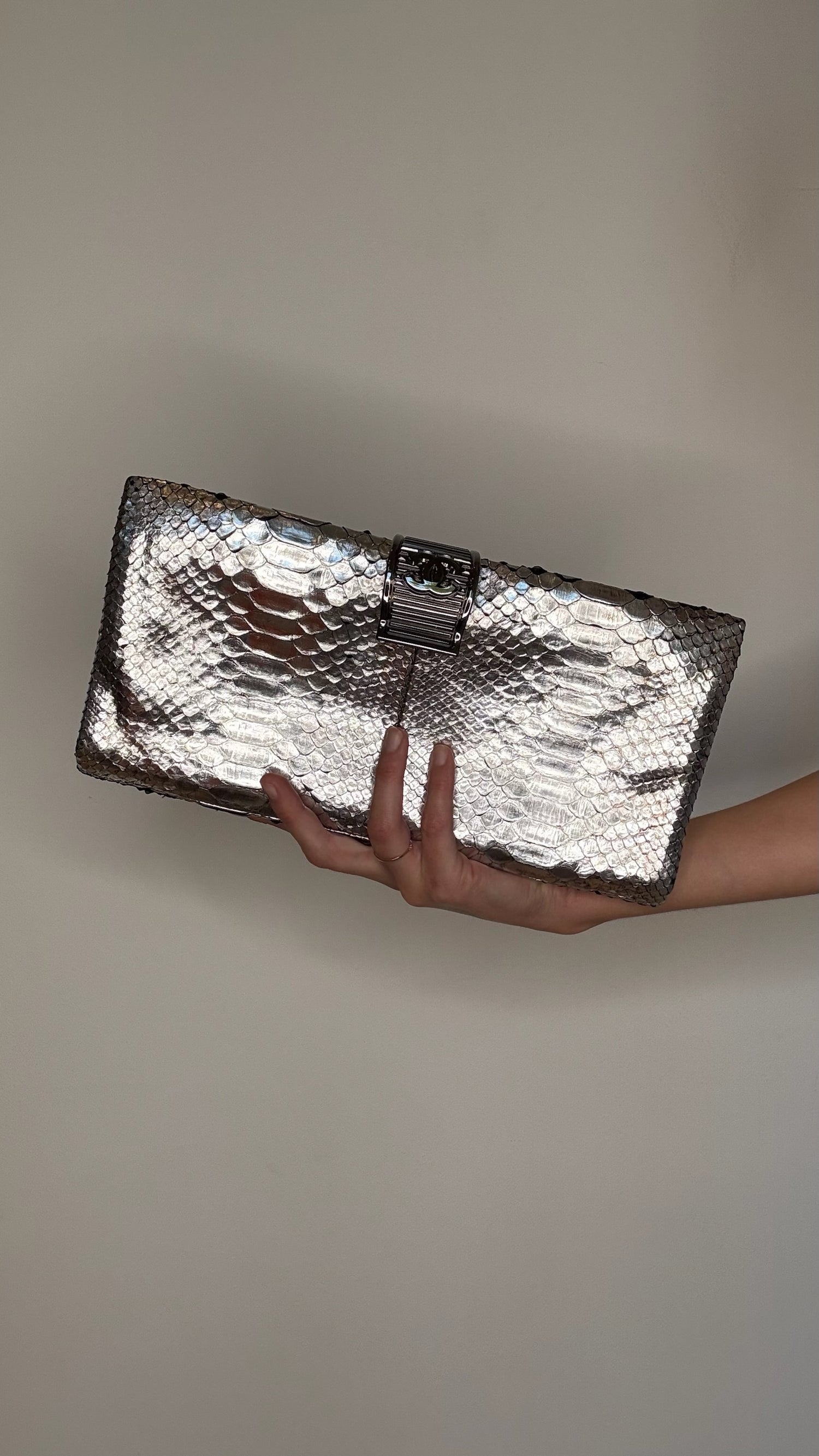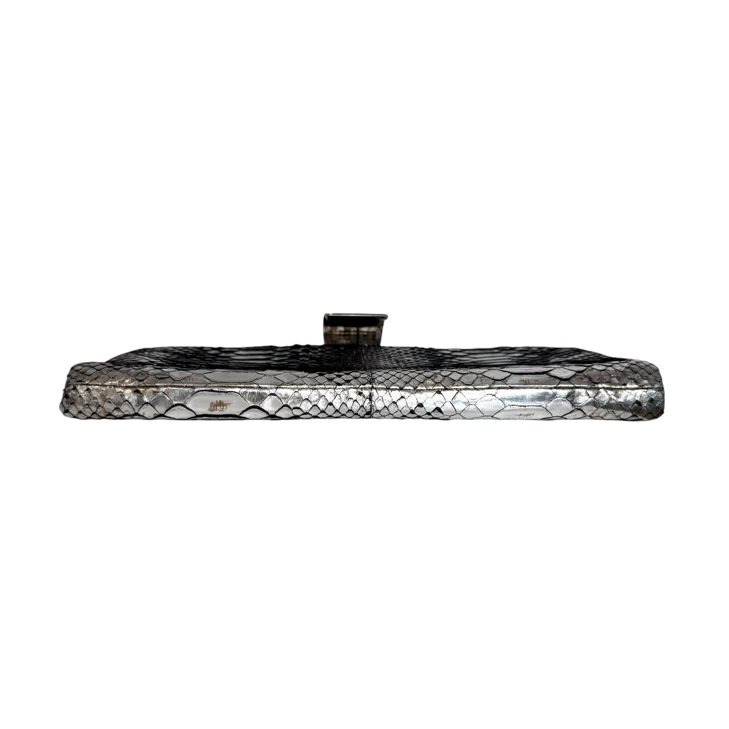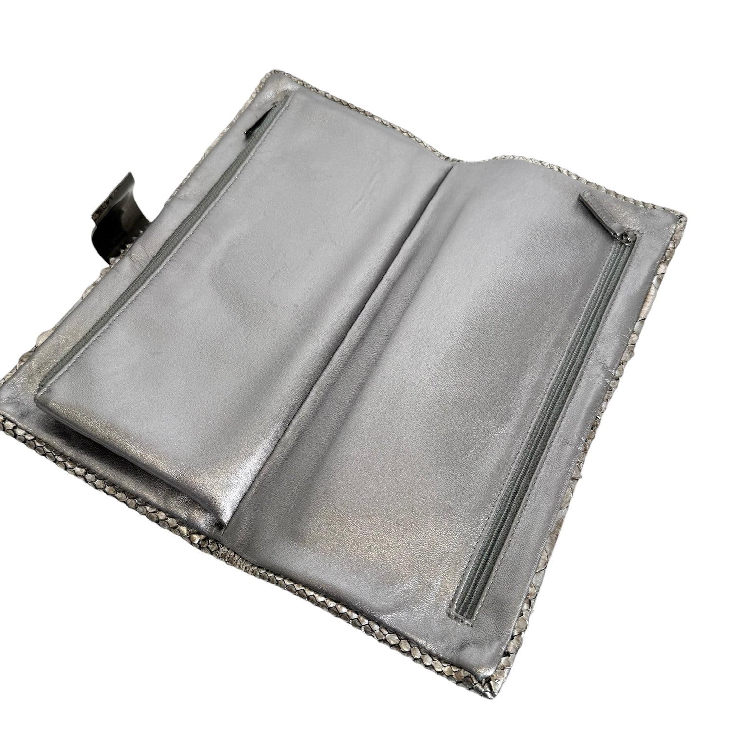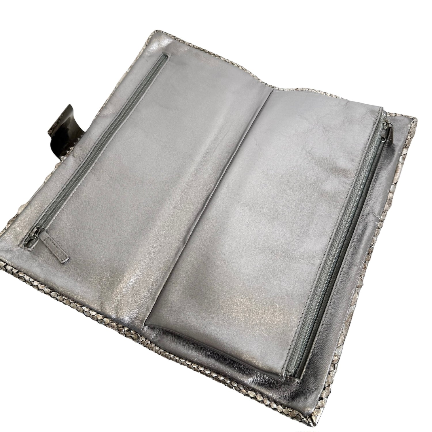 Chanel silver python bracelet clutch. Metal CC logo bracelet closure. Multiple zipper pockets. Silver lambskin leather.