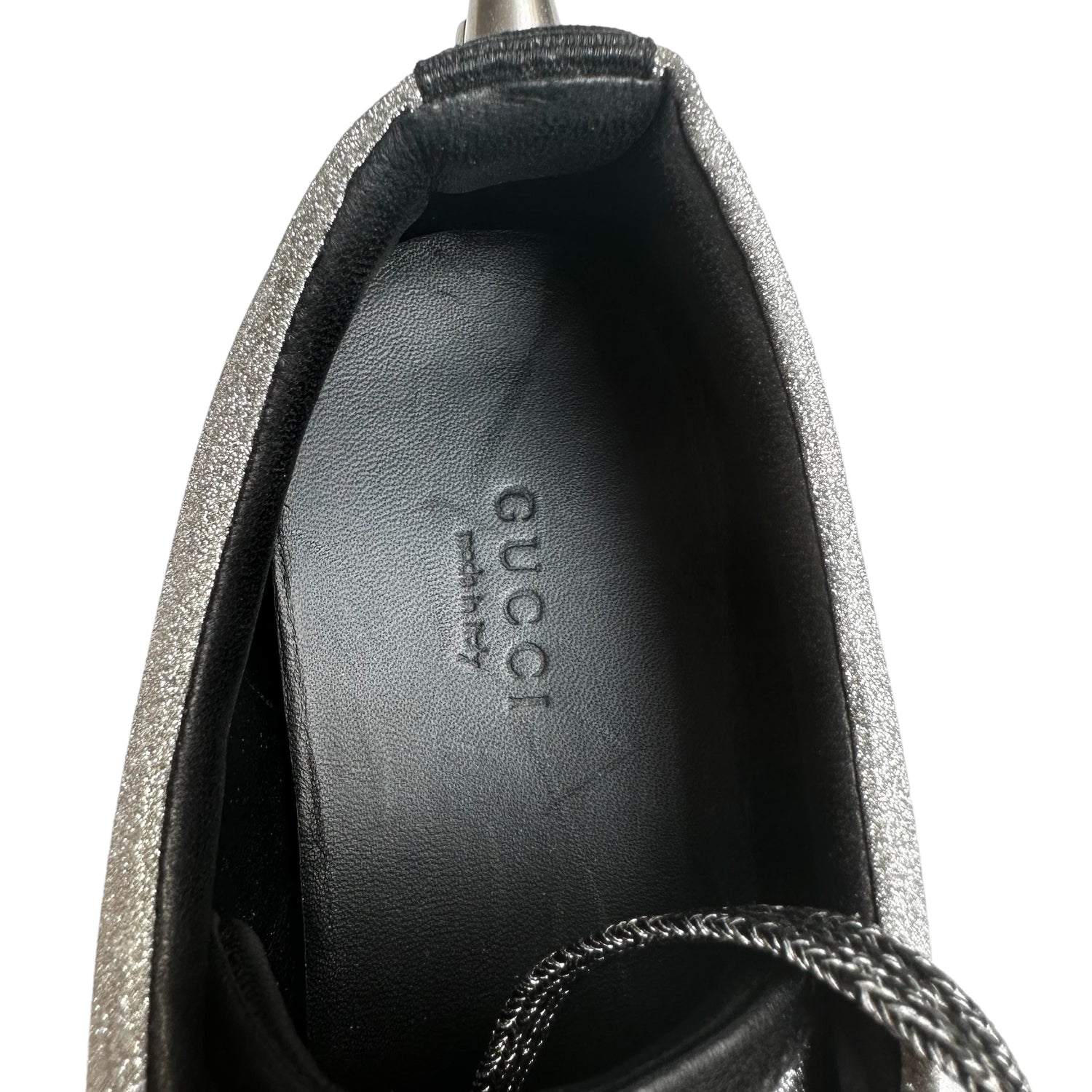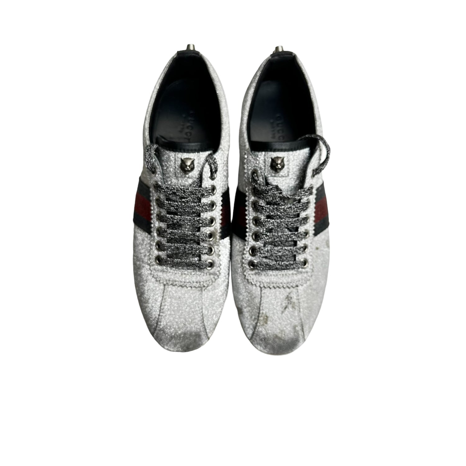 Gucci silver sparkles tennis shoes. Fun sneakers. Round toe. Iconic stripes at sides. Silver-tone studs at back. Laces closure at top. Cat embellishment at top. Designer size 40.