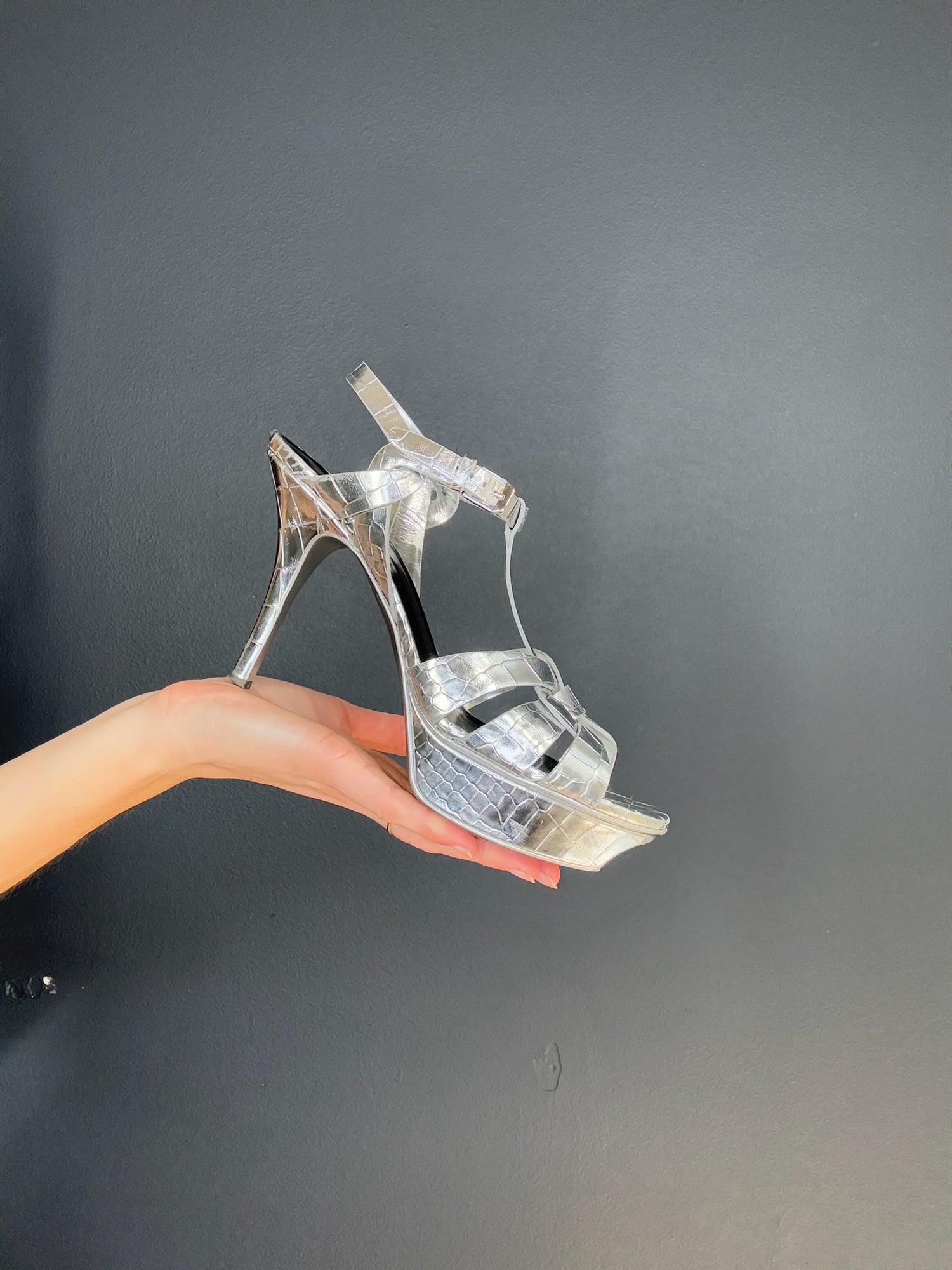 Yves Saint Laurent silver croc embossed iconic Tribute heels. Designer size 39.