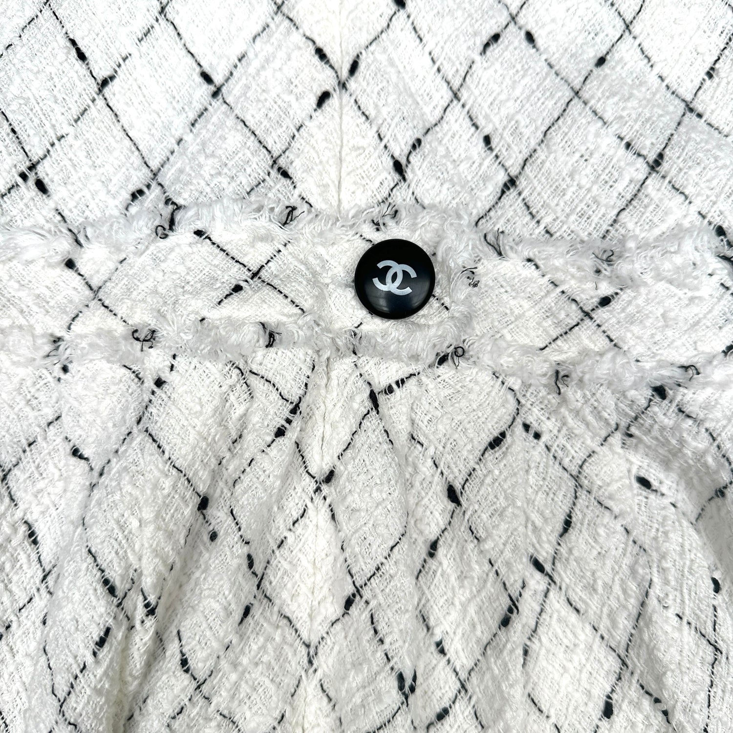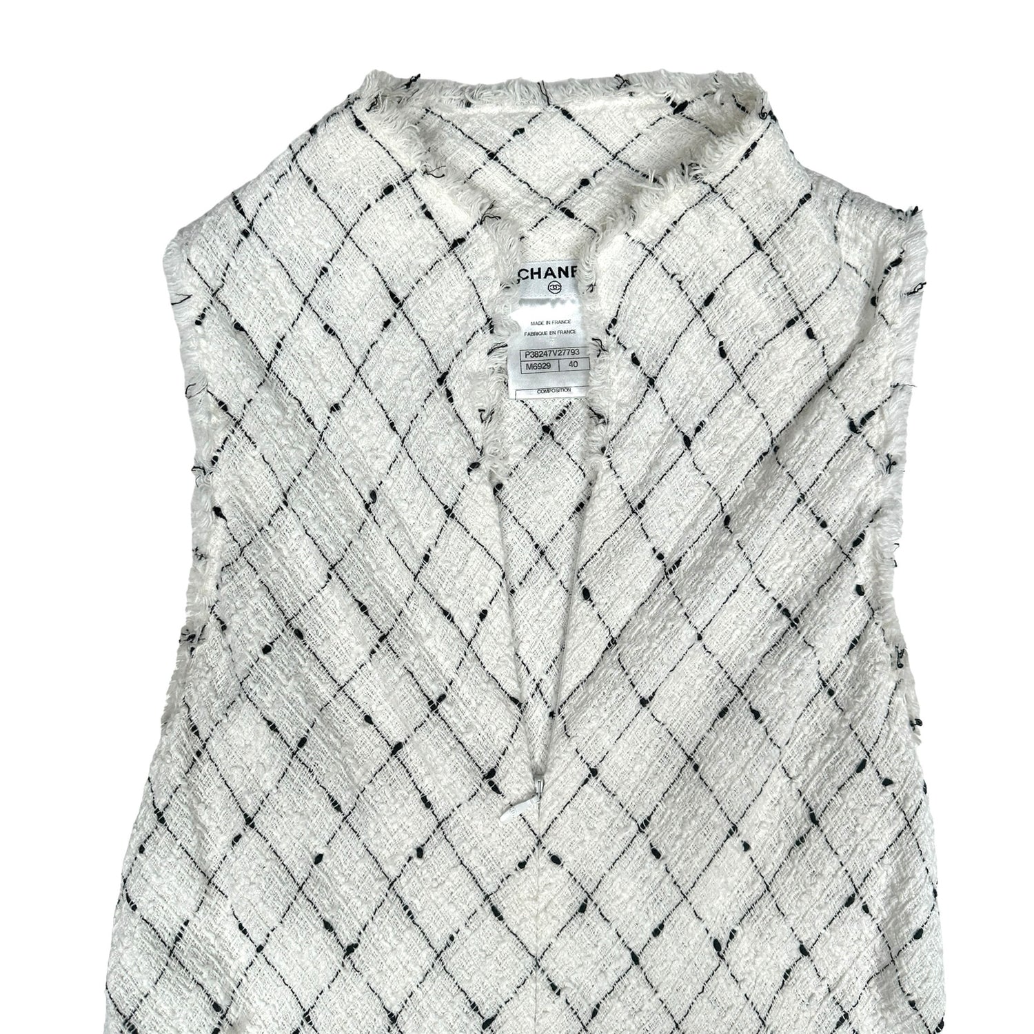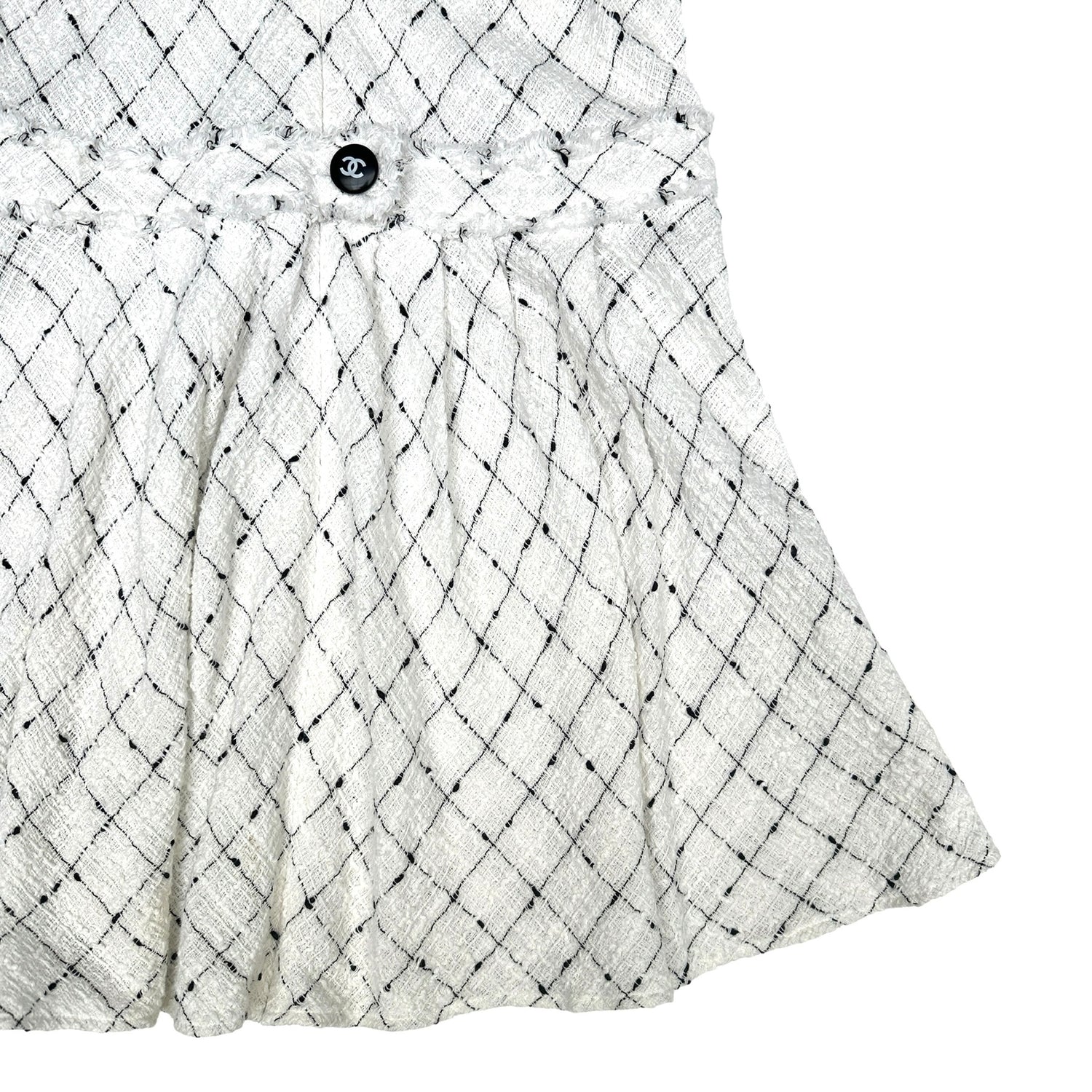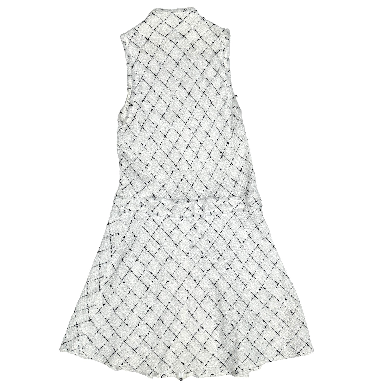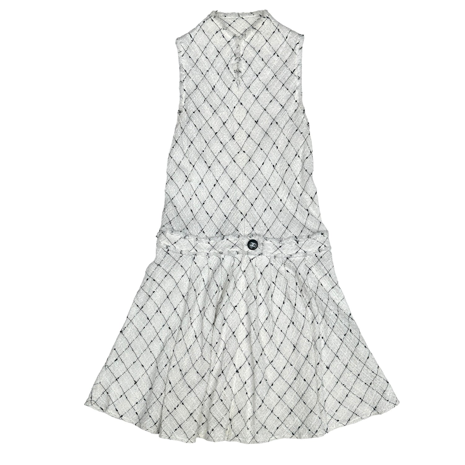 Chanel white tweed dress with iconic diamond pattern throughout. Sleeveless. V-neck. Concealed zipper closures. Stand alone collar. CC logo black button detail at front. Pleated skirt. Very chic and easily paired with a black long sleeves T-shirt underneath and combat boots. Designer size 40.