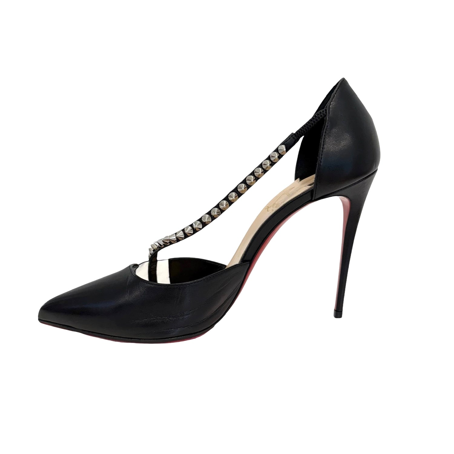 Christian Louboutin black heels. Spike embellishments in silver hardware. Pointed toe. Clear acrylic detail. Designer size 39.5