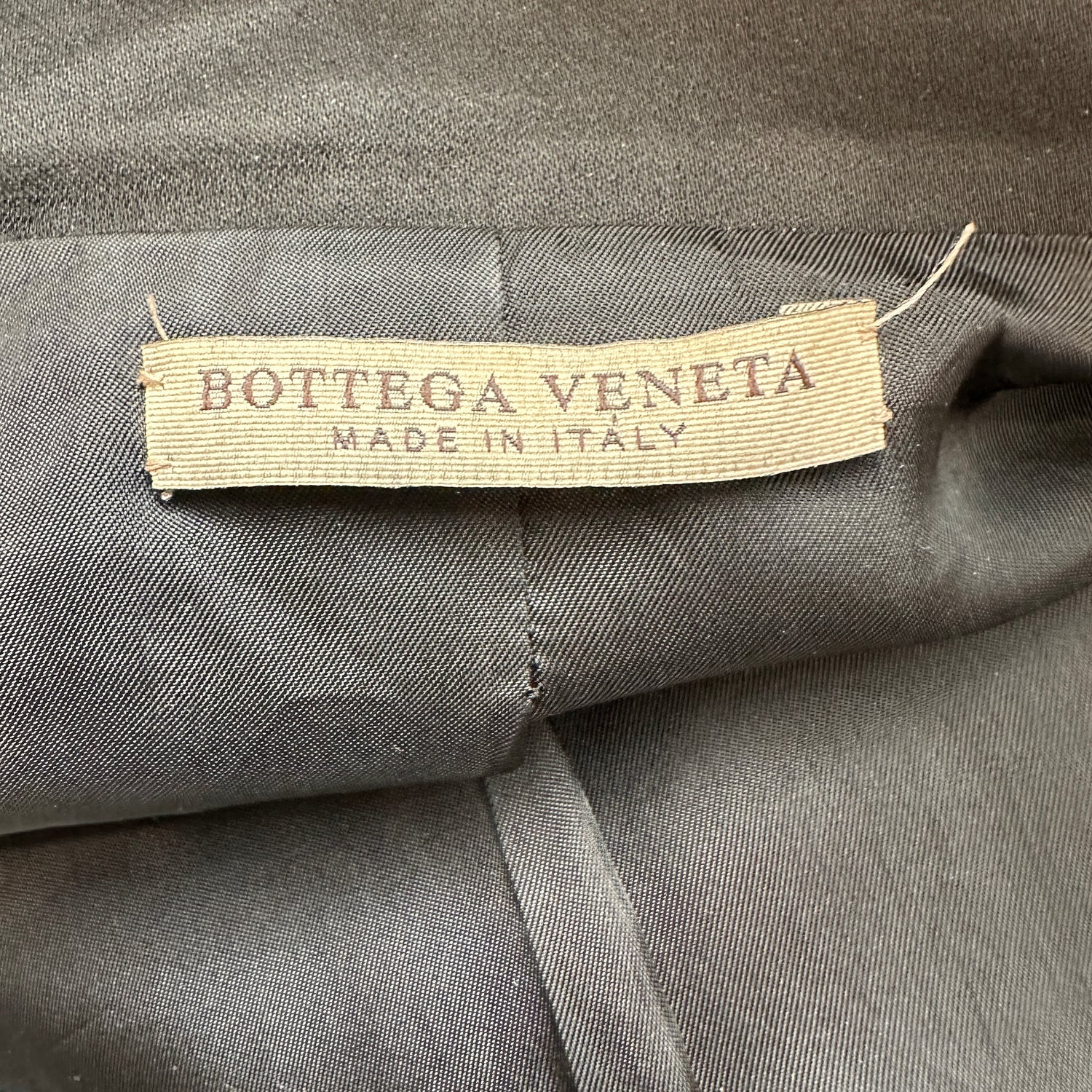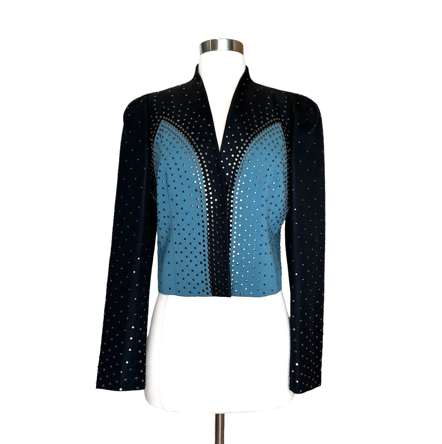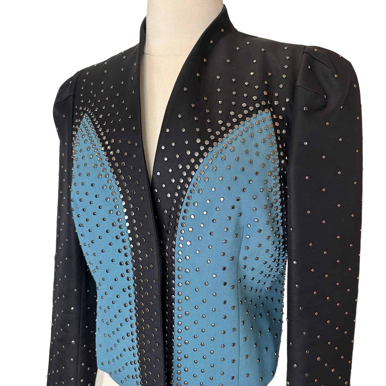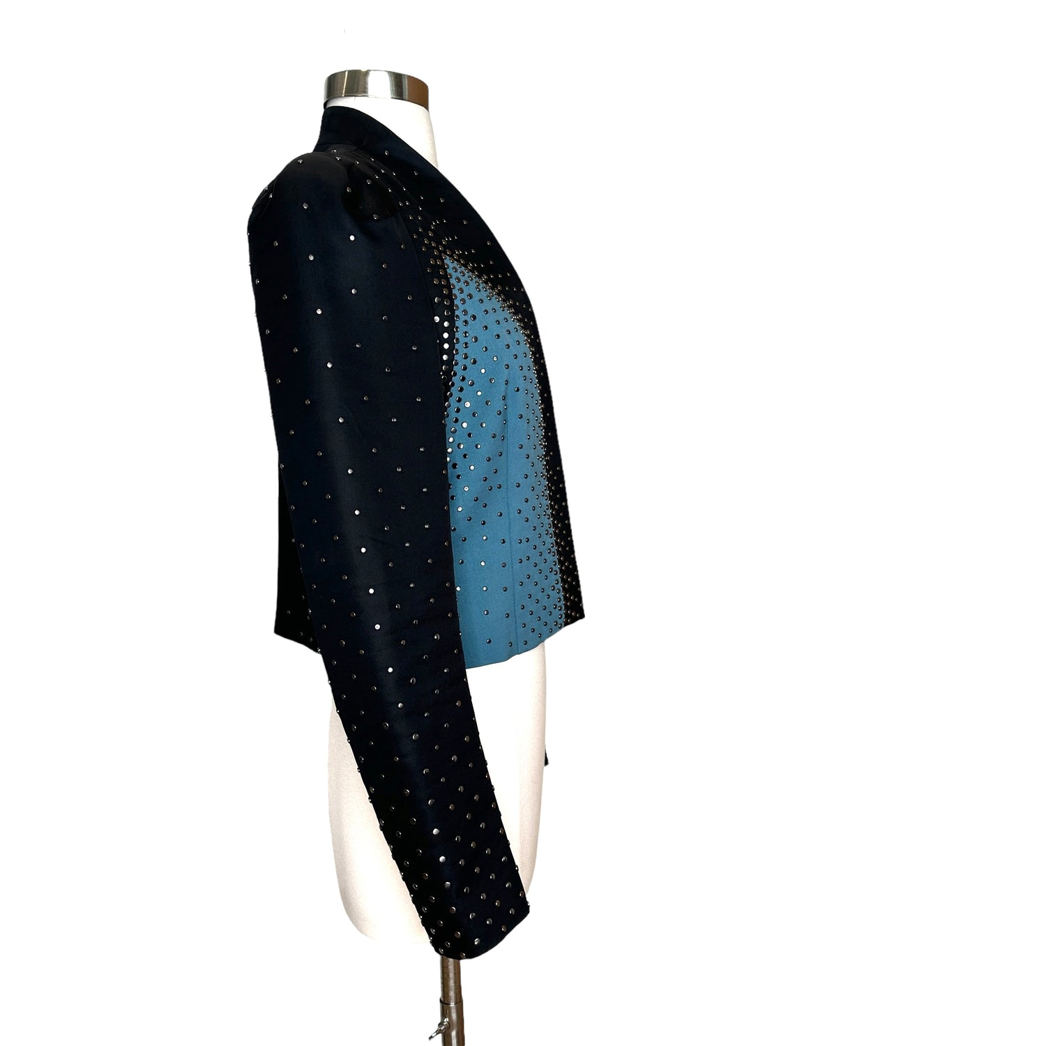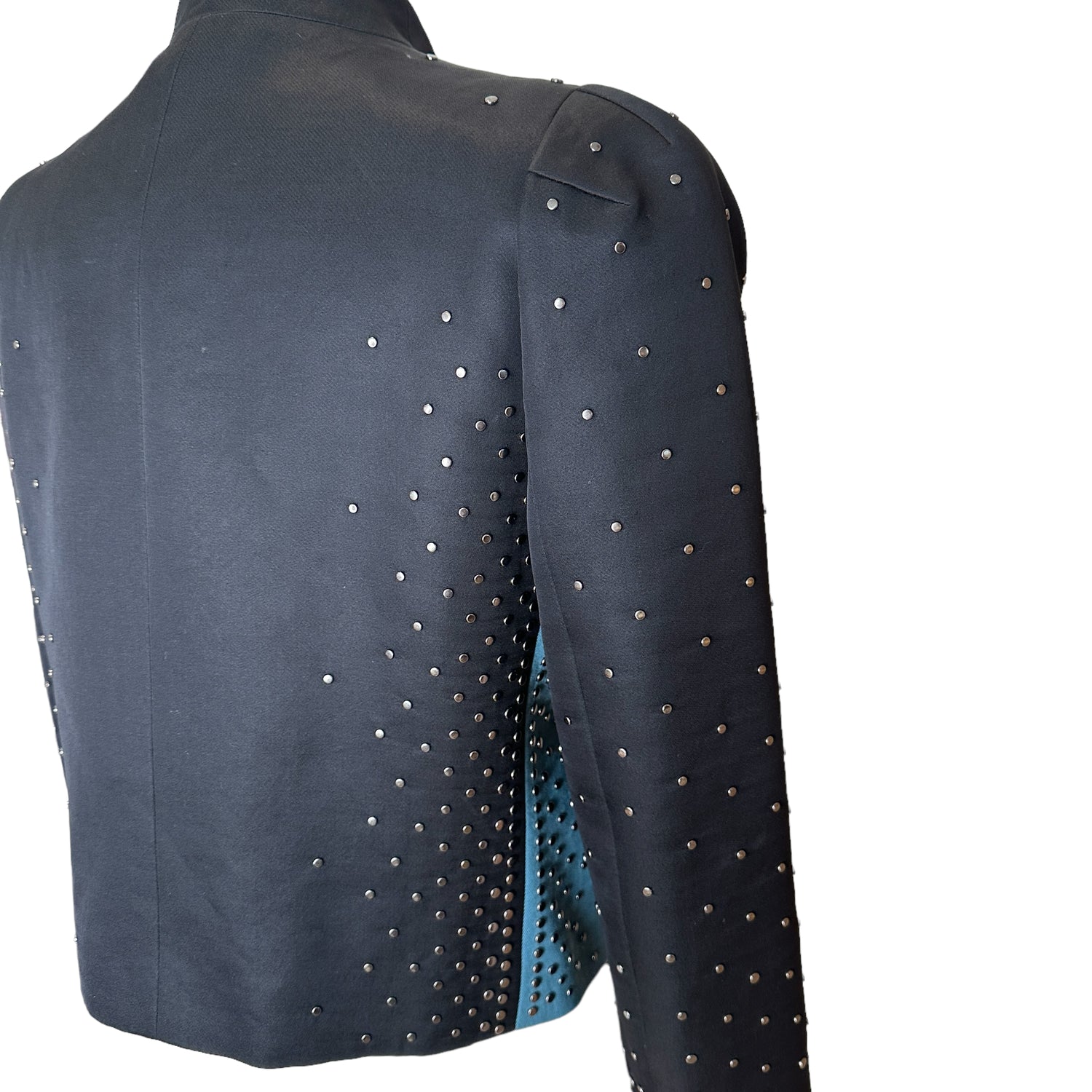 Bottega Veneta blazer. Black and blue with silver studs. Snap on button closure at front. Lightly raised shoulders. No collar. Designer size 42.