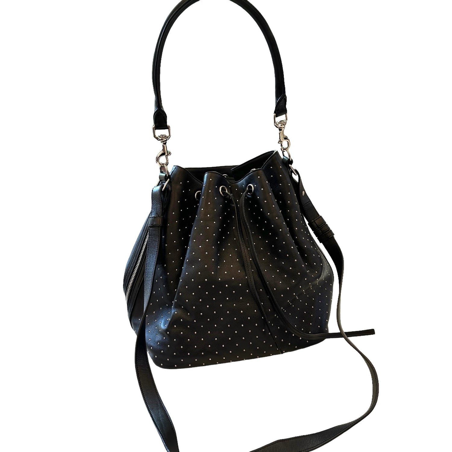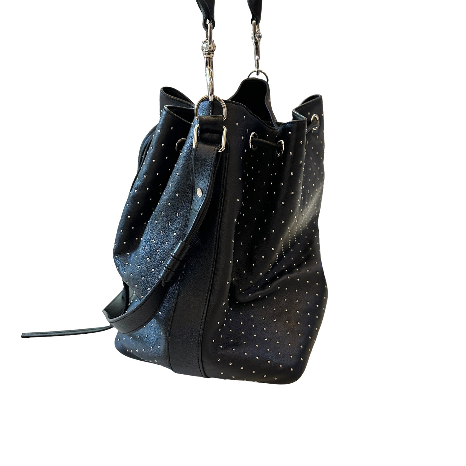 Saint Laurent black leather bucket bag with mini silver studs throughout. Drawstring closure at top. One top rolled handle and one adjustable leather strap to be worn as a crossbody. Both straps are removable. Large zipper at both sides. Silver-tone hardware. Suede lining. Protective feet at base.