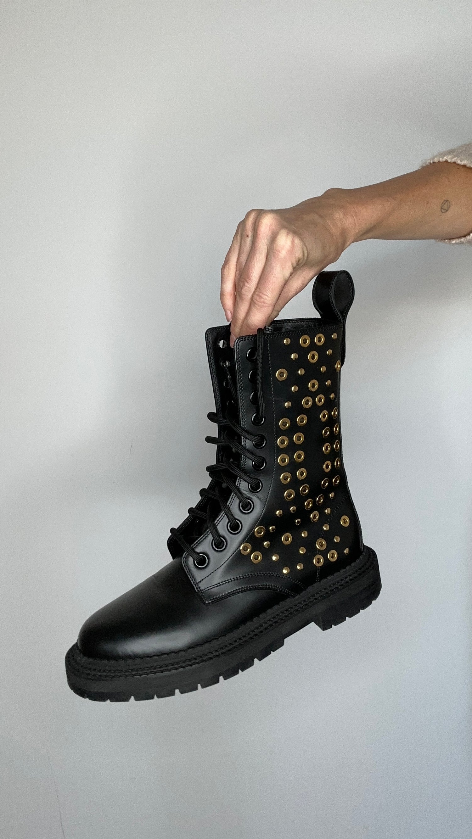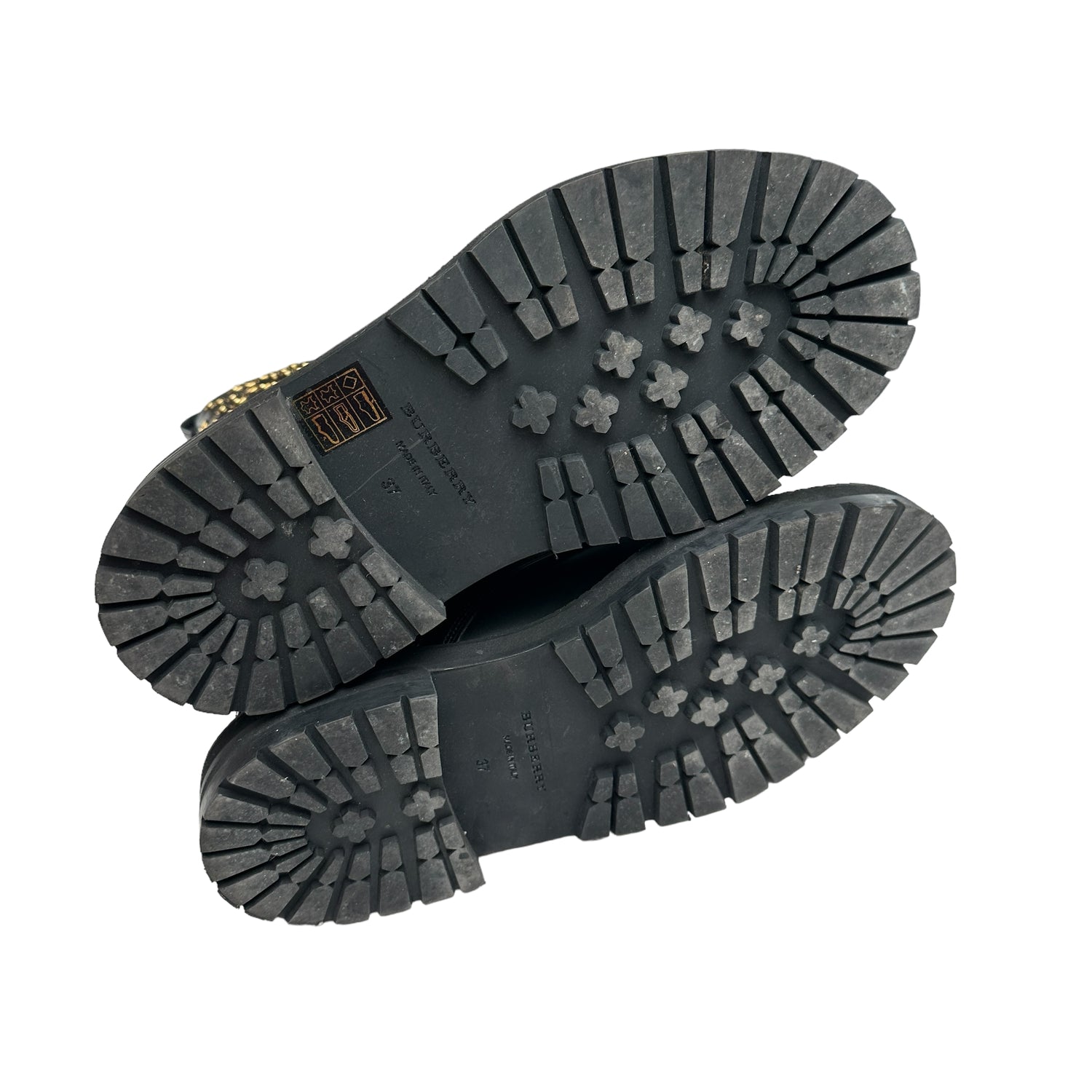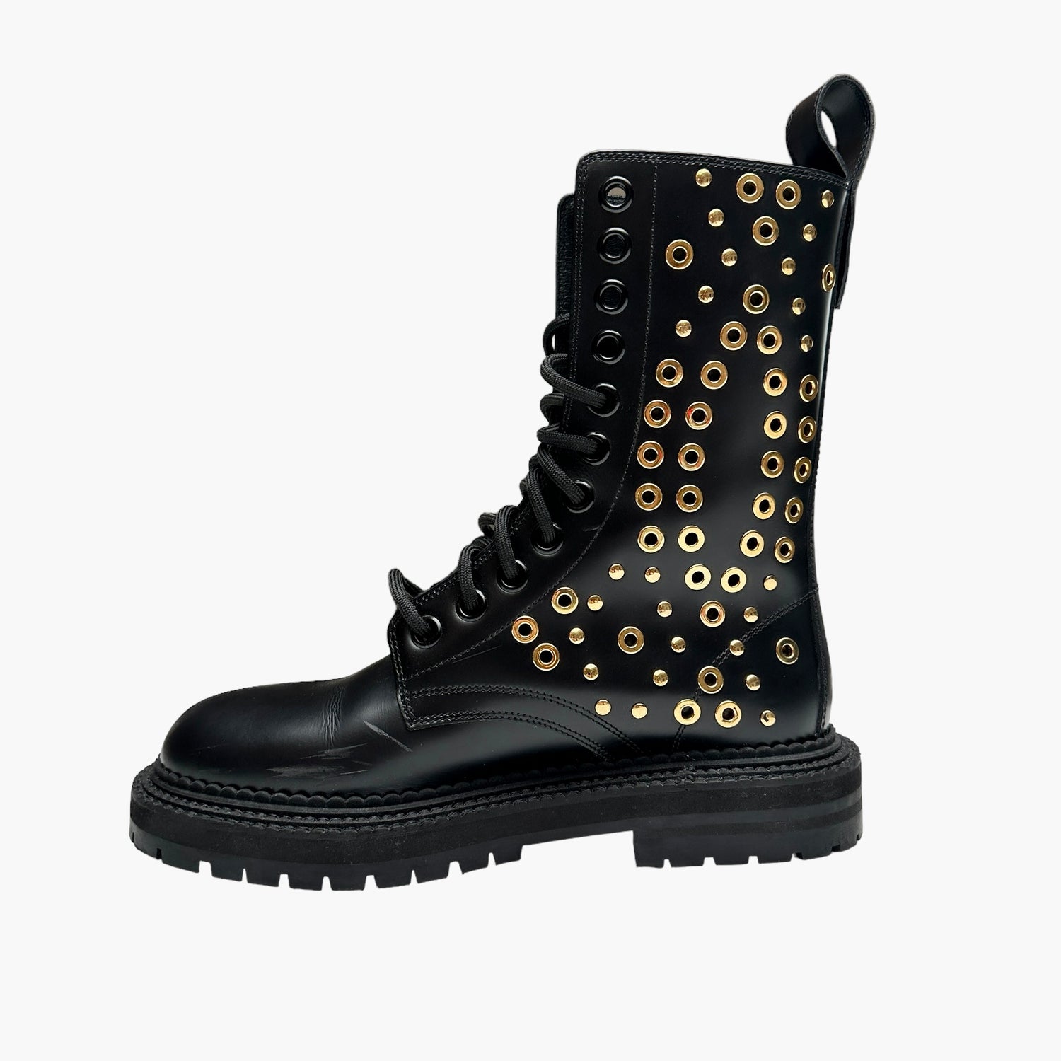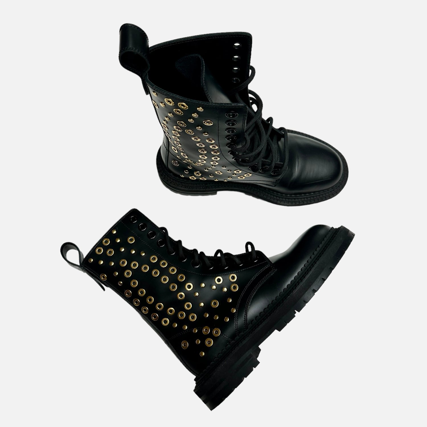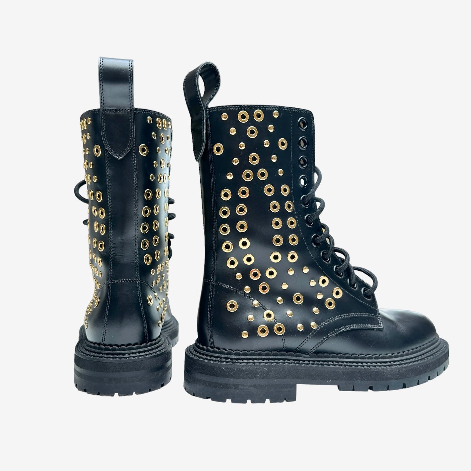 Burberry black leather combat boots with gold-tone eyelets throughout. Laces closure at front. Designer size 37.