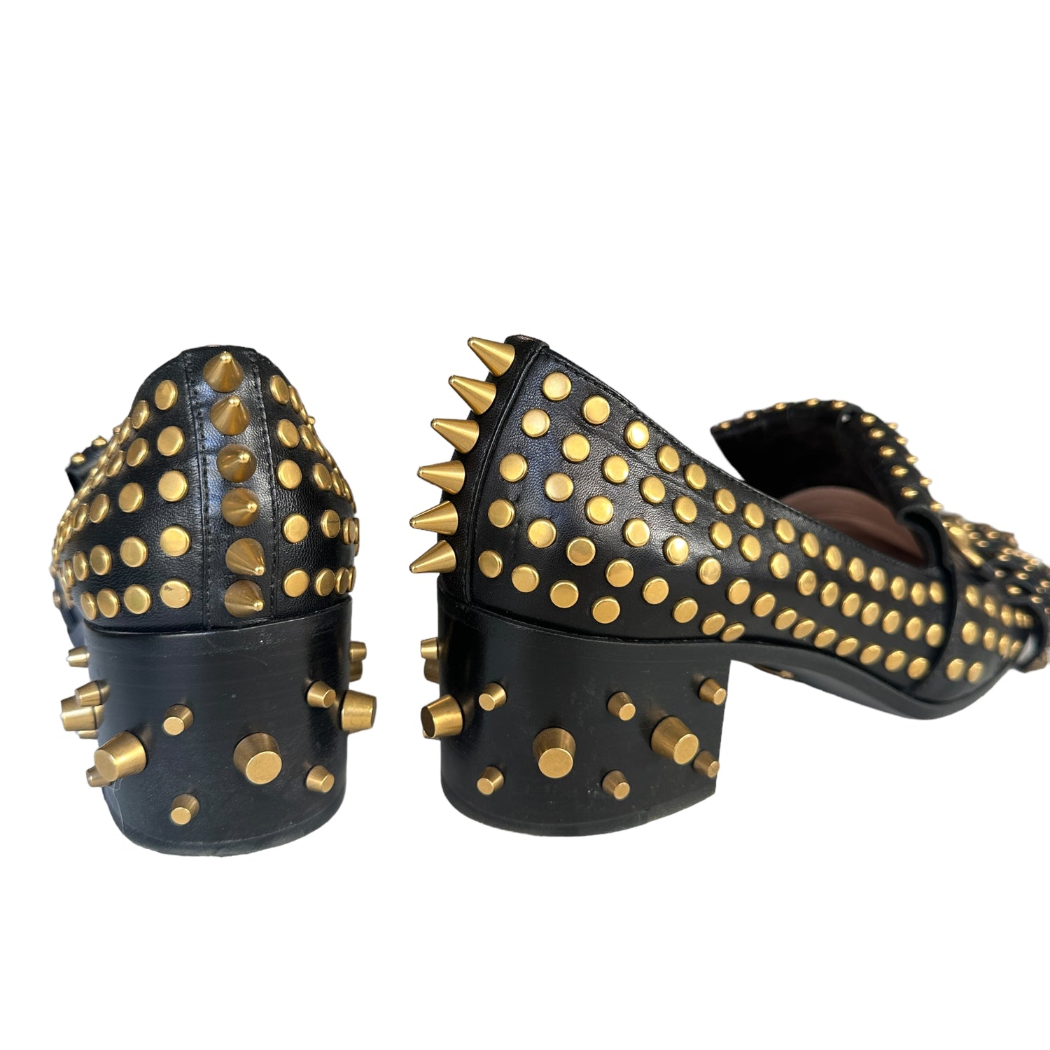 Gucci studded loafers. Block heels. Gold-tone hardware. Round square toe. Iconic horse-bite at top. Designer size 37.5.
