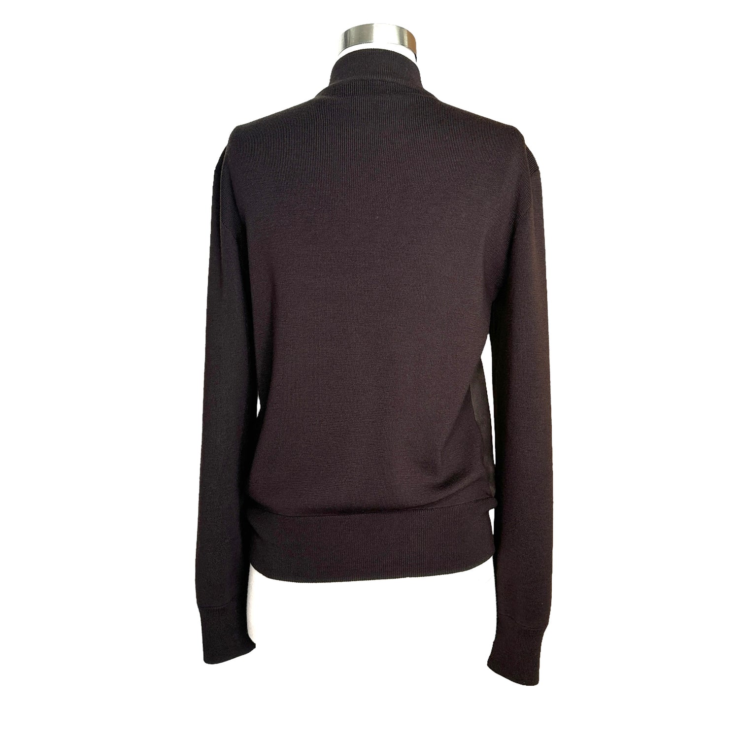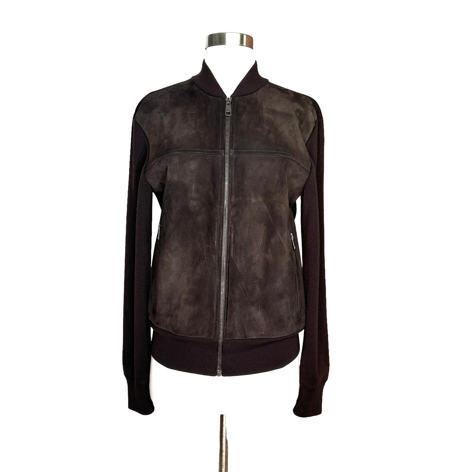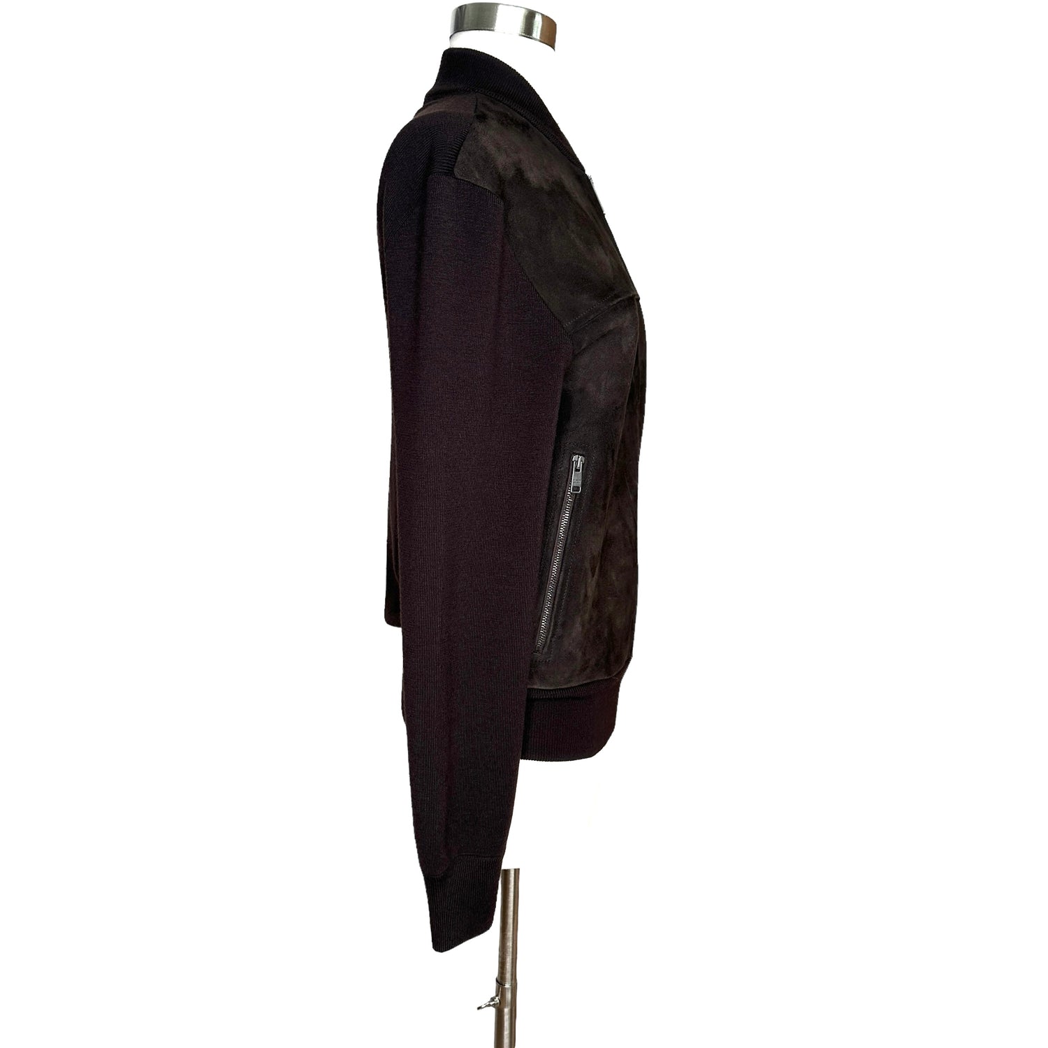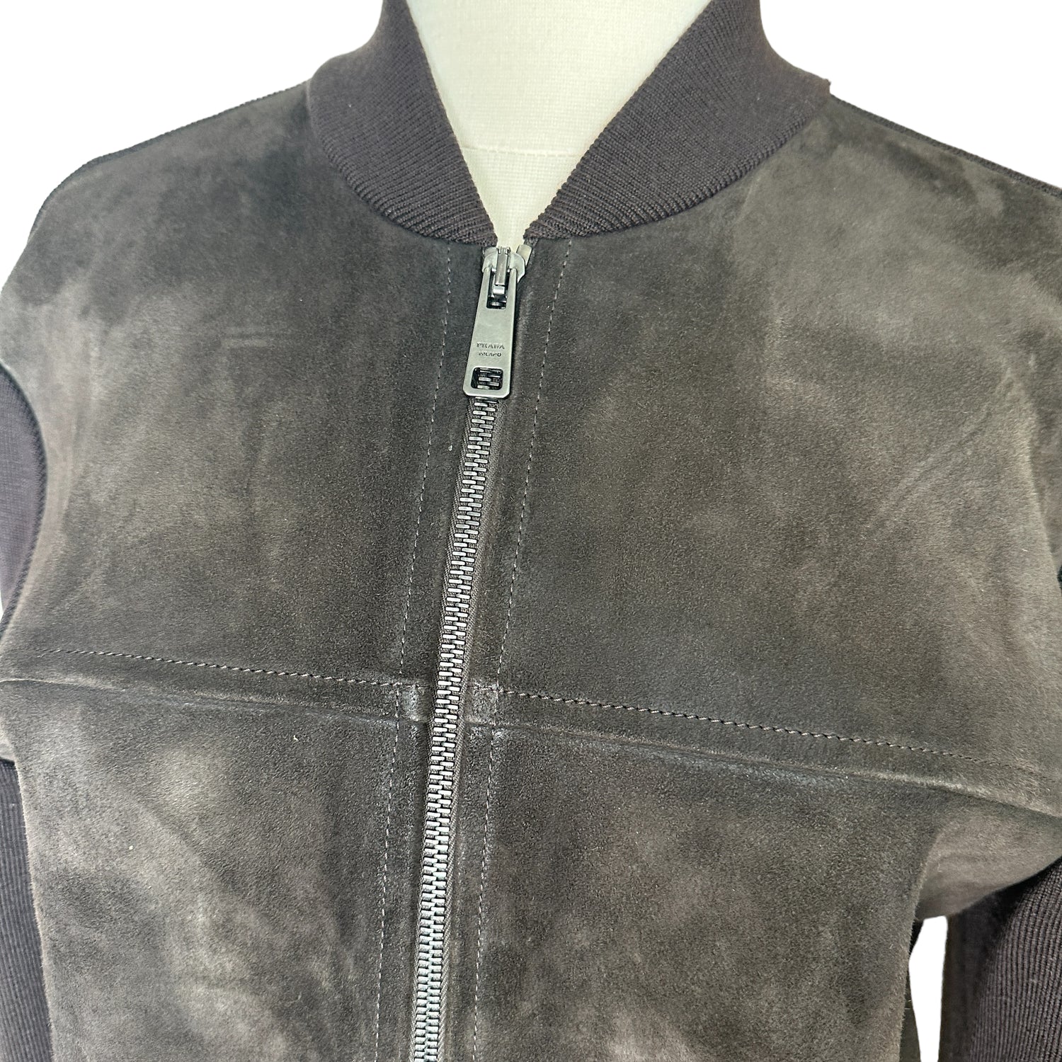 Prada brown jacket with brown suede at front. Deep chocolate brown color. Zipper closure at front. Stand alone collar. Two zipper pockets. Designer size 46.