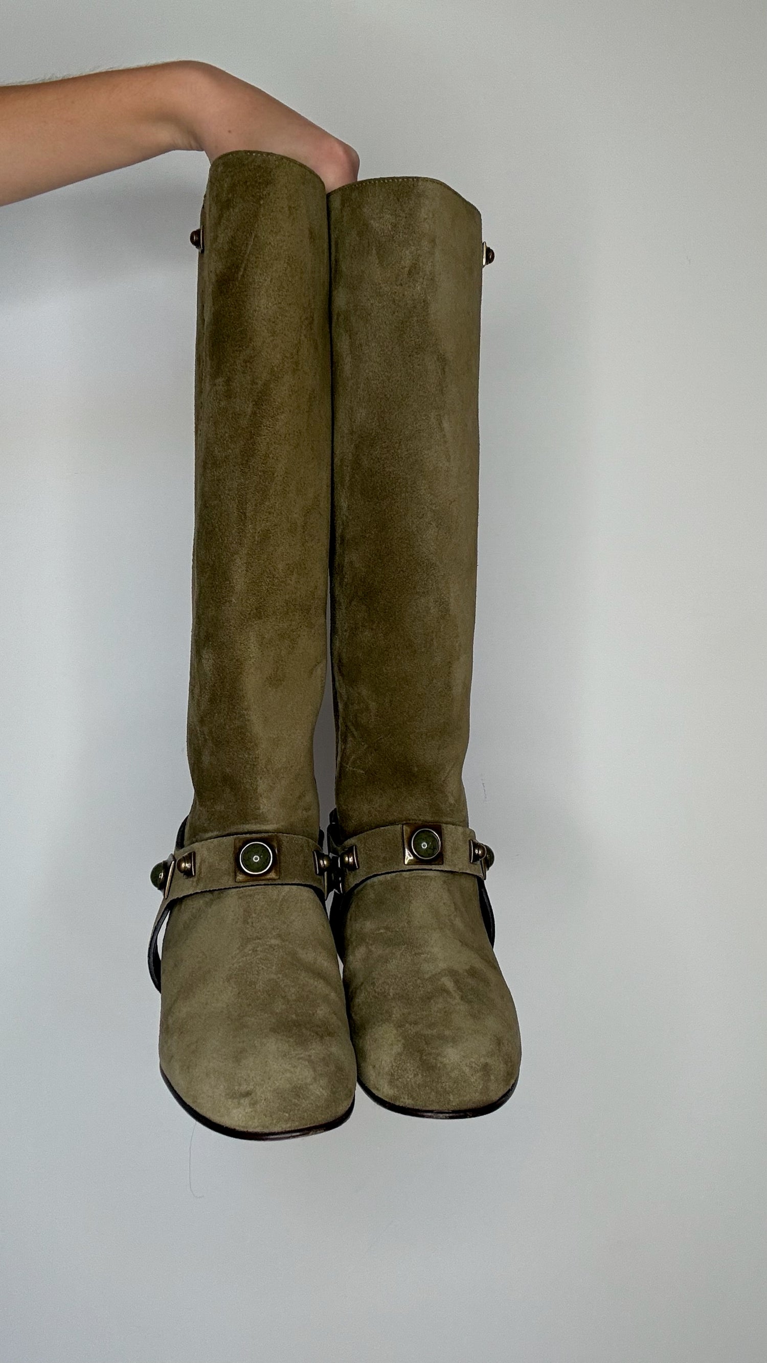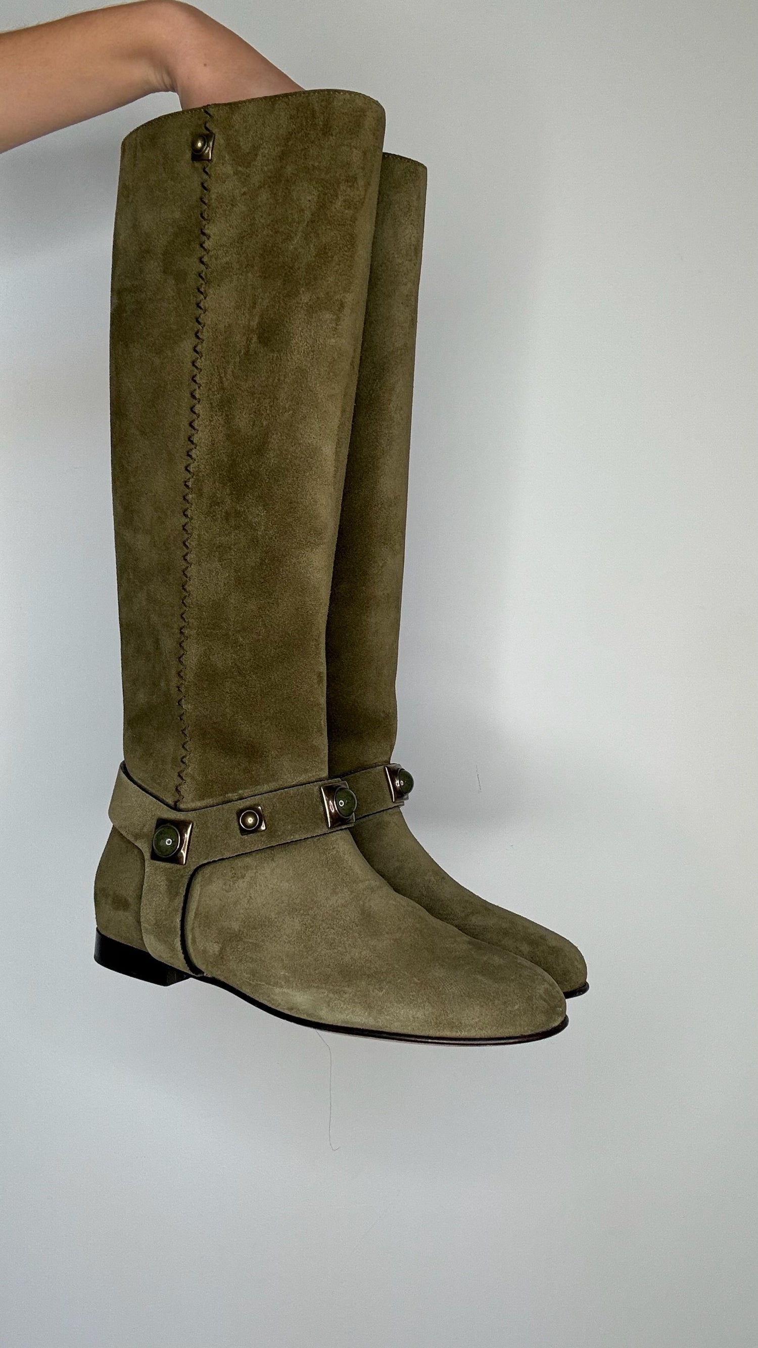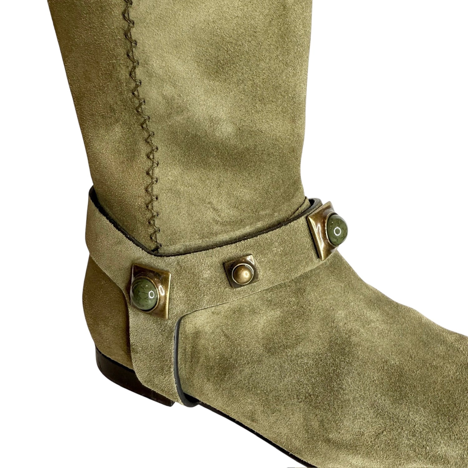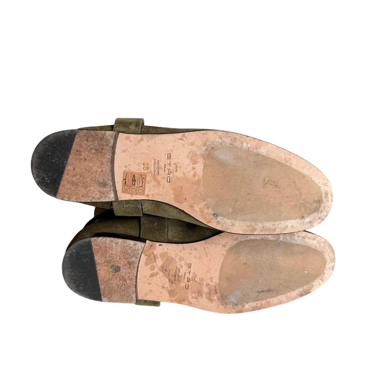 Etro suede boots. Green suede. Slip-on. Embellishments strap. Round toe. Designer size 38.