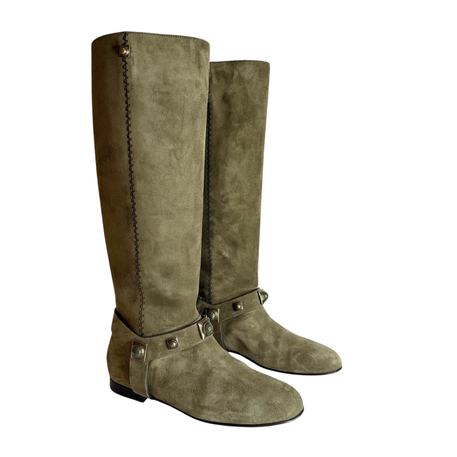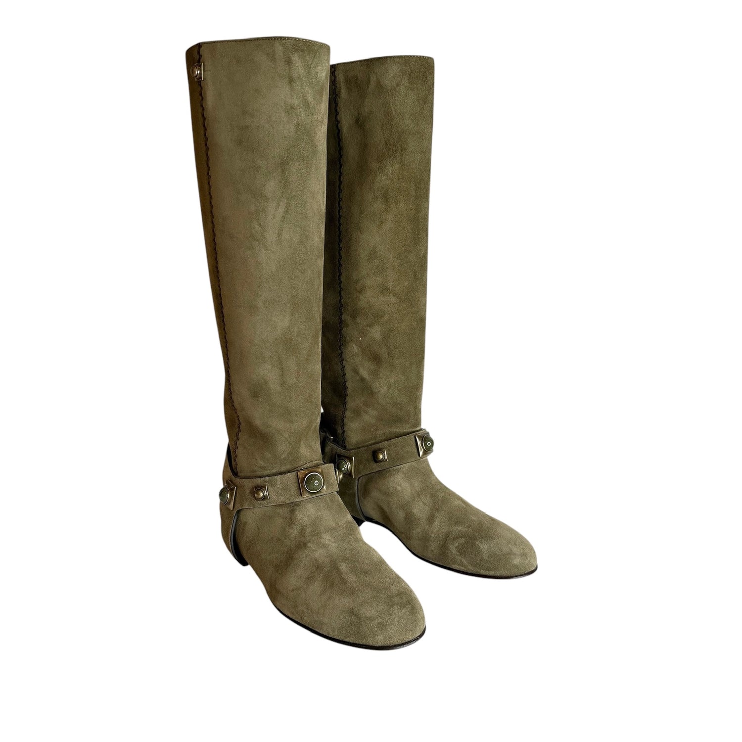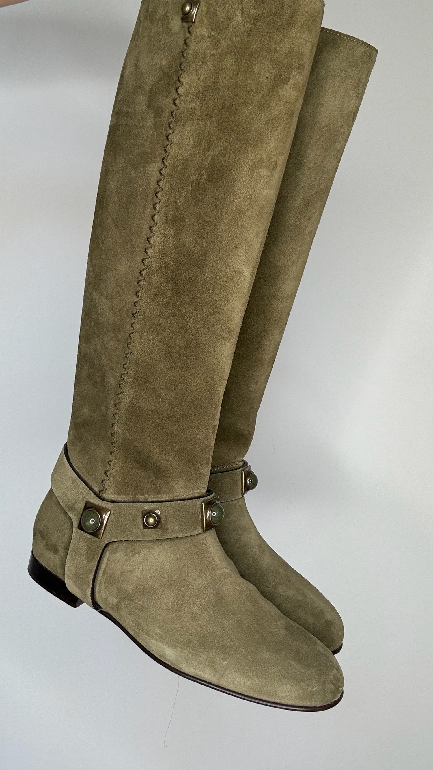 Etro suede boots. Green suede. Slip-on. Embellishments strap. Round toe. Designer size 38.