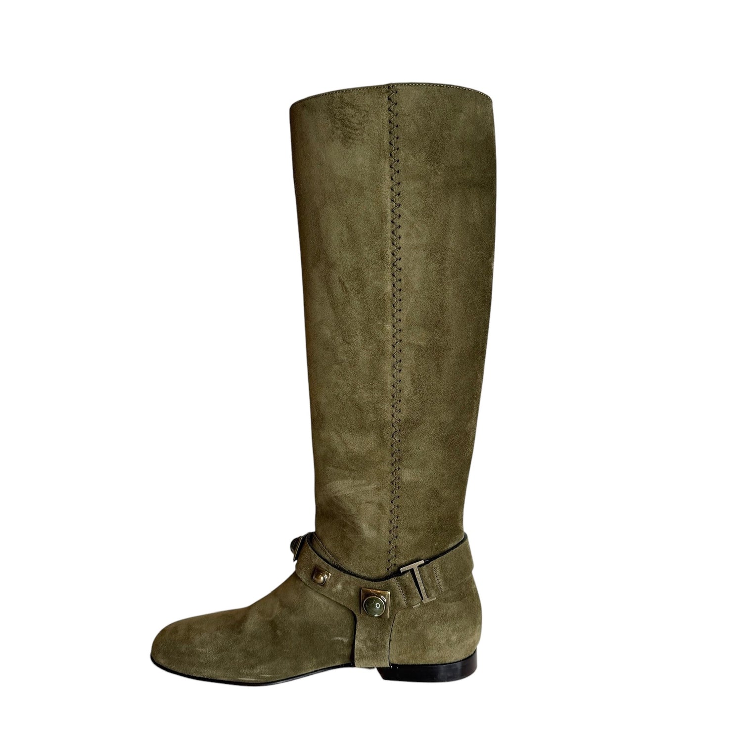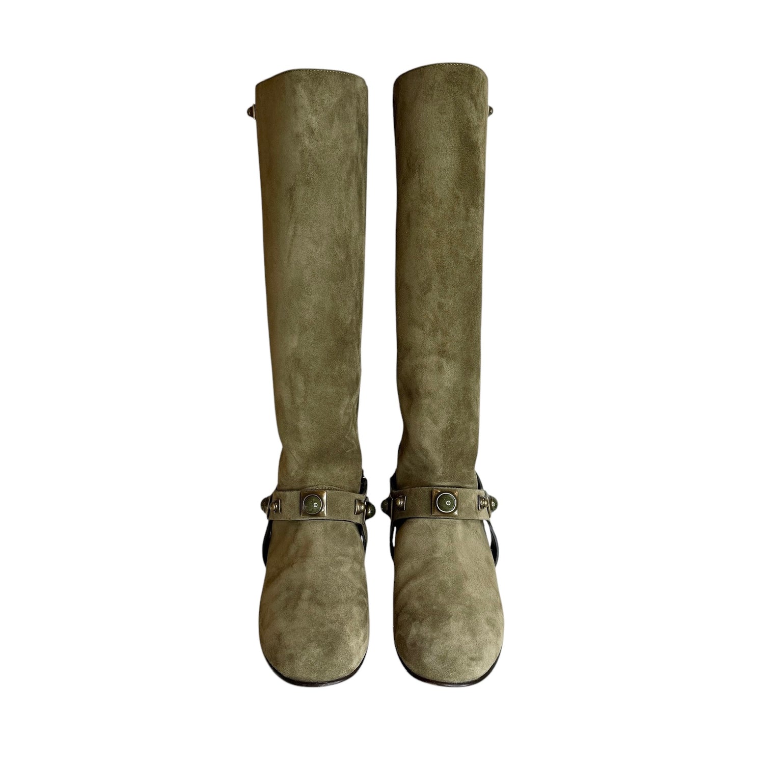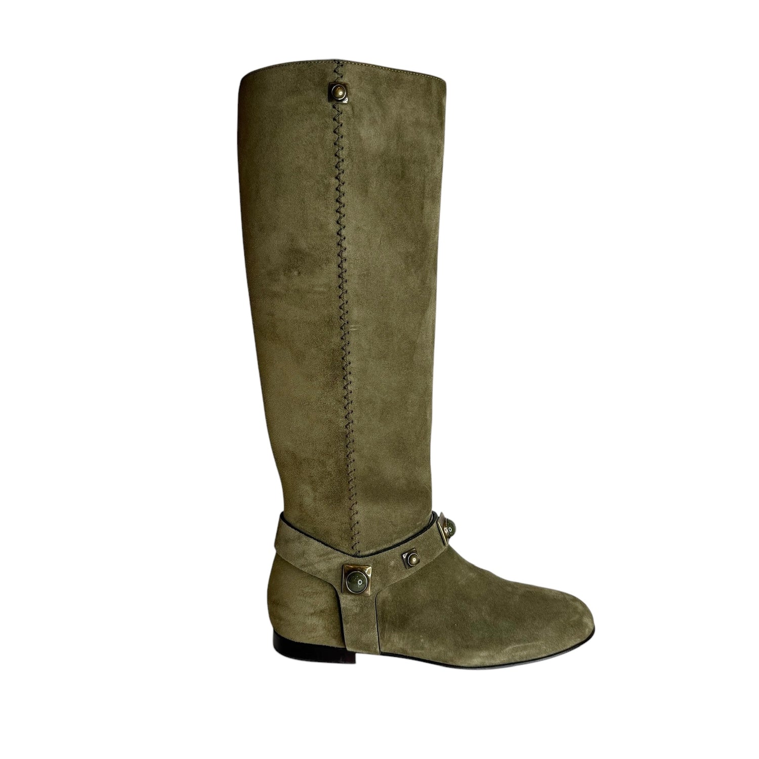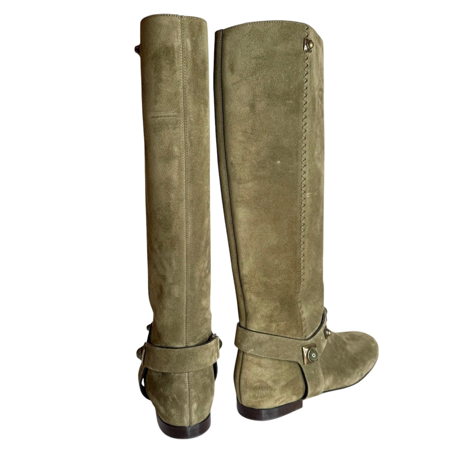 Etro suede boots. Green suede. Slip-on. Embellishments strap. Round toe. Designer size 38.