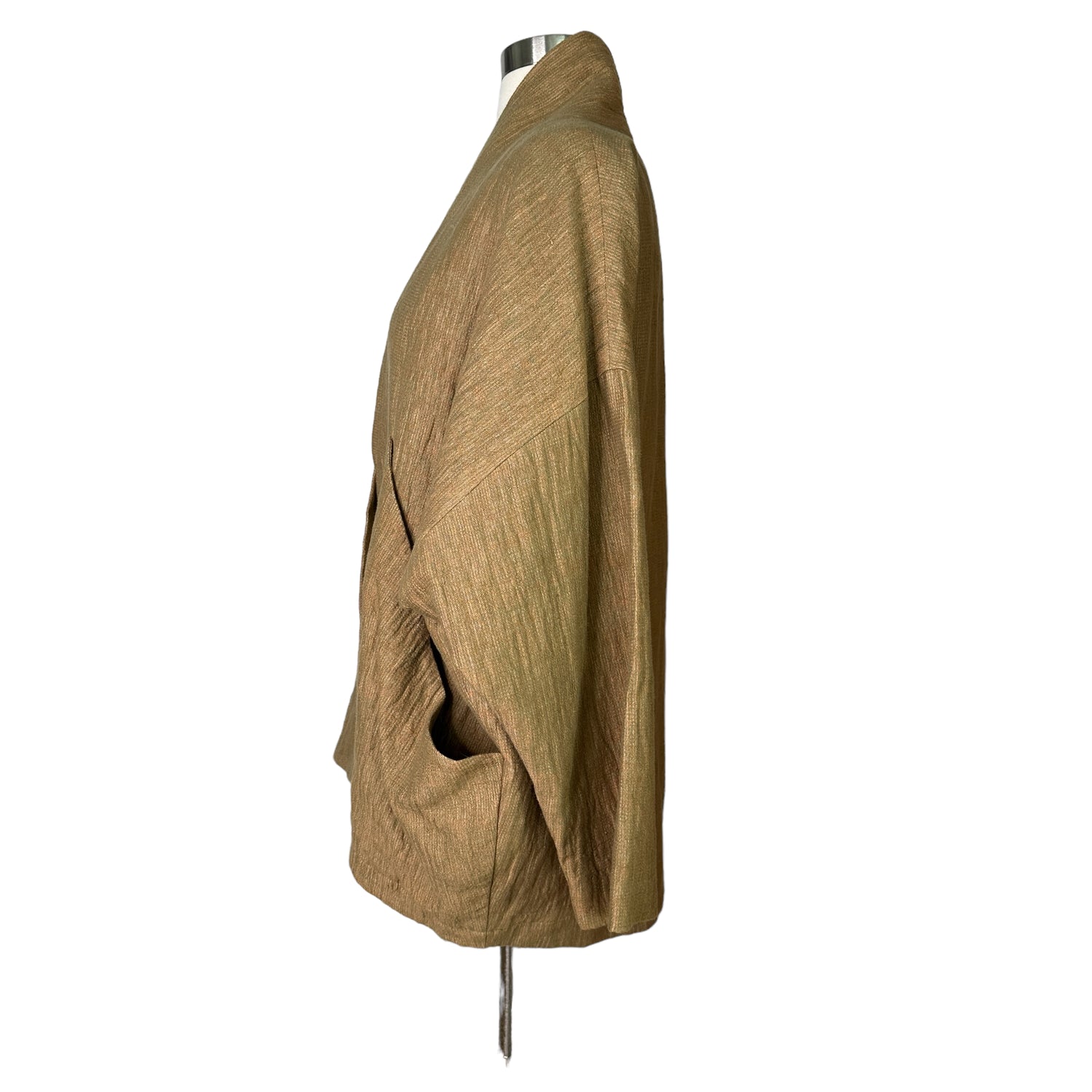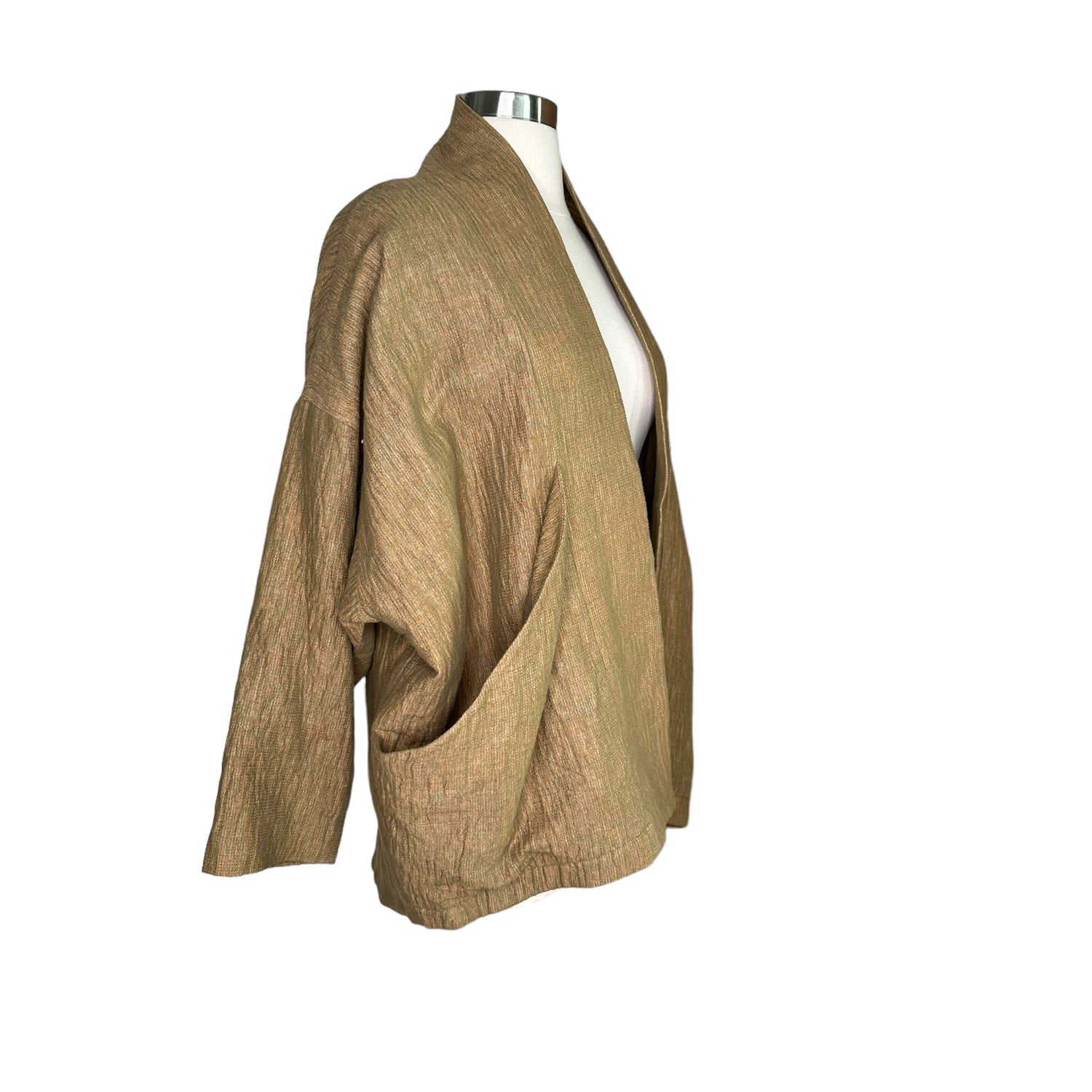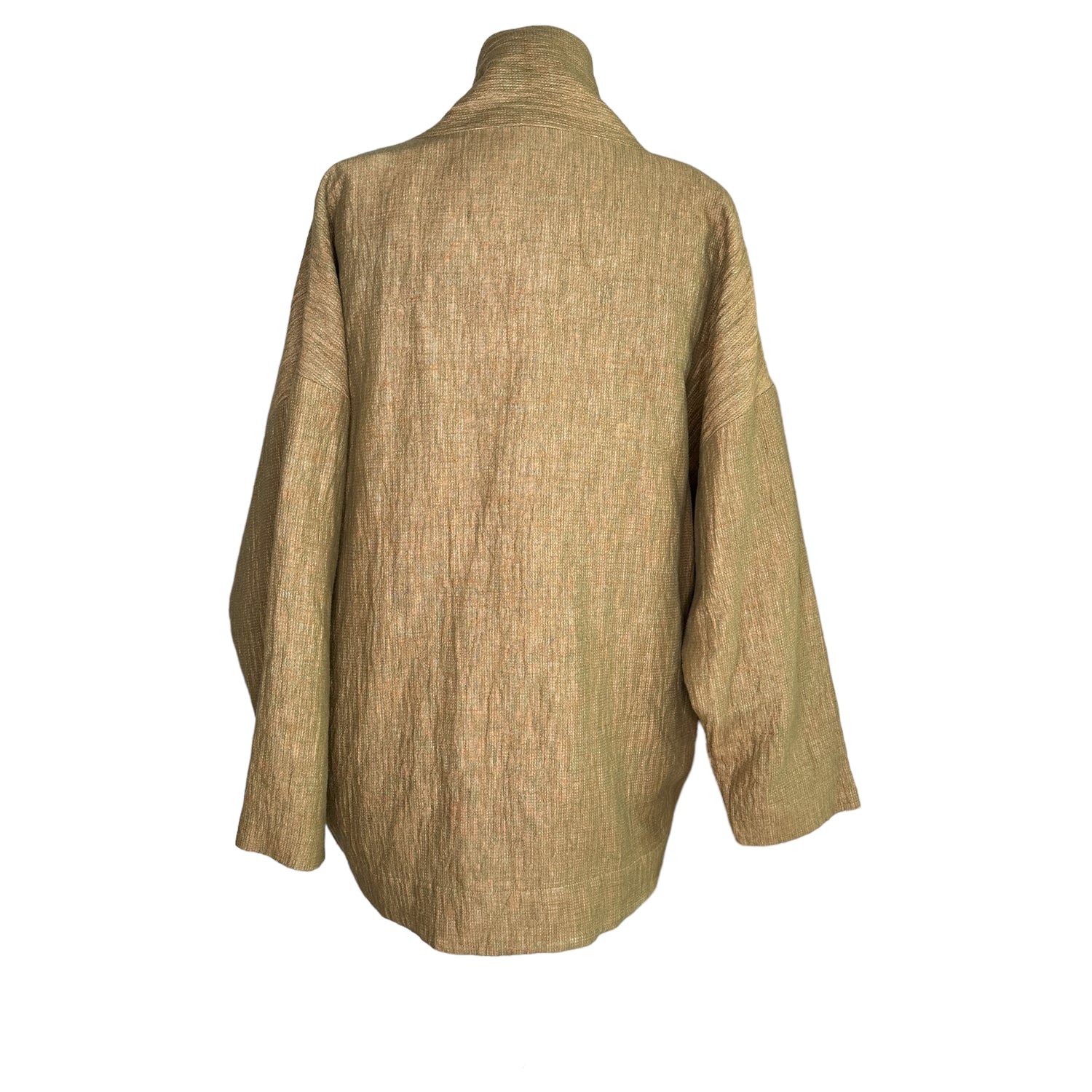 7115 by Szeki jacket. This is their "signature sumo jacket". Beautiful kaki/ocre color in woven fabric. Two large pockets at front big enough to carry all the important things like your phone, keys and wallet. Perfect on the go piece. No closure. Designer size small.