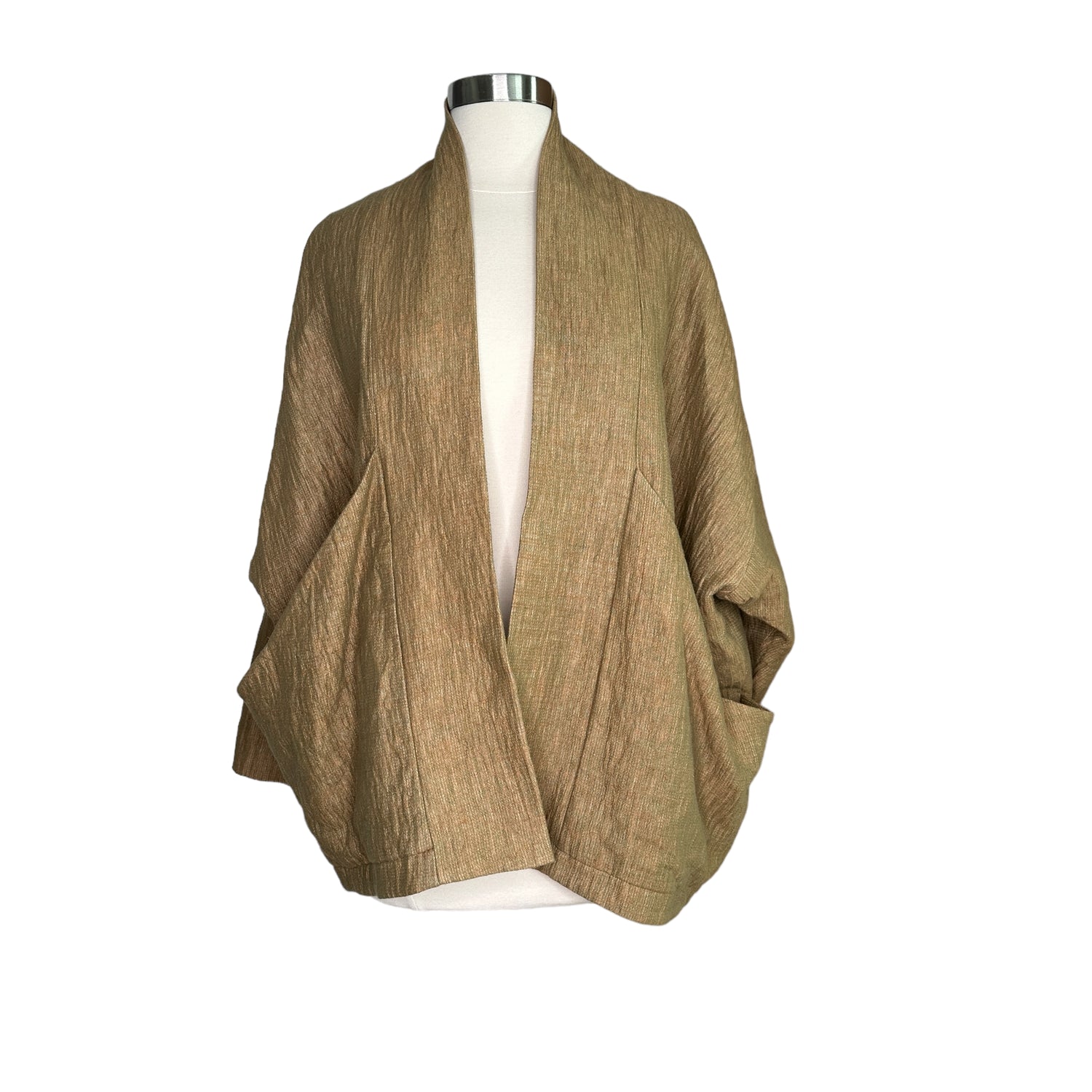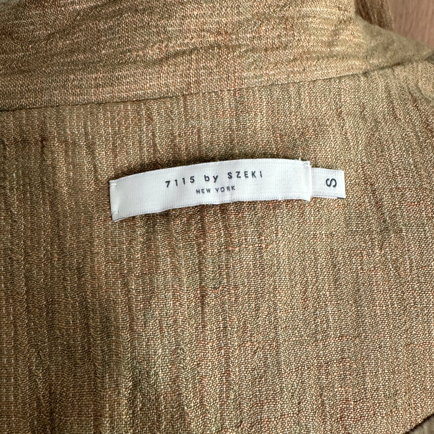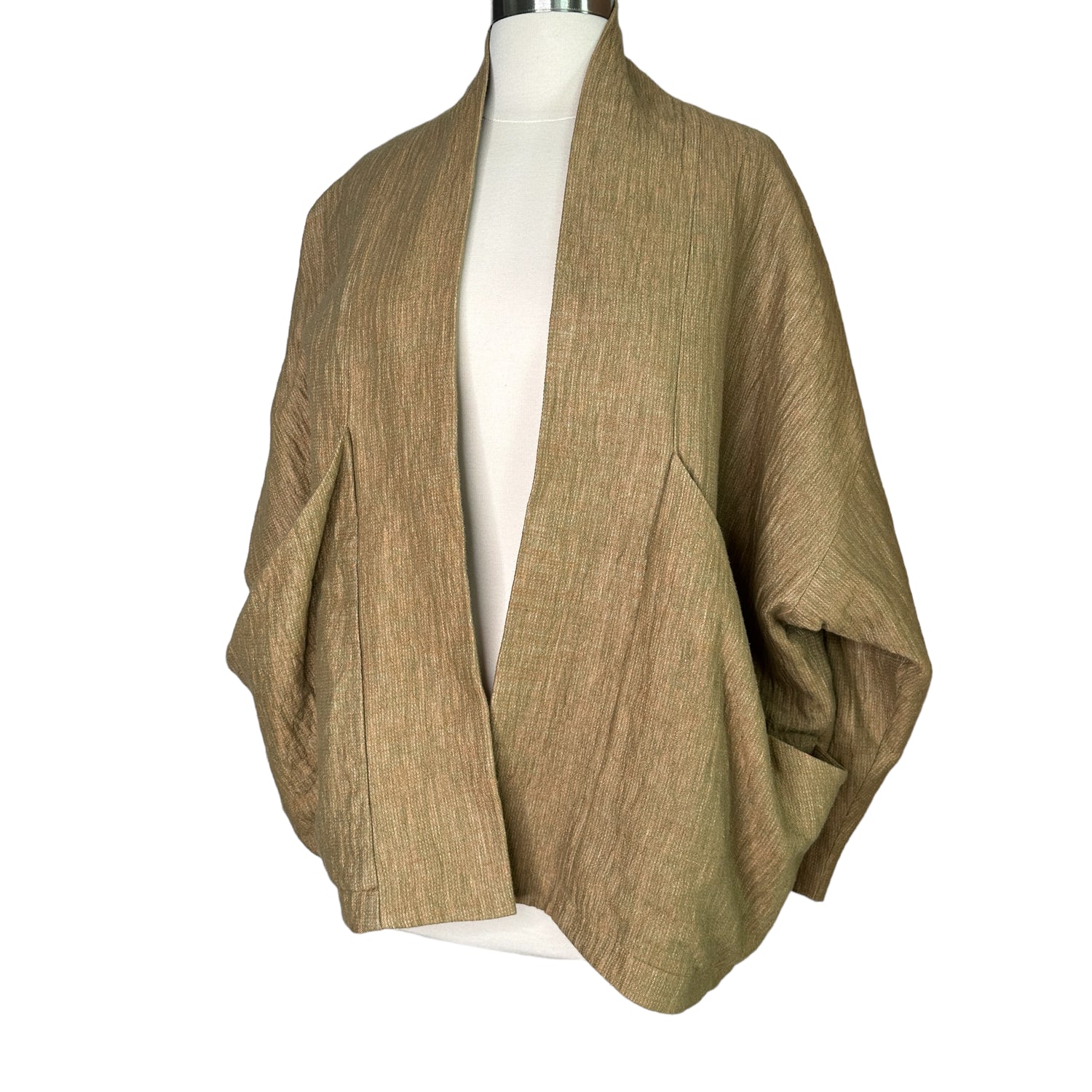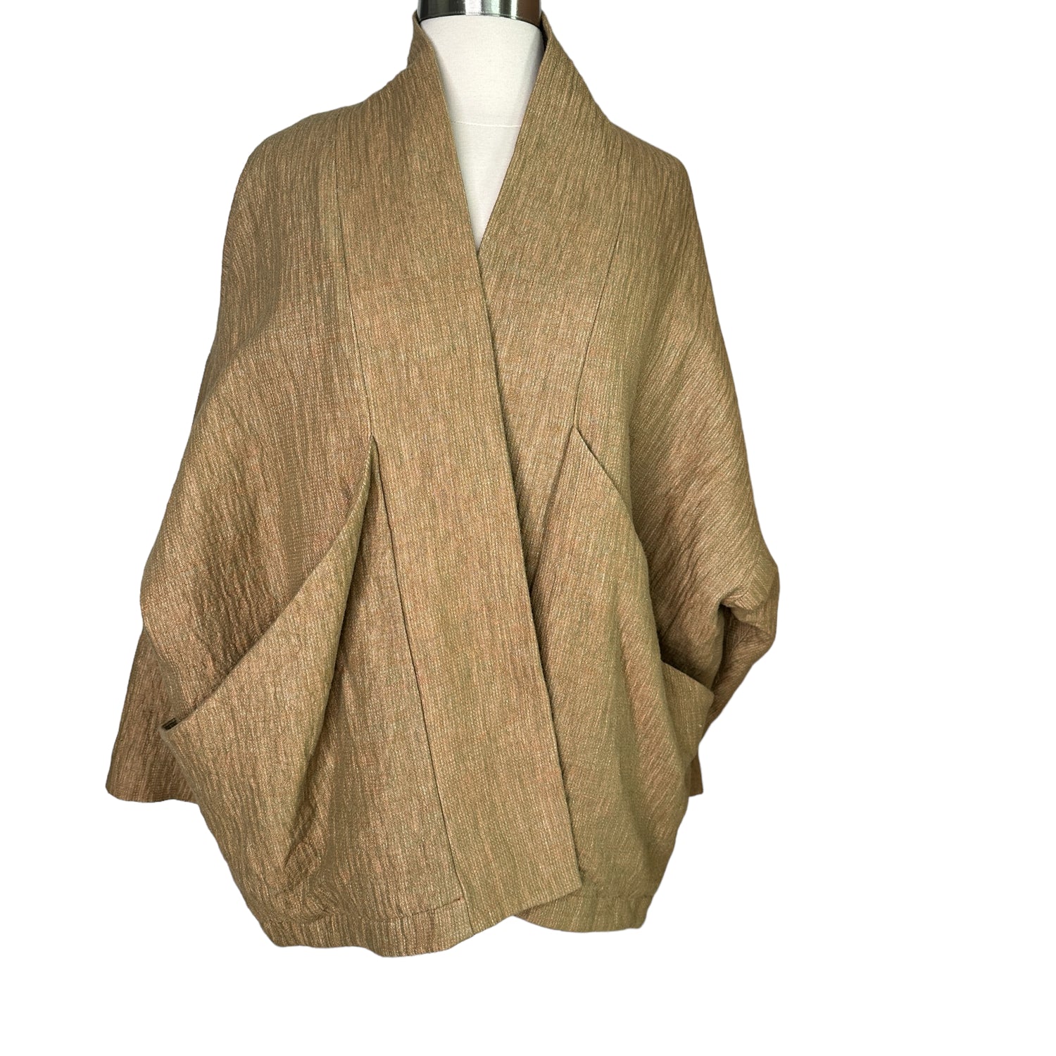 7115 by Szeki jacket. This is their "signature sumo jacket". Beautiful kaki/ocre color in woven fabric. Two large pockets at front big enough to carry all the important things like your phone, keys and wallet. Perfect on the go piece. No closure. Designer size small.