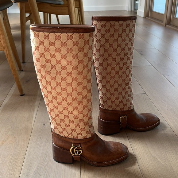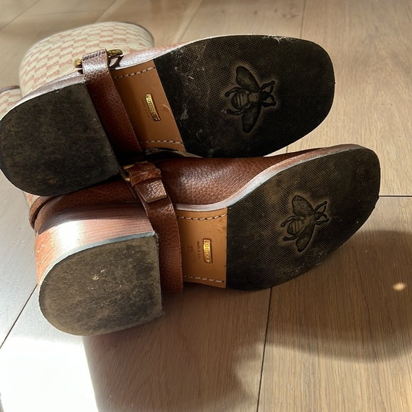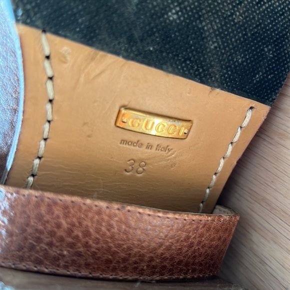 Classic logo fabric. Can be unbuckled to be worn without logos for less of a statement look. Super cool heels with Gucci nailed Brand.