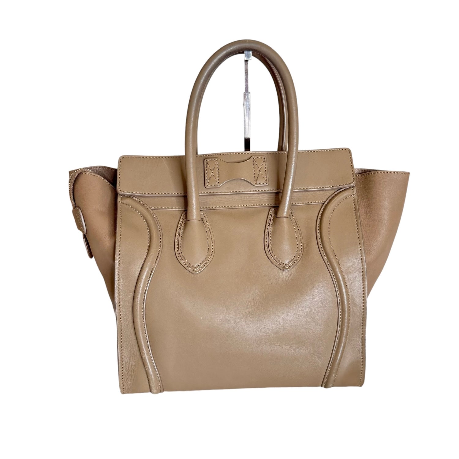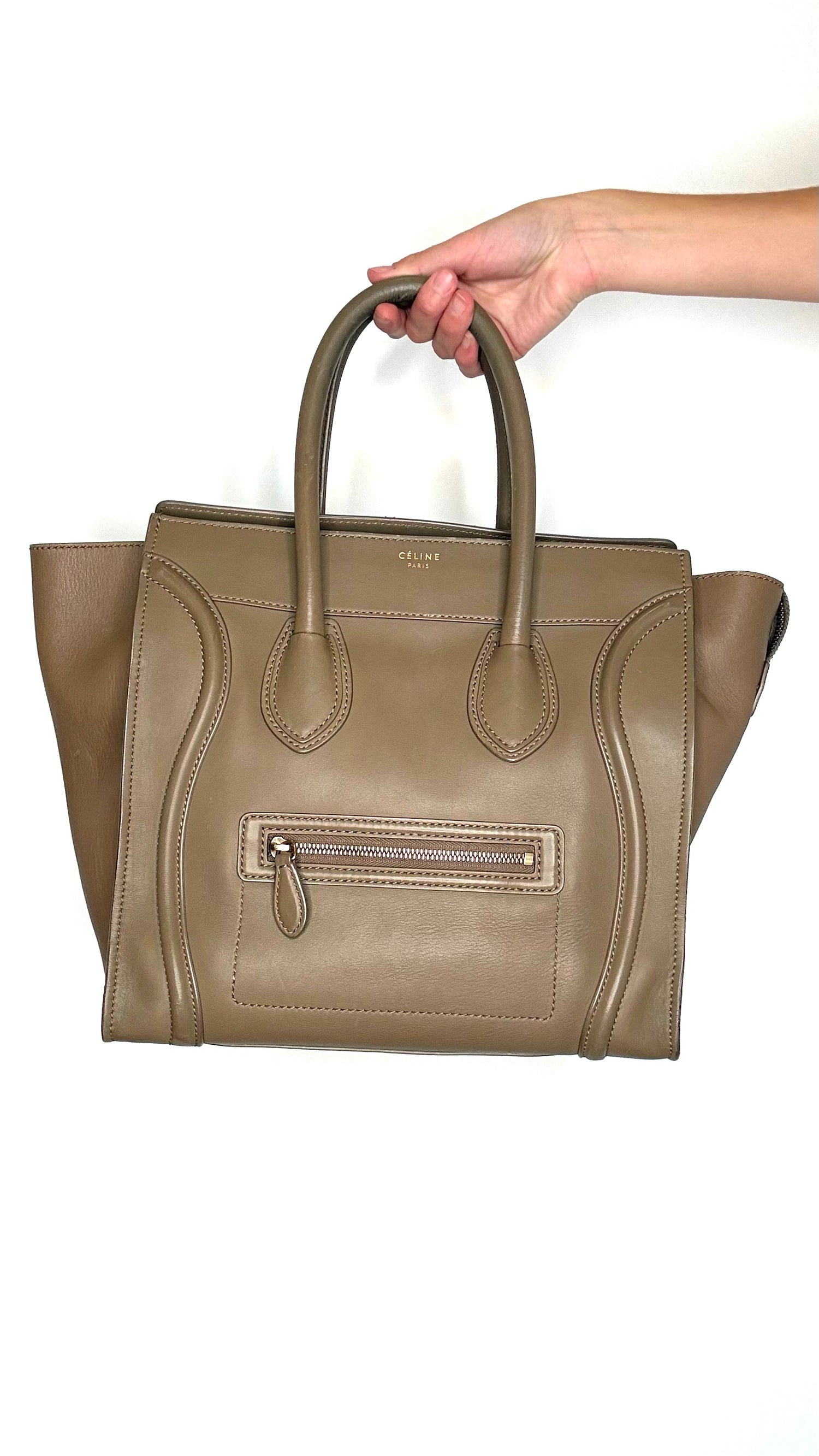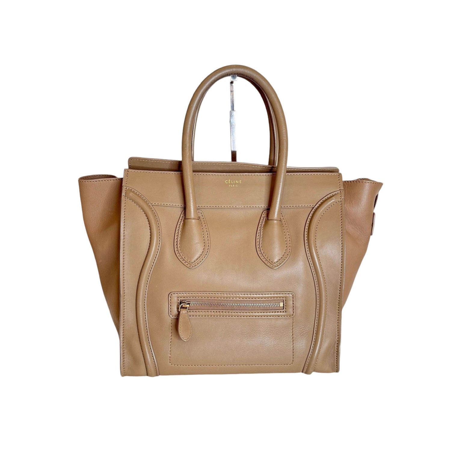 Celine taupe Luggage bag. Gold-tone logo and hardware. Double rolled handles. Zipper closure. Zipper pocket at front. Interior slit pockets and zipper pocket. Protective at base.
