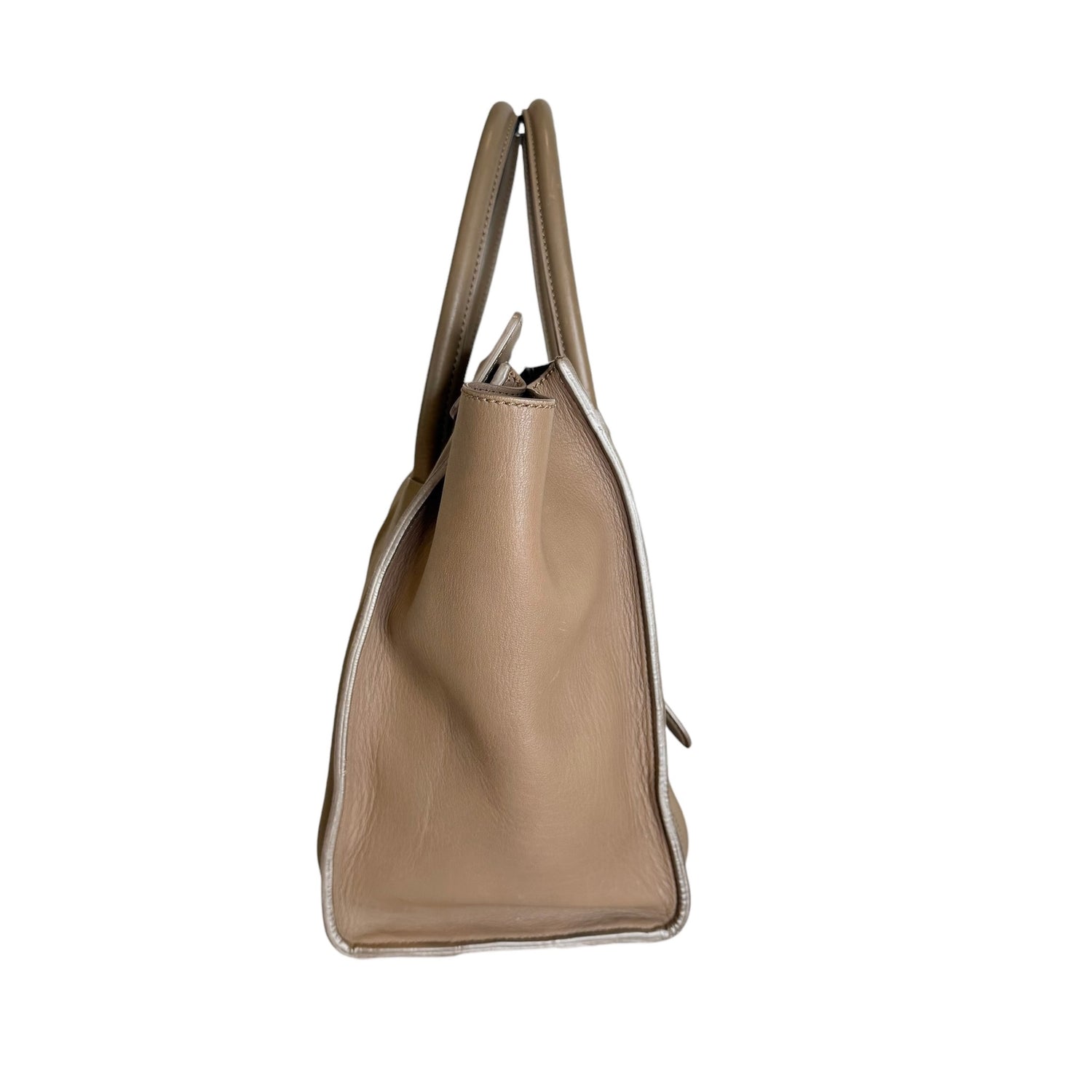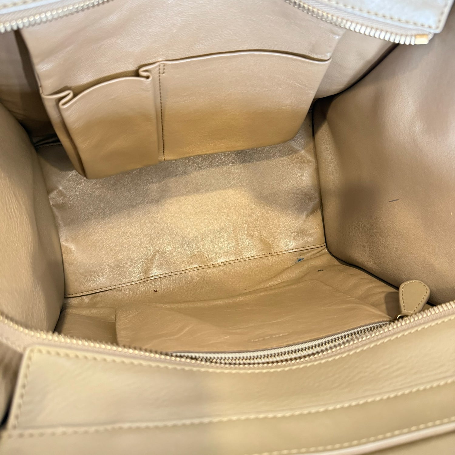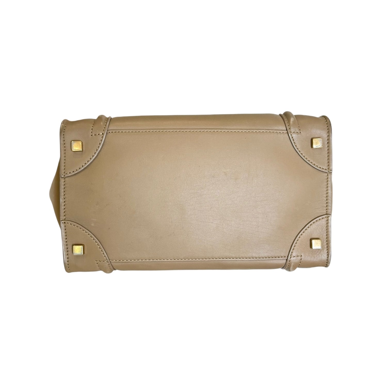 Celine taupe Luggage bag. Gold-tone logo and hardware. Double rolled handles. Zipper closure. Zipper pocket at front. Interior slit pockets and zipper pocket. Protective at base.