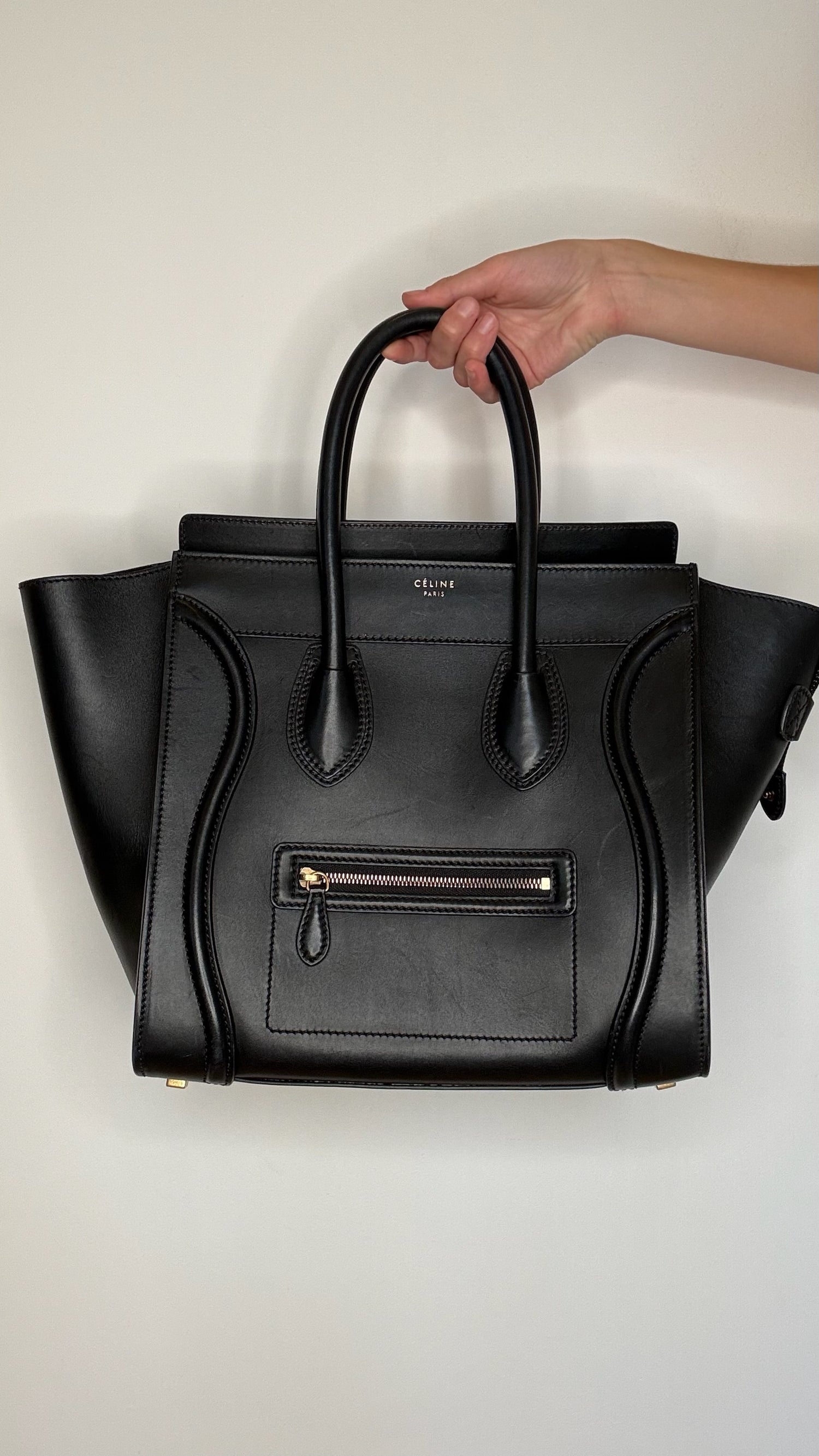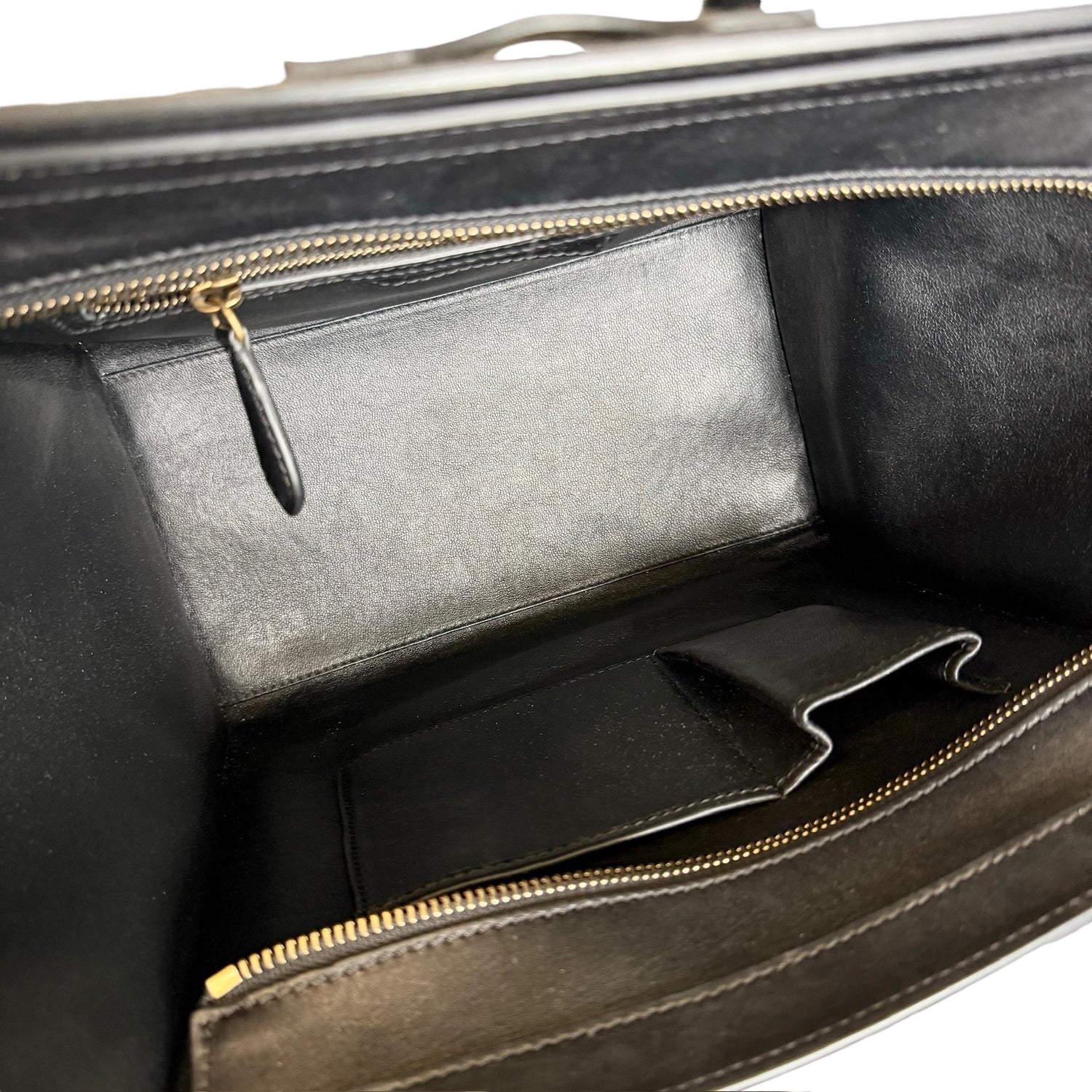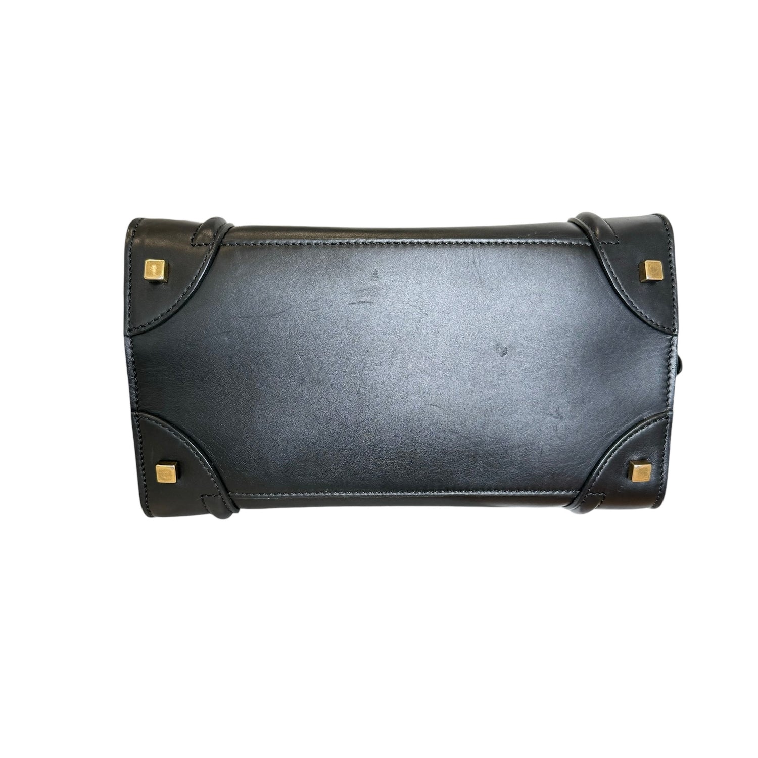 Celine black Luggage bag. Gold-tone logo and hardware. Double rolled handles. Zipper closure. Zipper pocket at front. Interior slit pockets and zipper pocket. Protective at base.