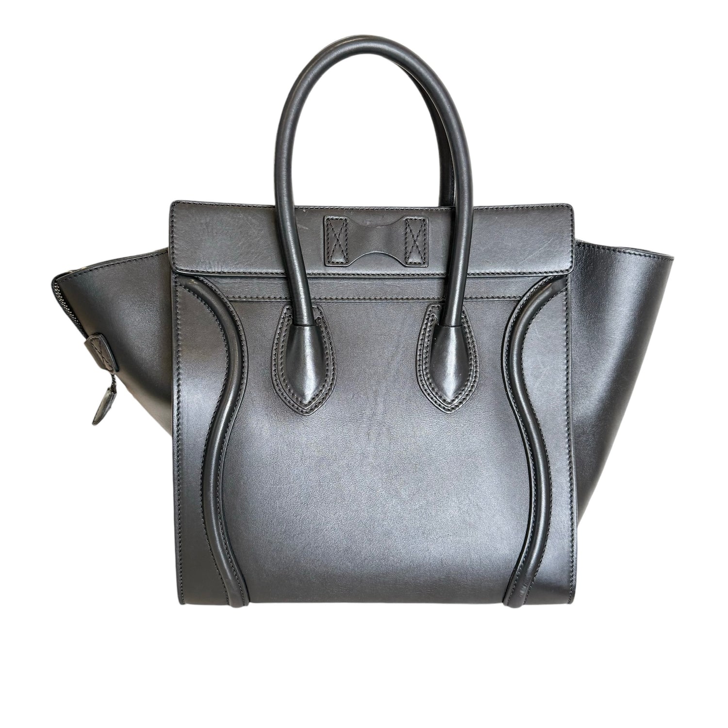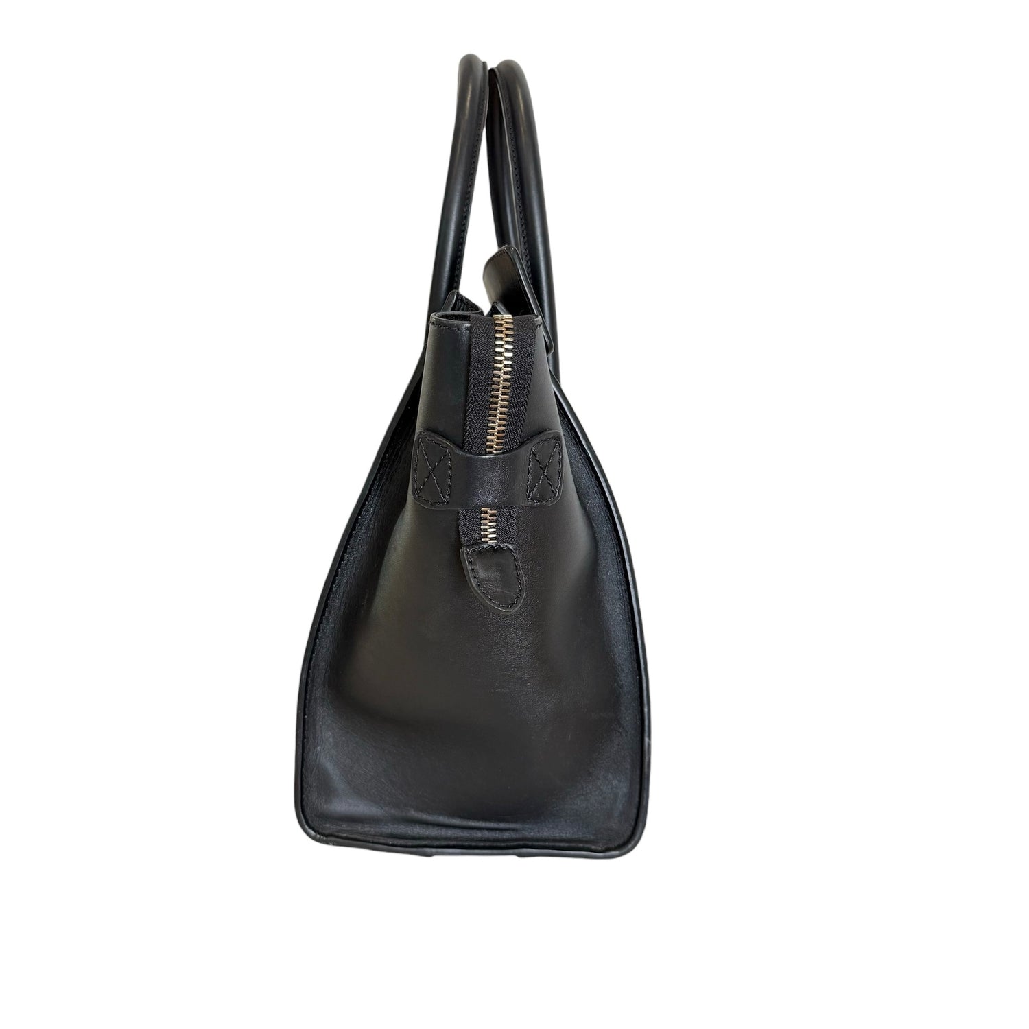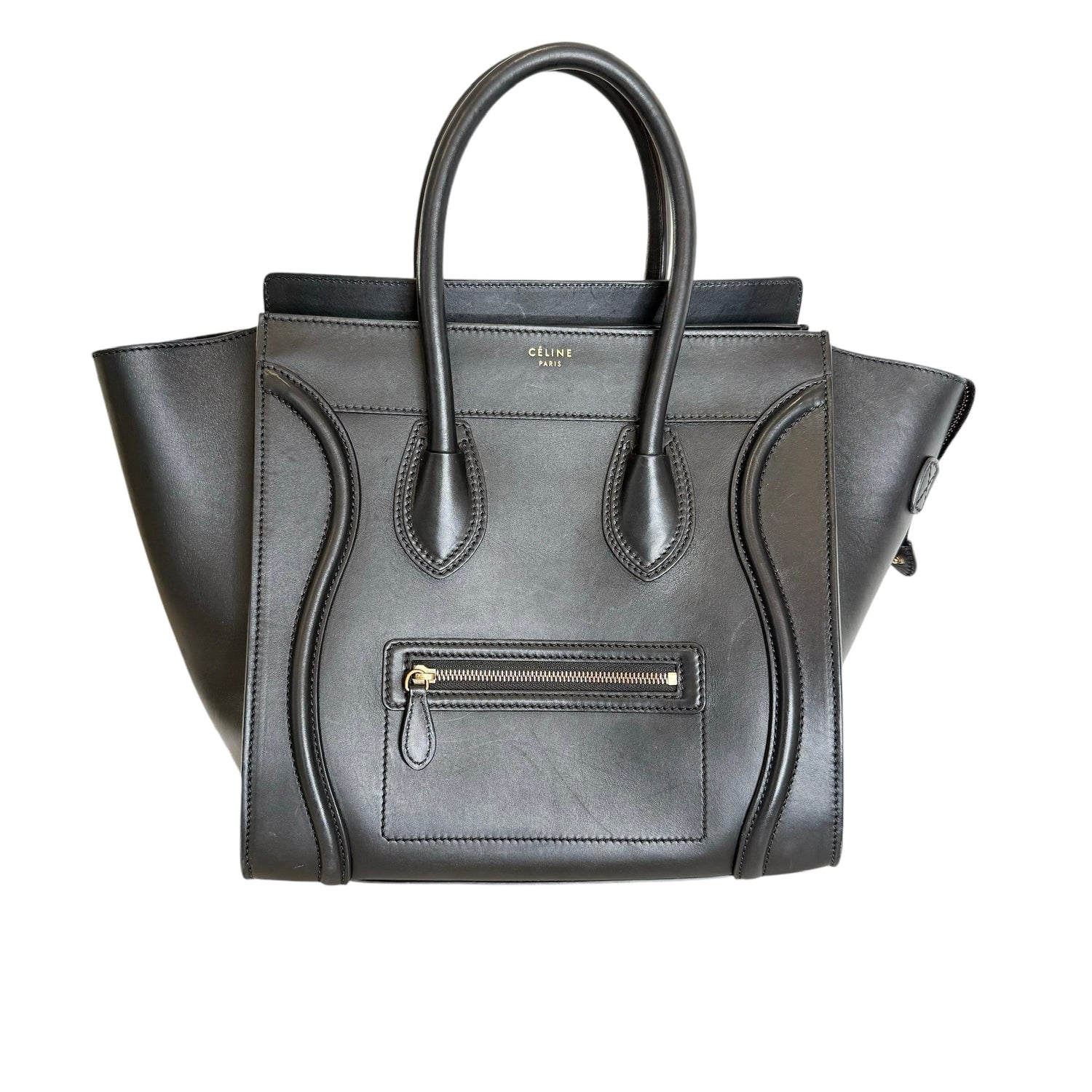 Celine black Luggage bag. Gold-tone logo and hardware. Double rolled handles. Zipper closure. Zipper pocket at front. Interior slit pockets and zipper pocket. Protective at base.