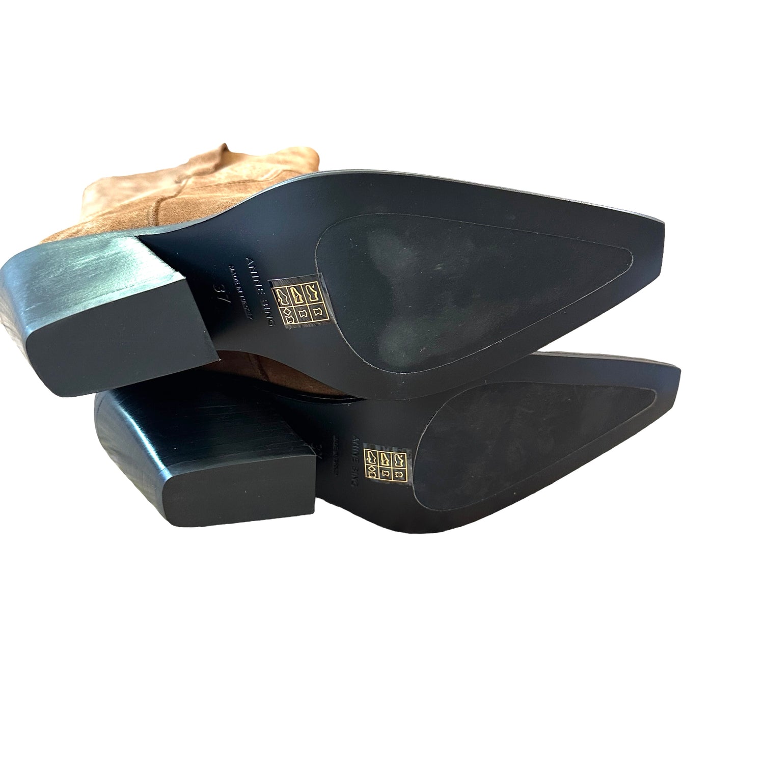Anine Bing cowboy low boots. Taupe suede. Black heels and outer soles. Silver-tone hardware detail at heels. Pointed toe. Designer size 37.