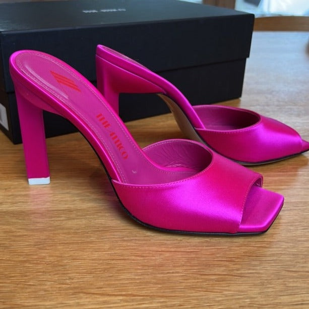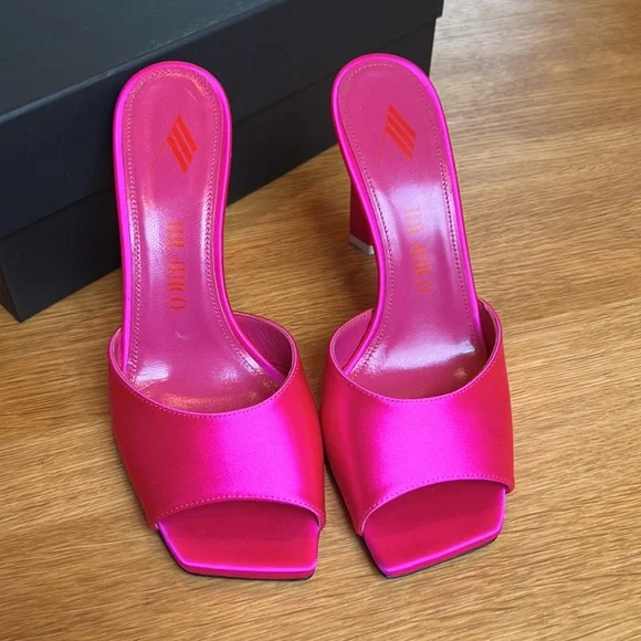 Satin mules in pink. Open square toe. Tonal buffed goatskin lining. Printed logo in black at padded buffed goatskin footbed. Covered block heel. Leather outsole in black. Approx. 4" heel.