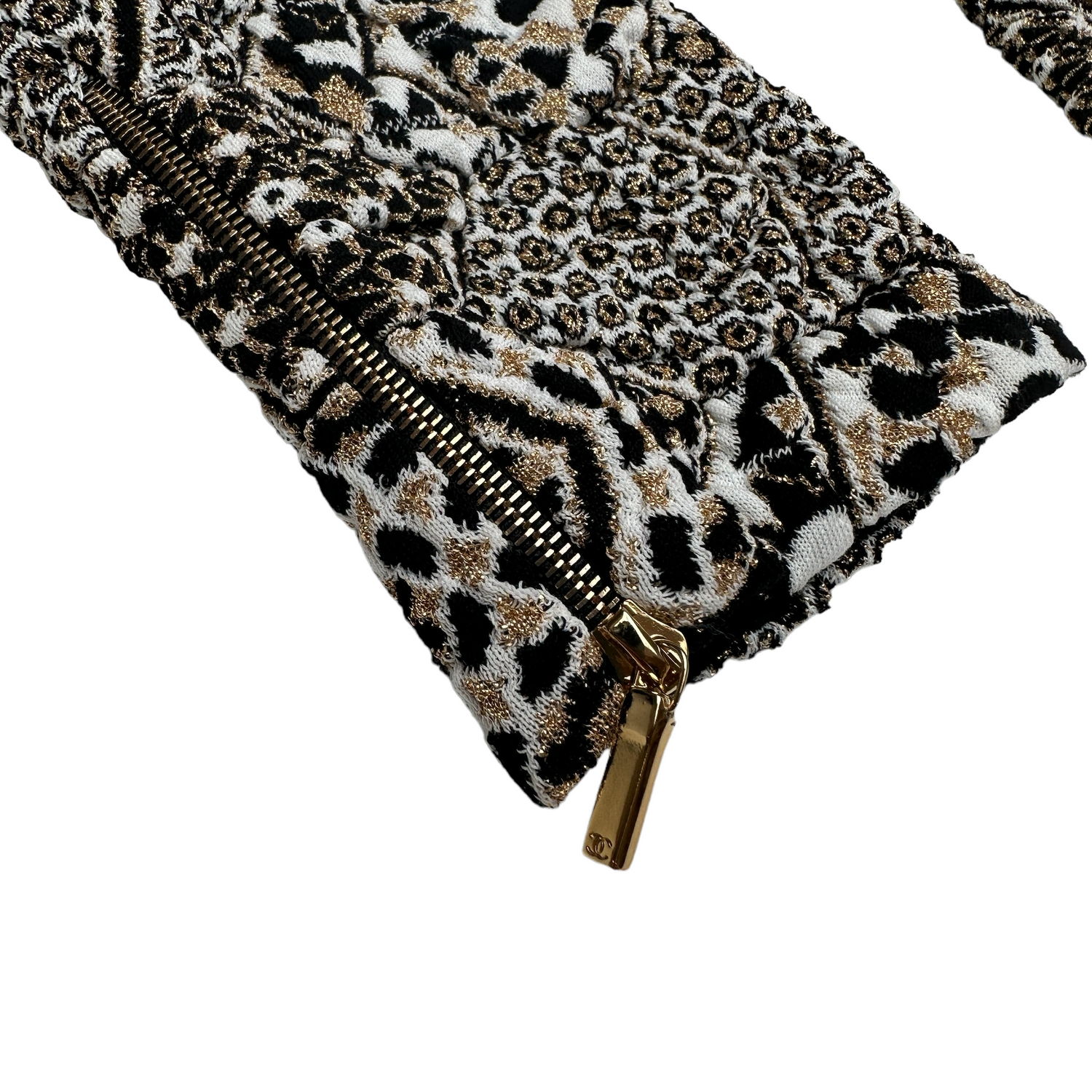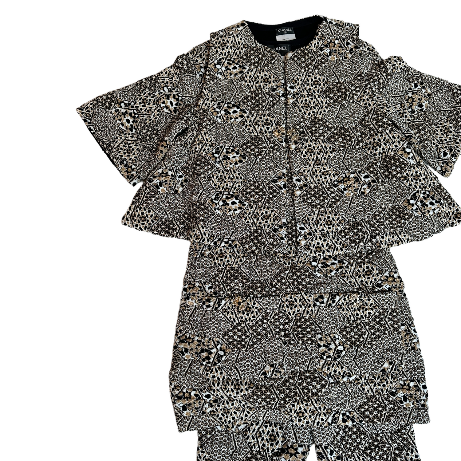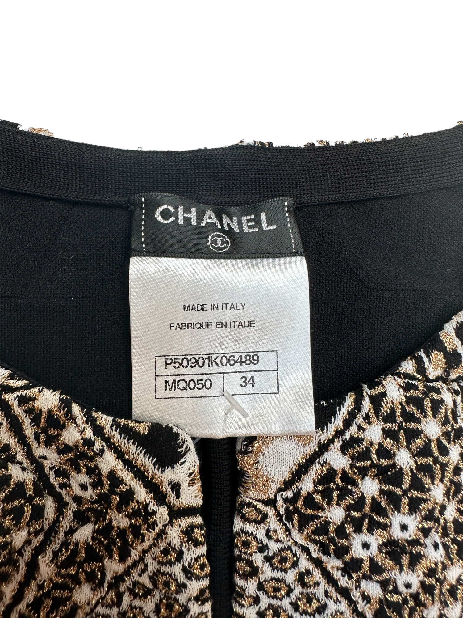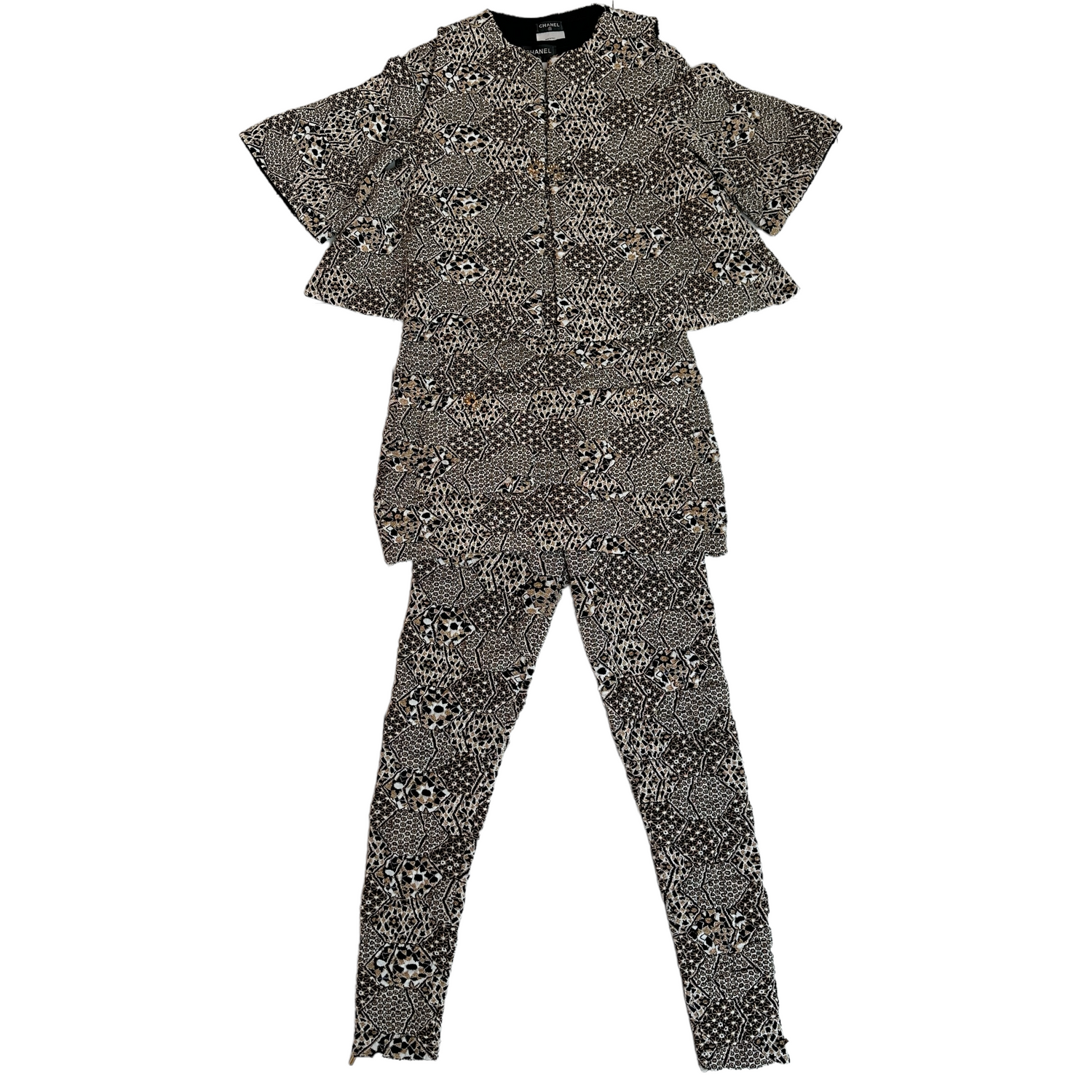 Chanel three piece set. One tunique, one pair of leggings, One sleeveless bolero. This is a collection and rare set from Chanel. Silver, gold and black. Metallic fabric. Stretchy. Gold-tone zipper at ankles. Jewelry-like buttons.