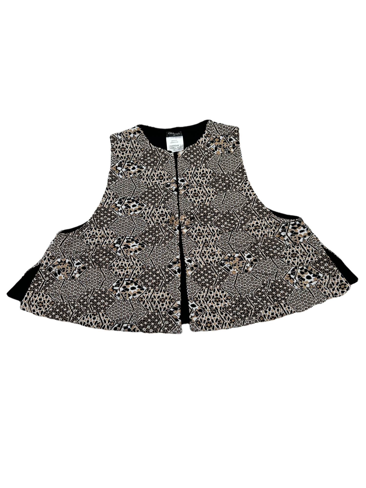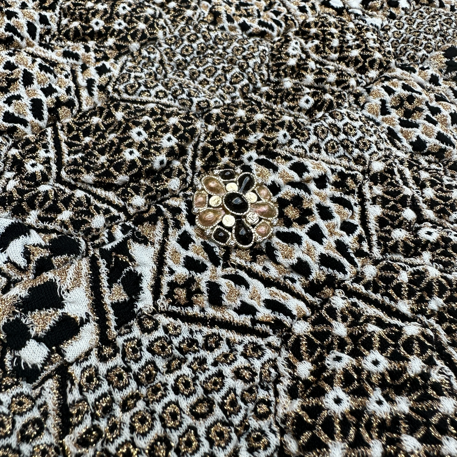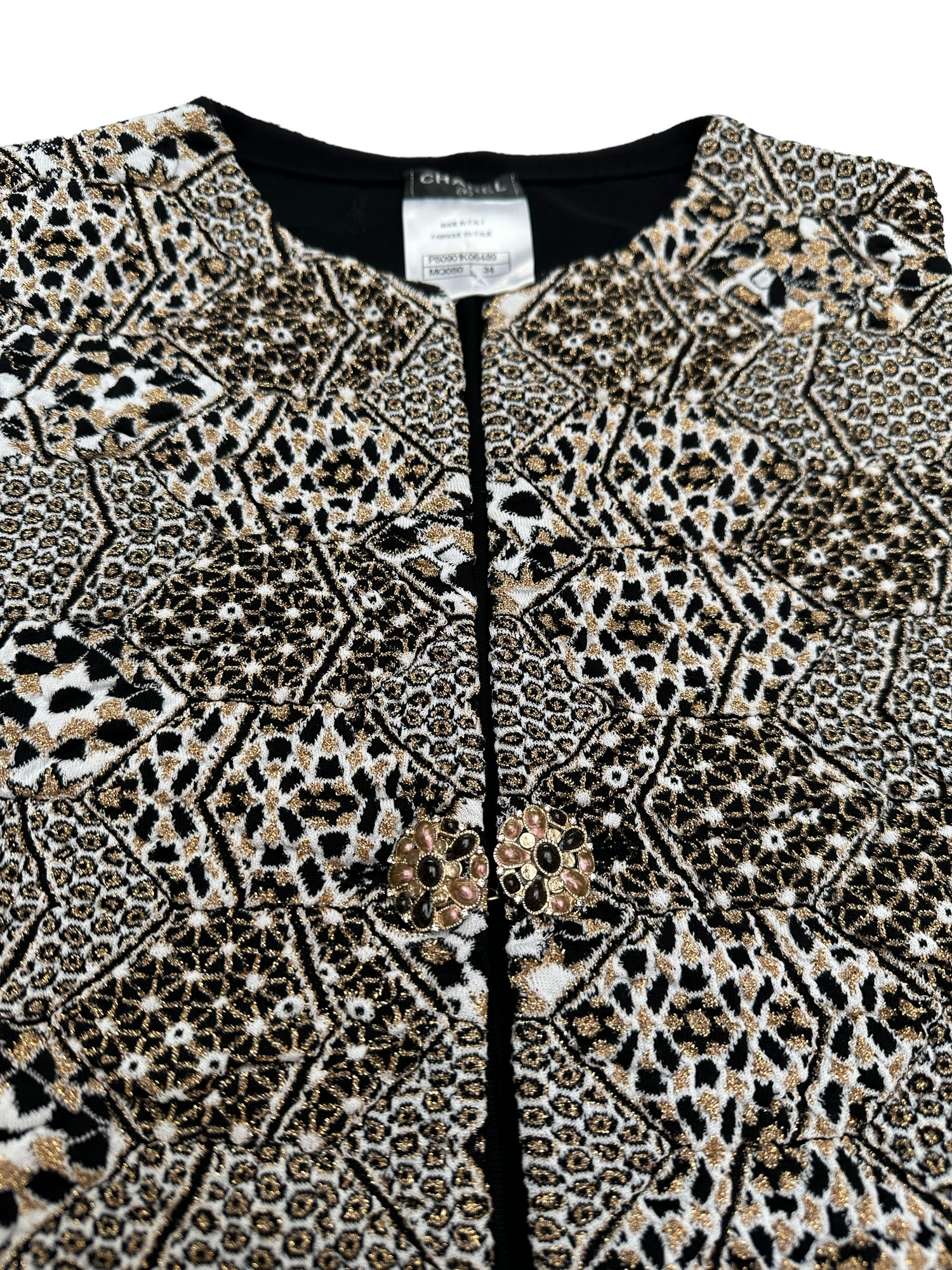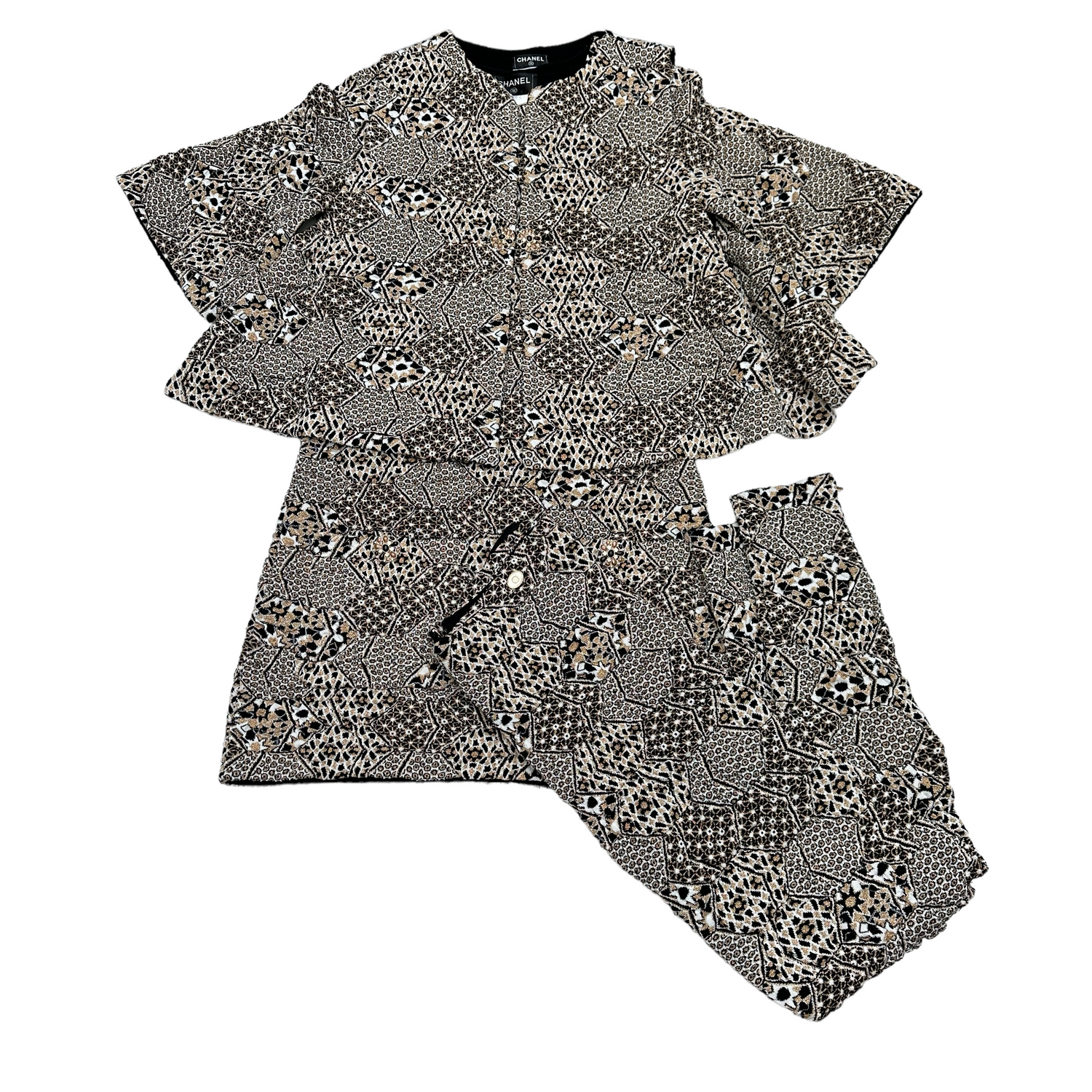 Chanel three piece set. One tunique, one pair of leggings, One sleeveless bolero. This is a collection and rare set from Chanel. Silver, gold and black. Metallic fabric. Stretchy. Gold-tone zipper at ankles. Jewelry-like buttons.