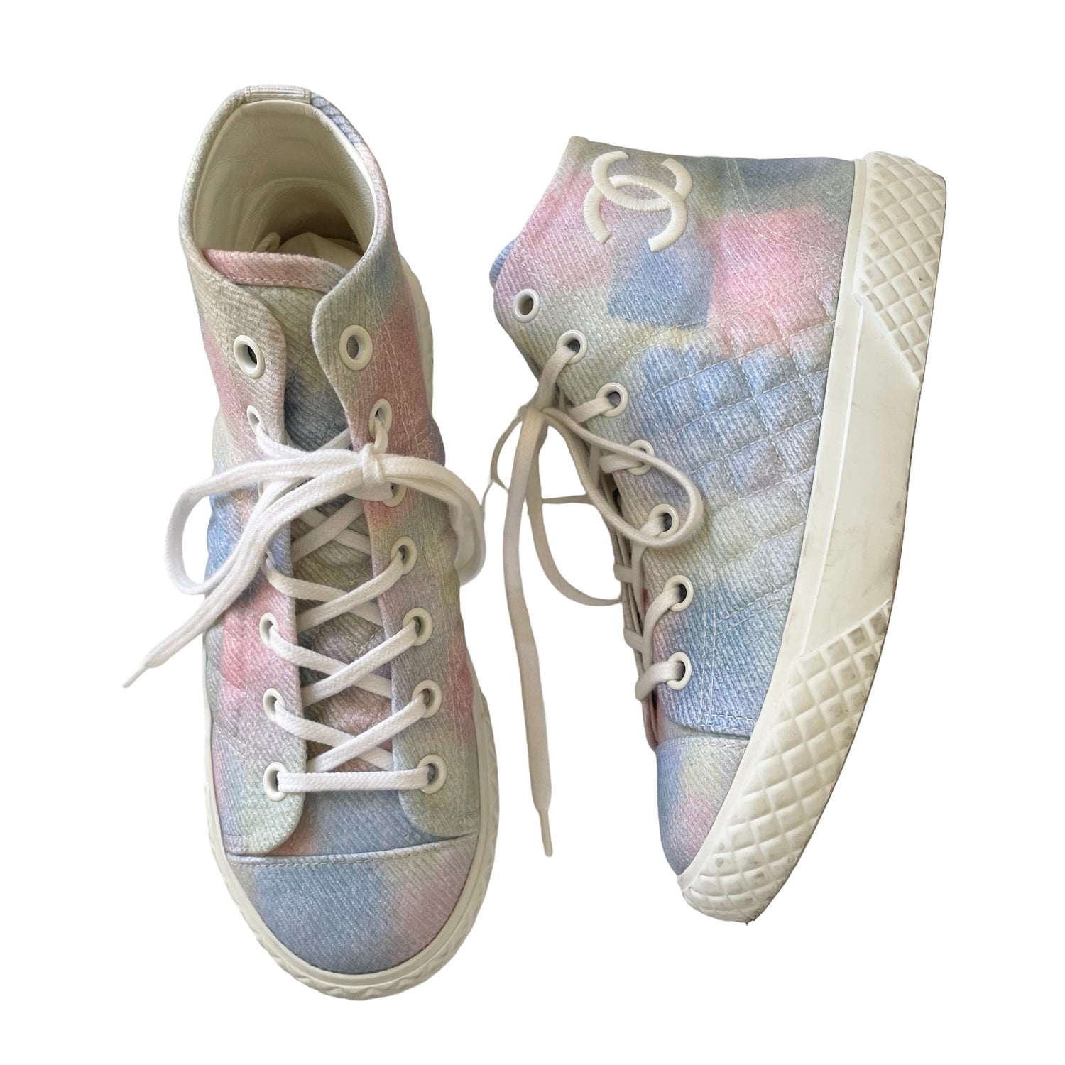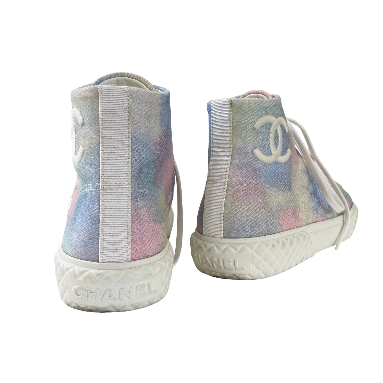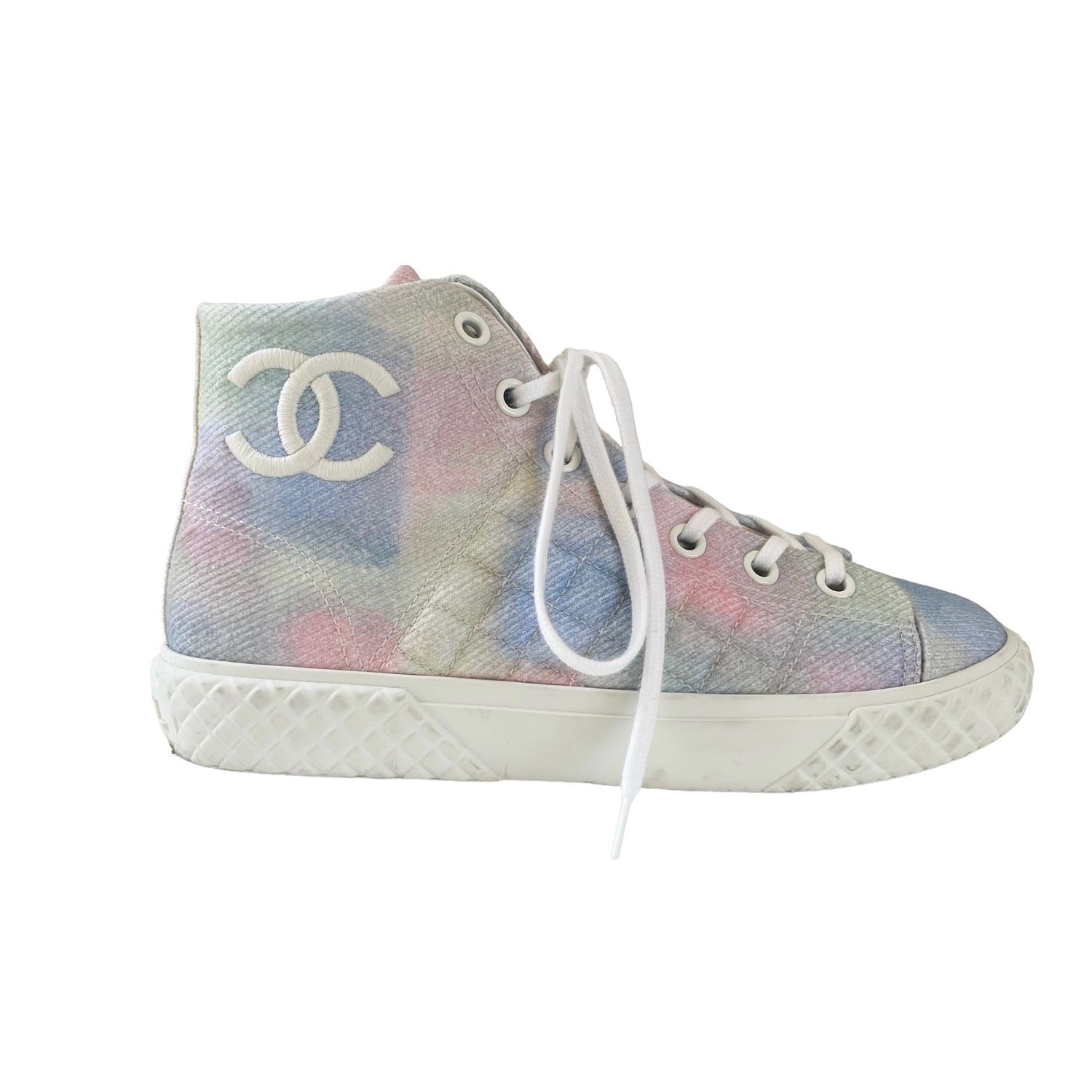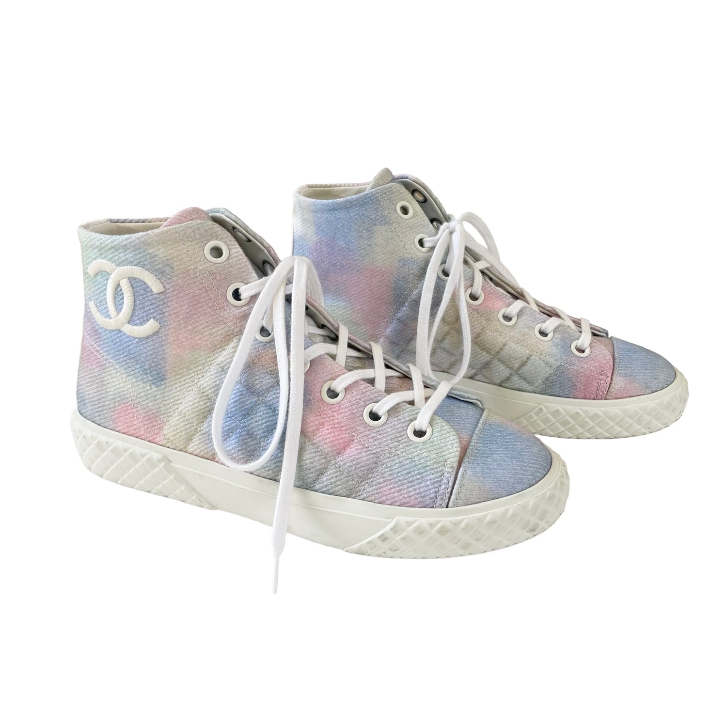 Chanel pastel tie-dye high top sneakers. Embroidered CC logo at the side. Designer size 38.