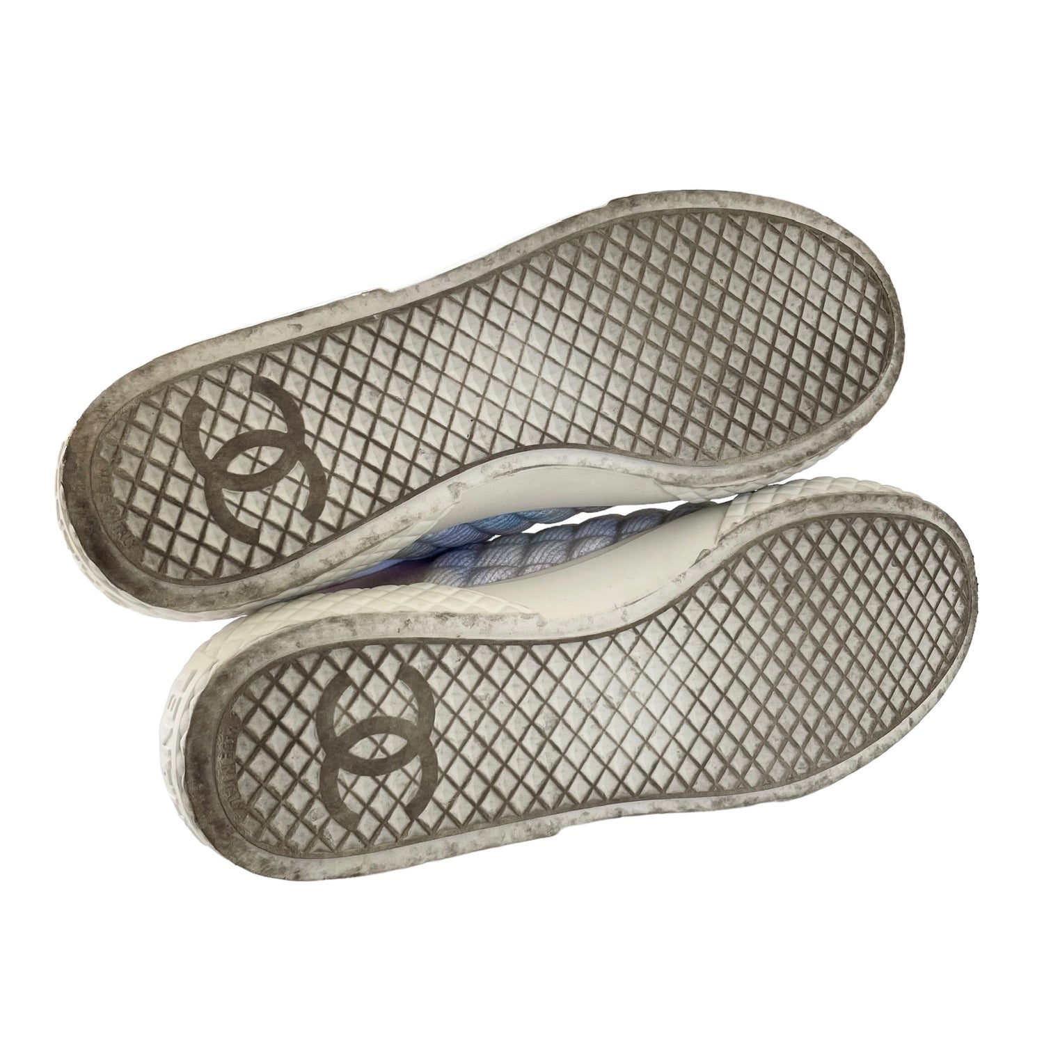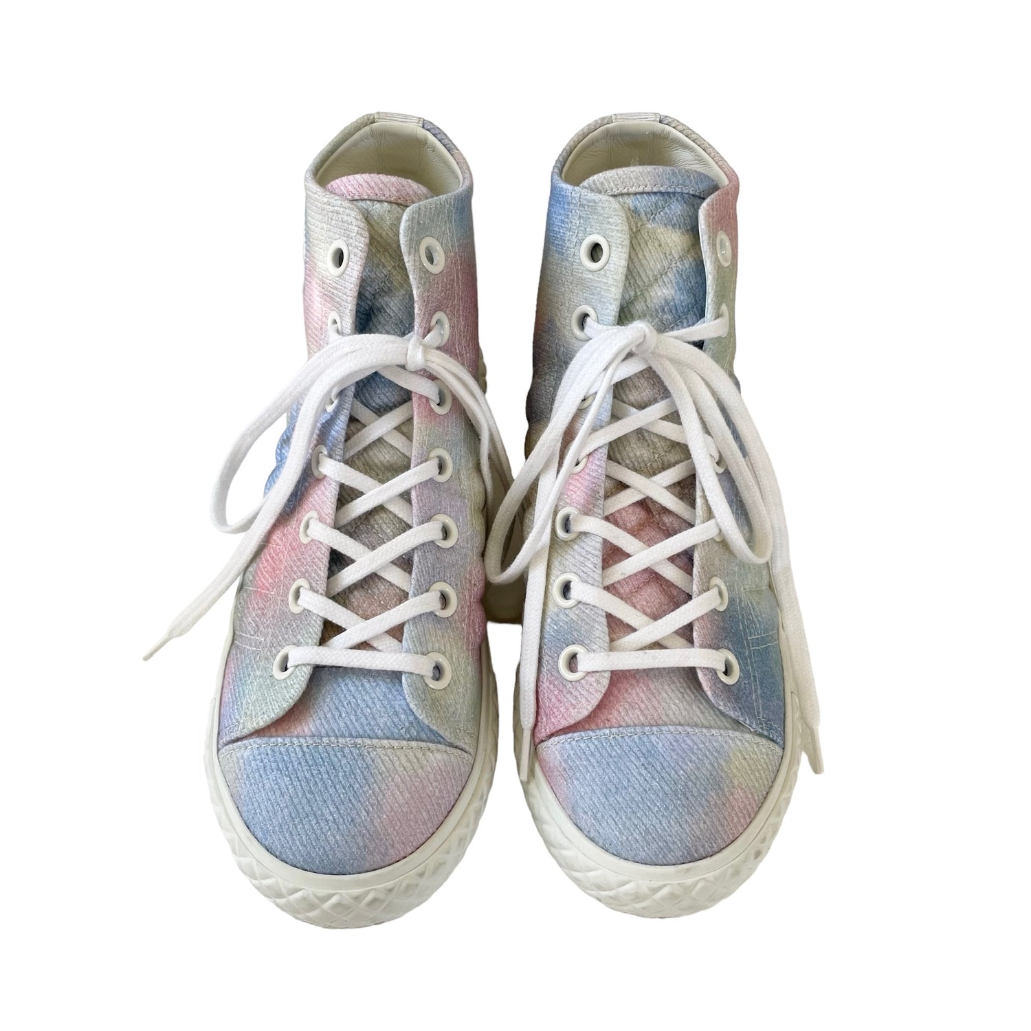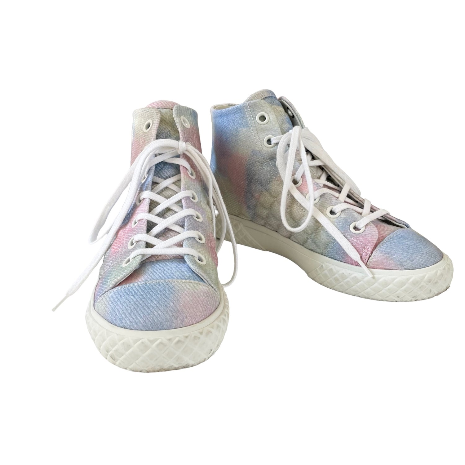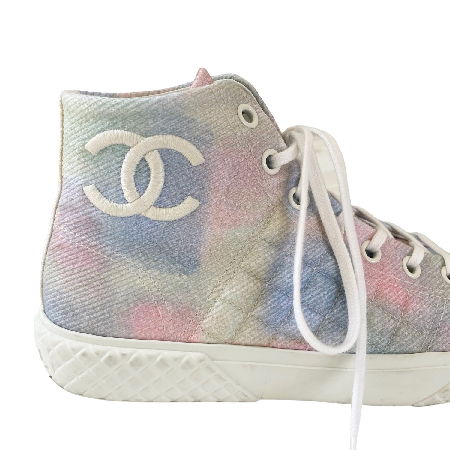 Chanel pastel tie-dye high top sneakers. Embroidered CC logo at the side. Designer size 38.
