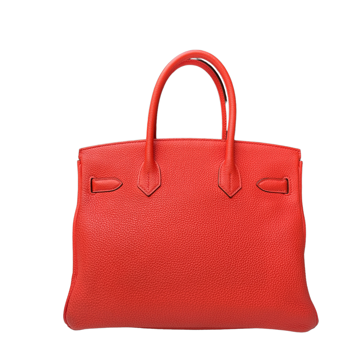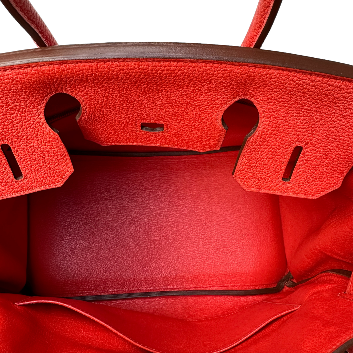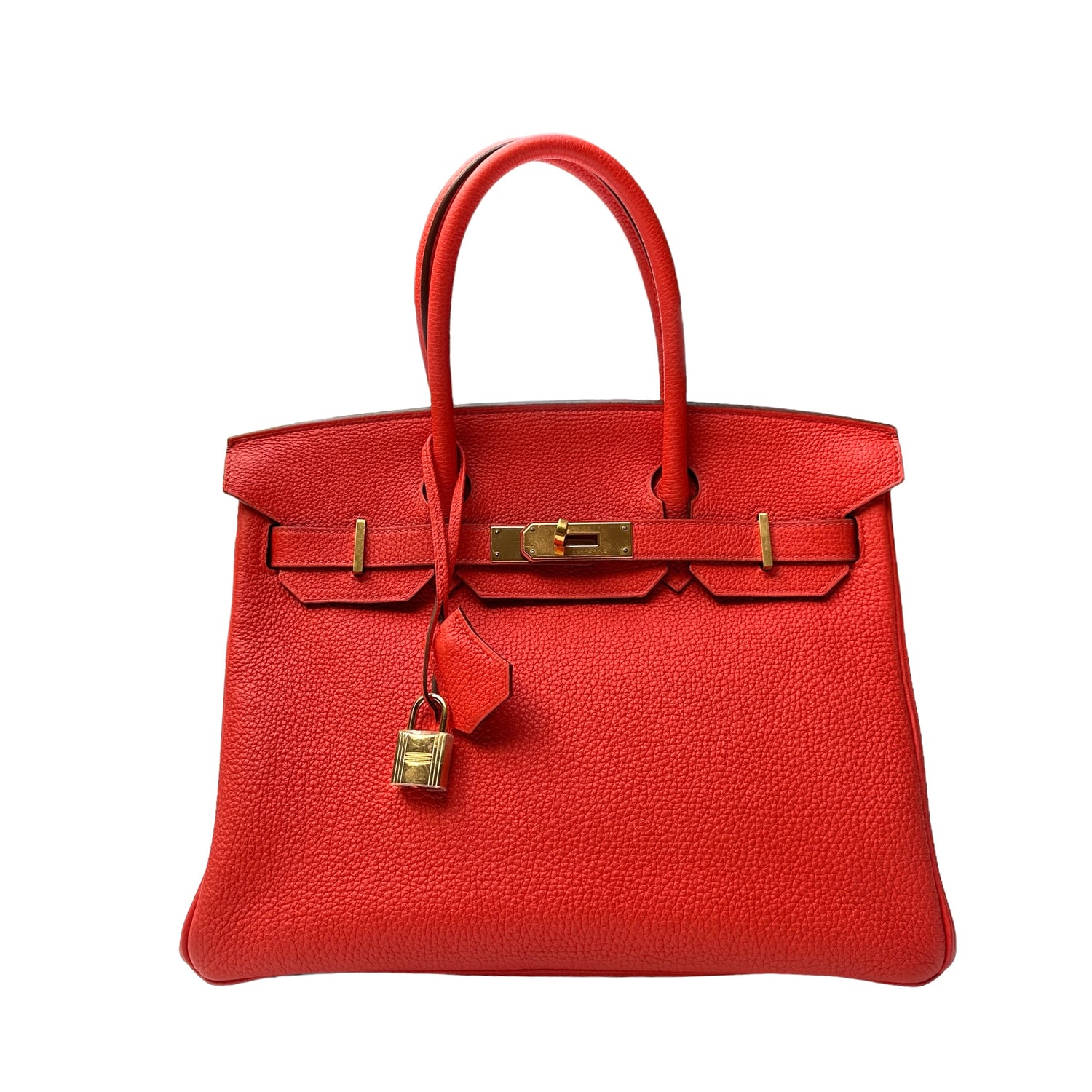 Hermes Birkin 30 bag. Togo calfskin leather retourné. Gold-plated hardware. Matte goatskin leather interior. One interior zip pocket. Capucine color is a very deep orange, going on red.