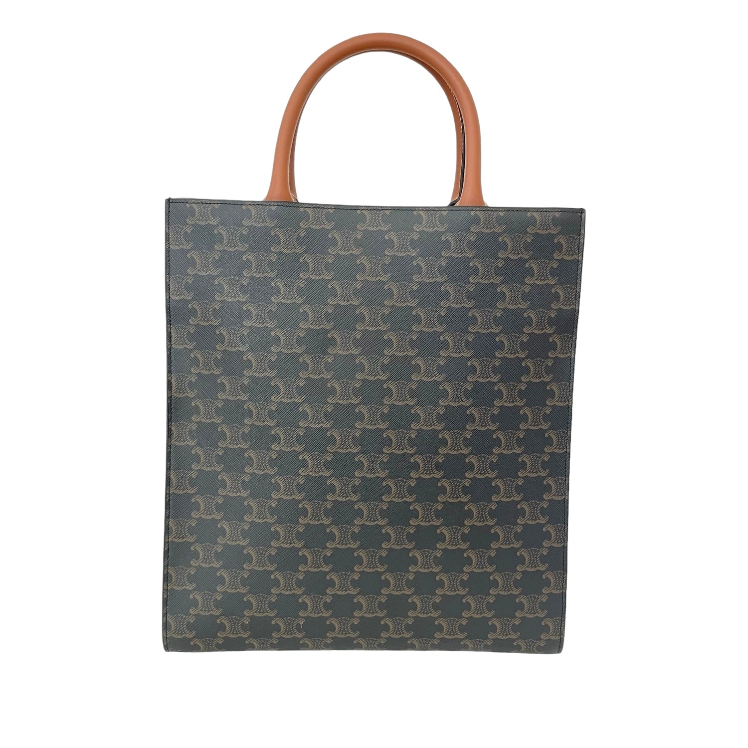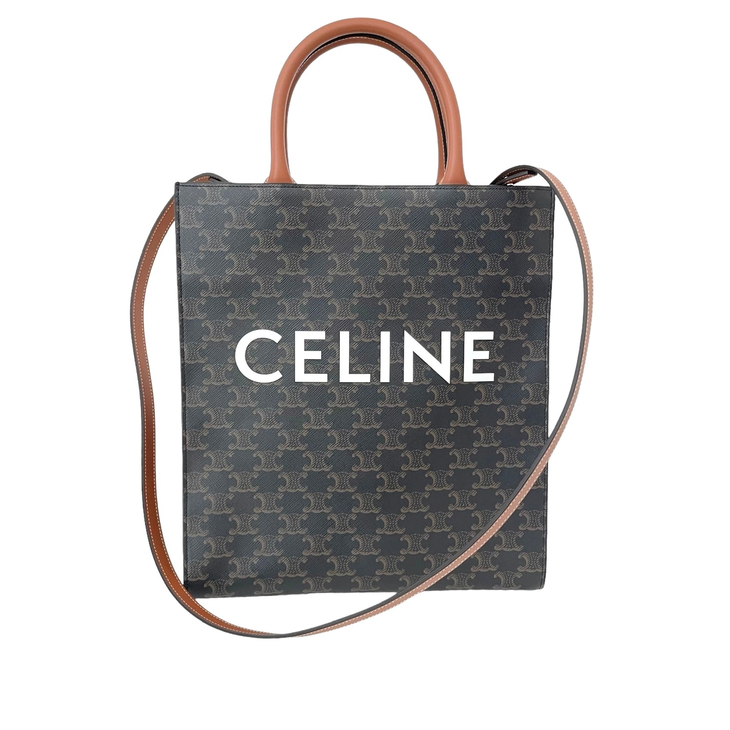 Celine triomphe canvas cabas. Celine logo at front. Brown leather trims and removable crossbody strap.