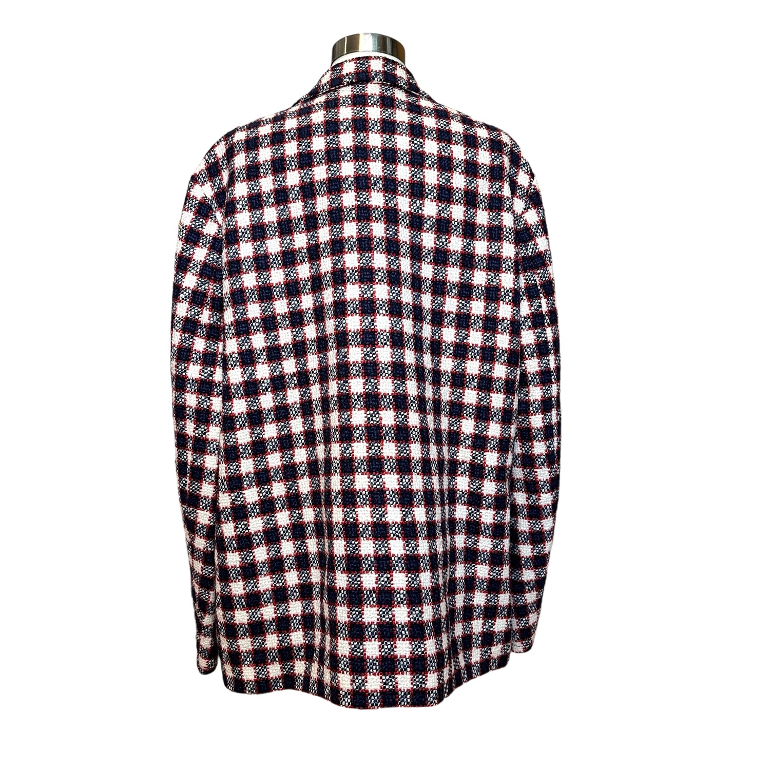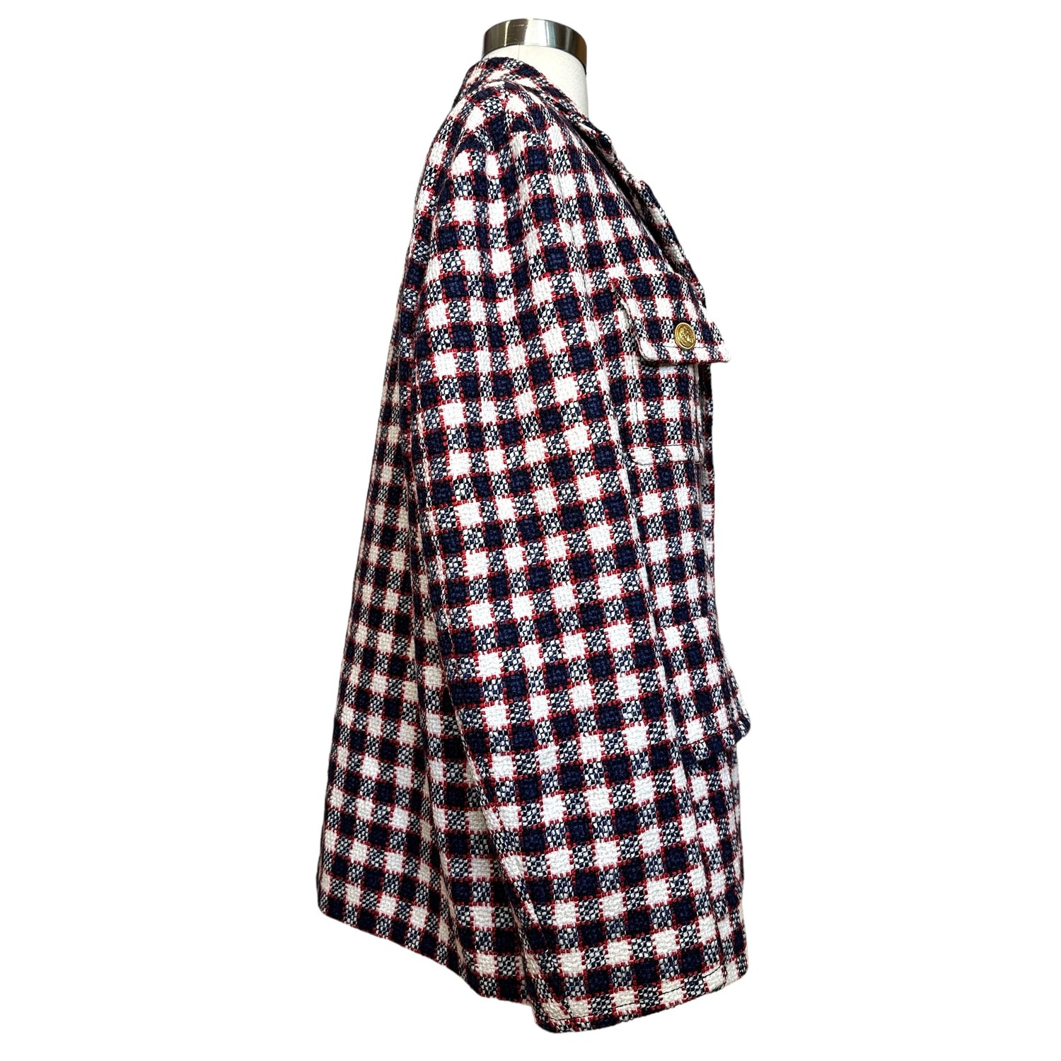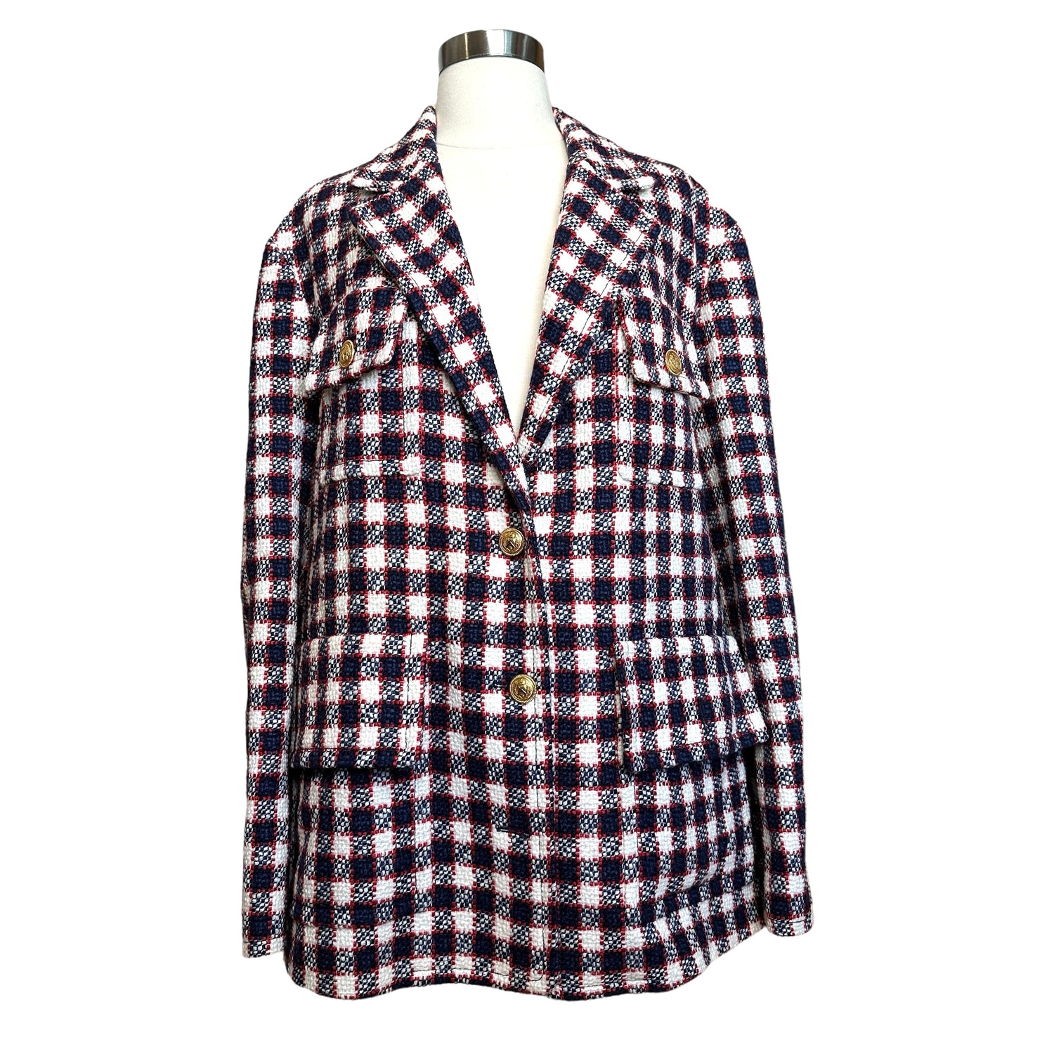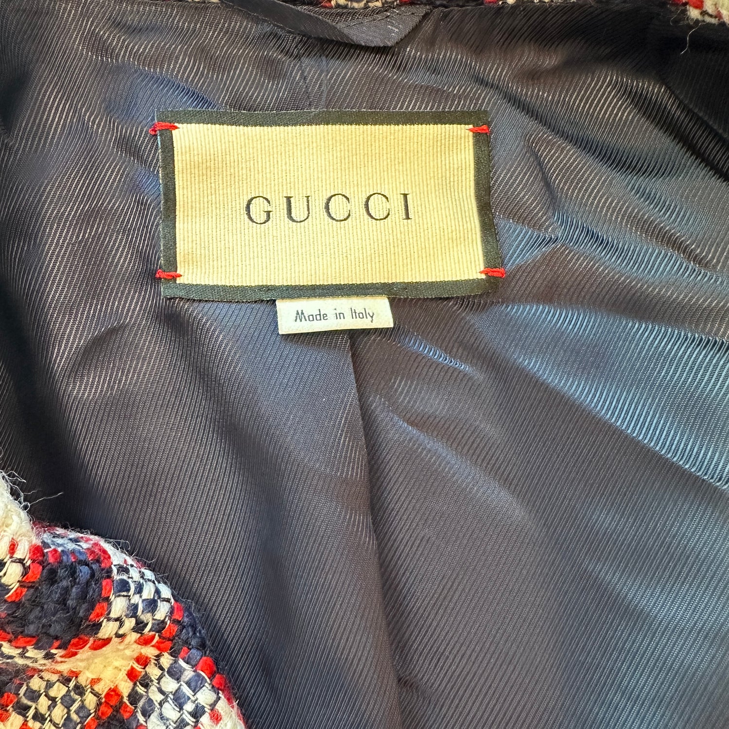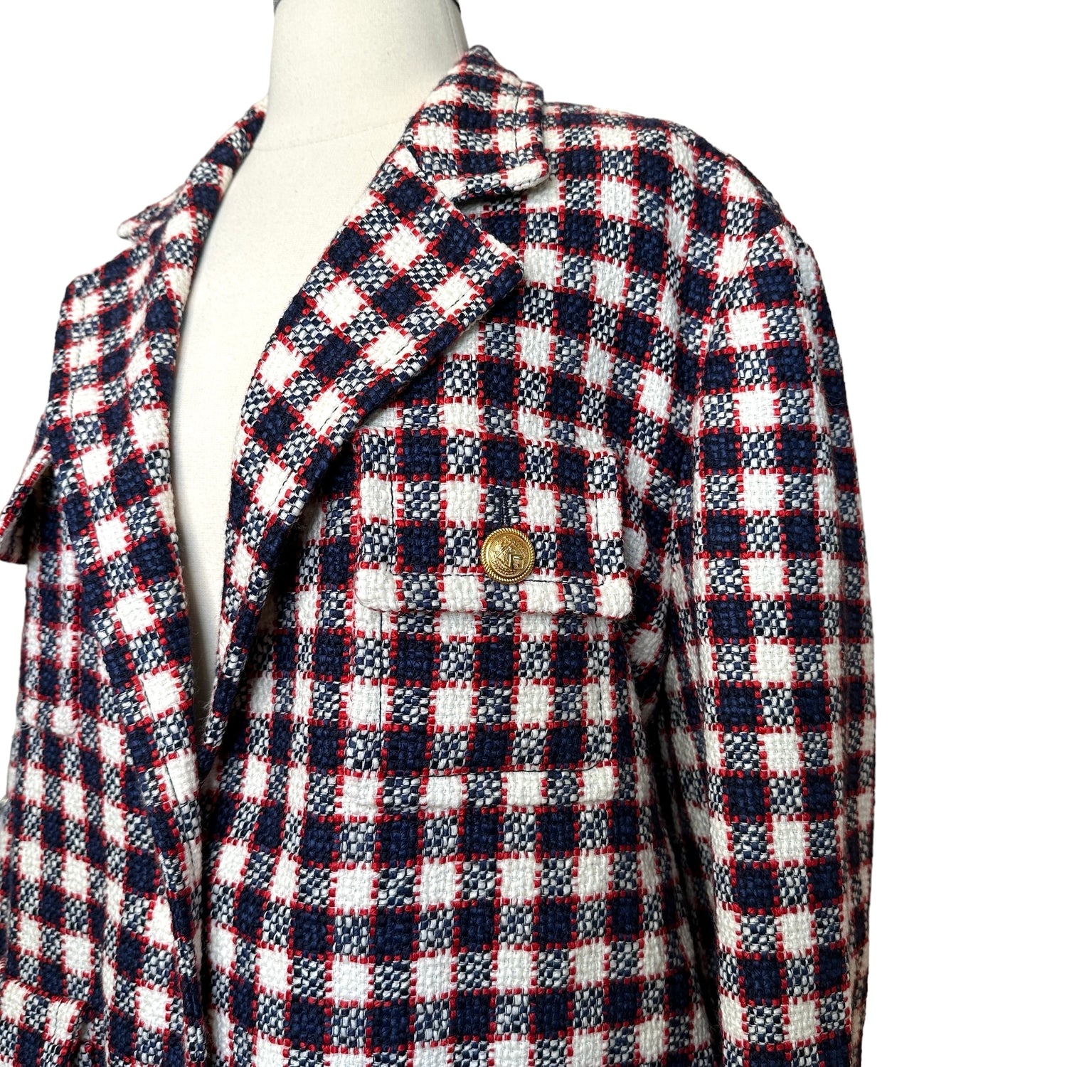 Gucci tweed jacket. Blue, red and white blazer. Pointed collar. Large gold buttons. Large flap pockets. Designer size 44