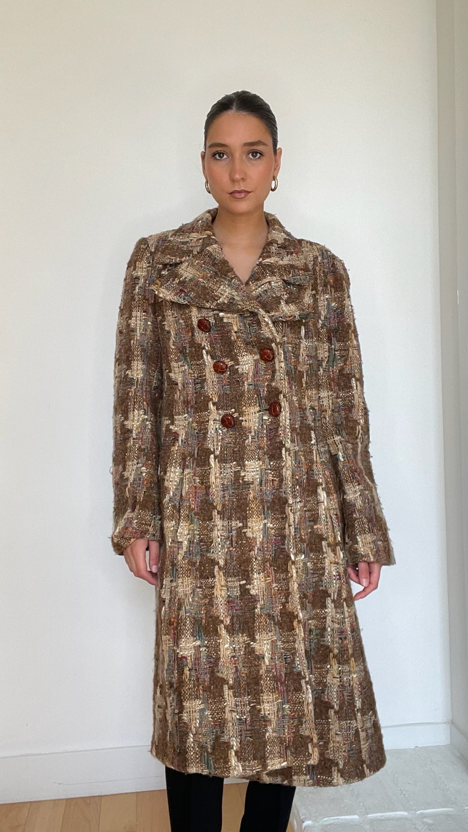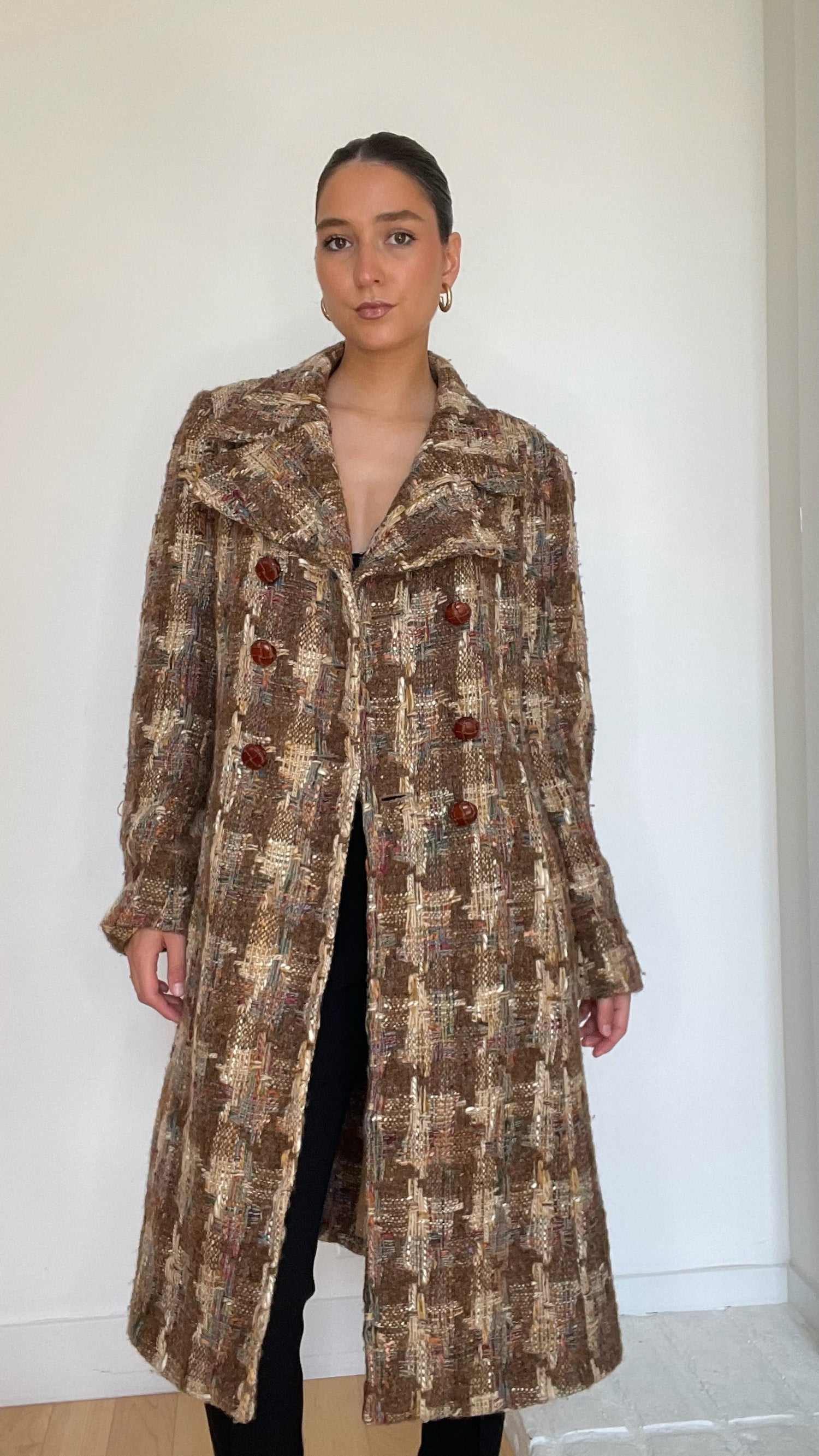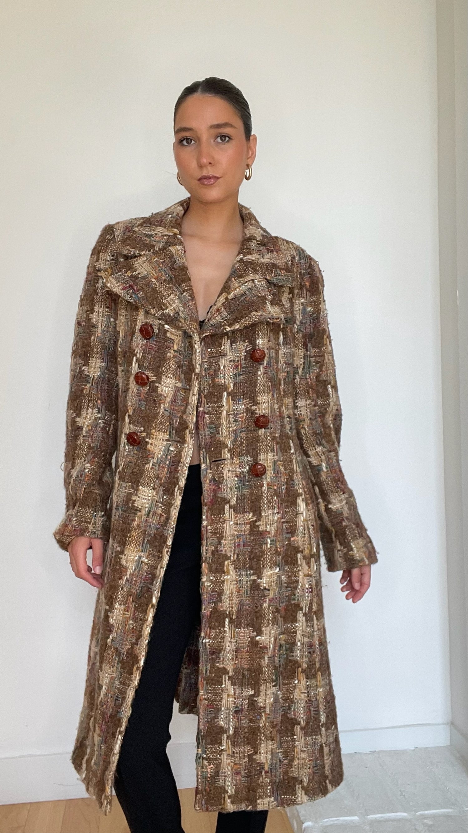Moschino tweed coat. Trench style and double breasted. Beautiful leather buttons. Designer size 46.