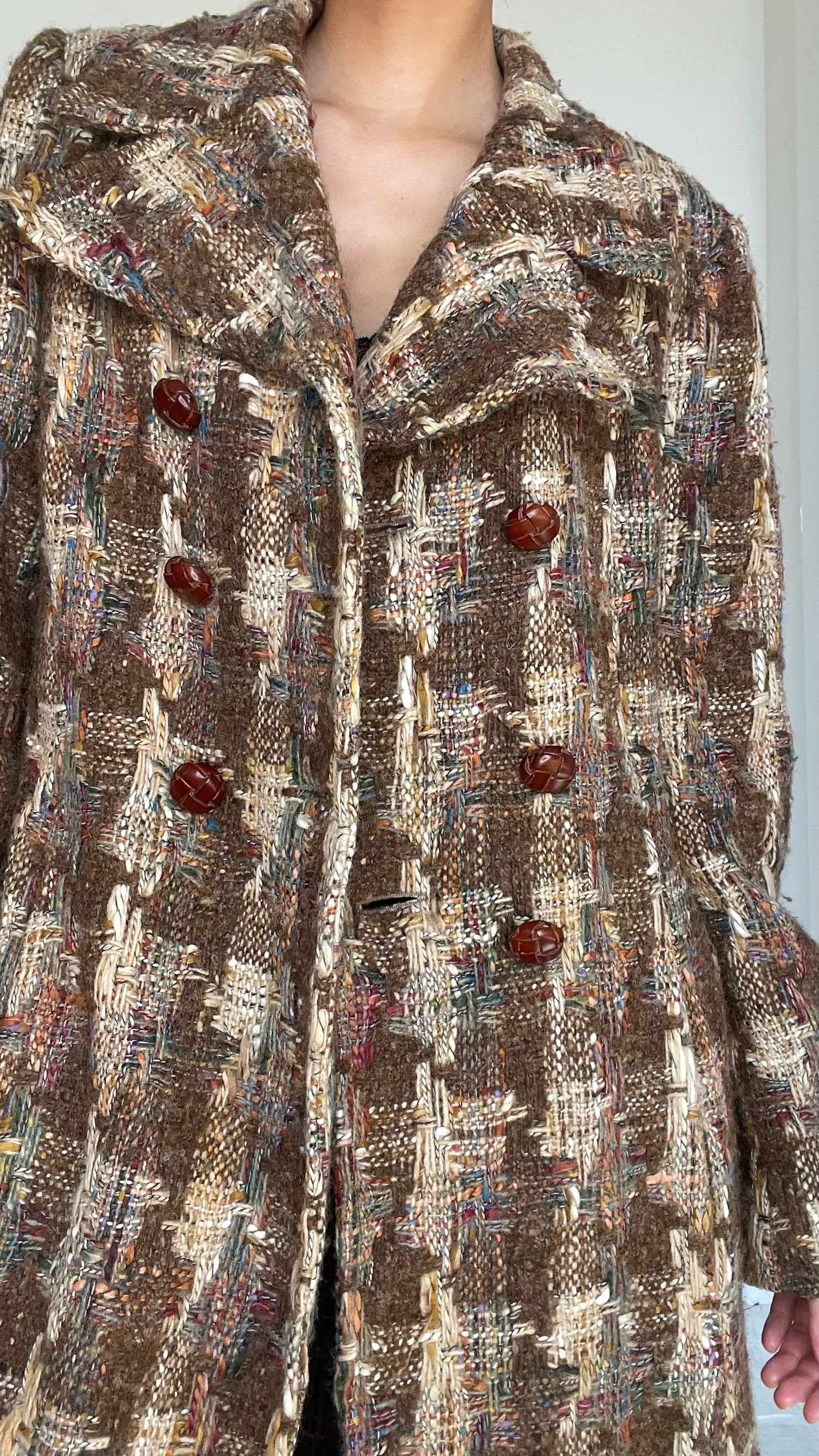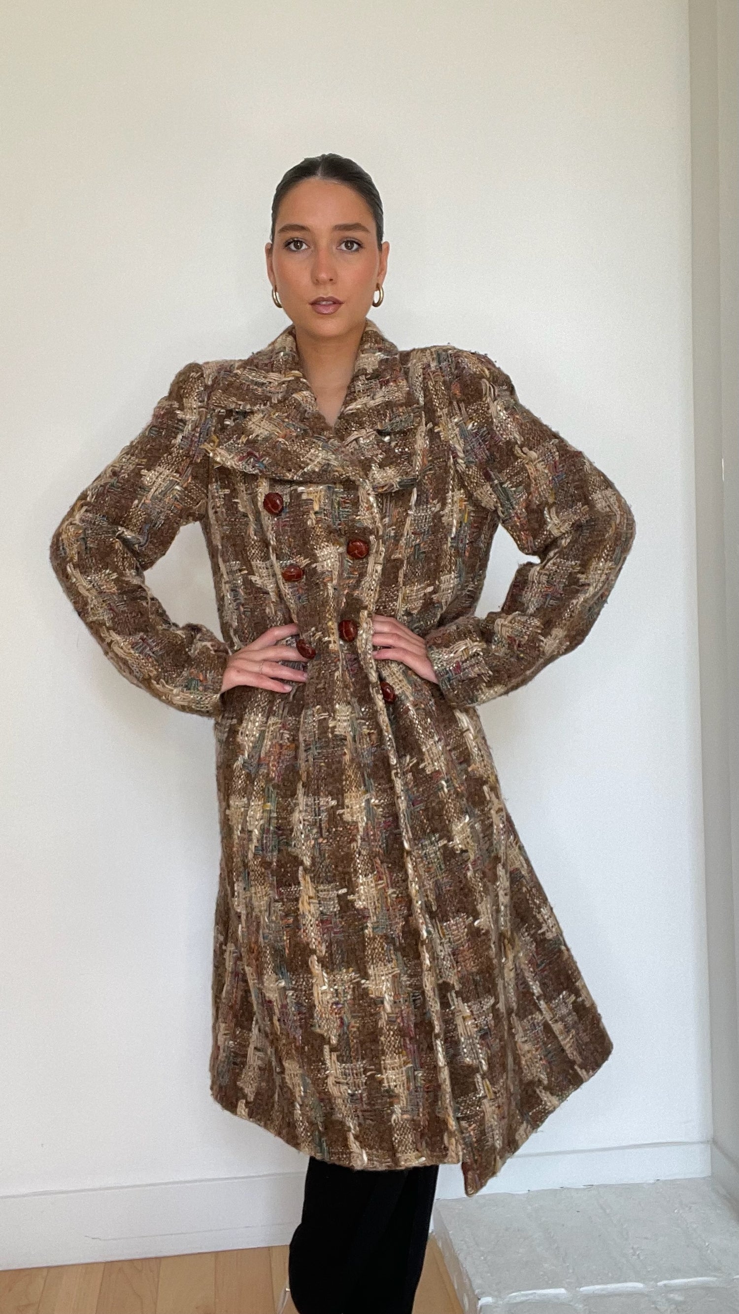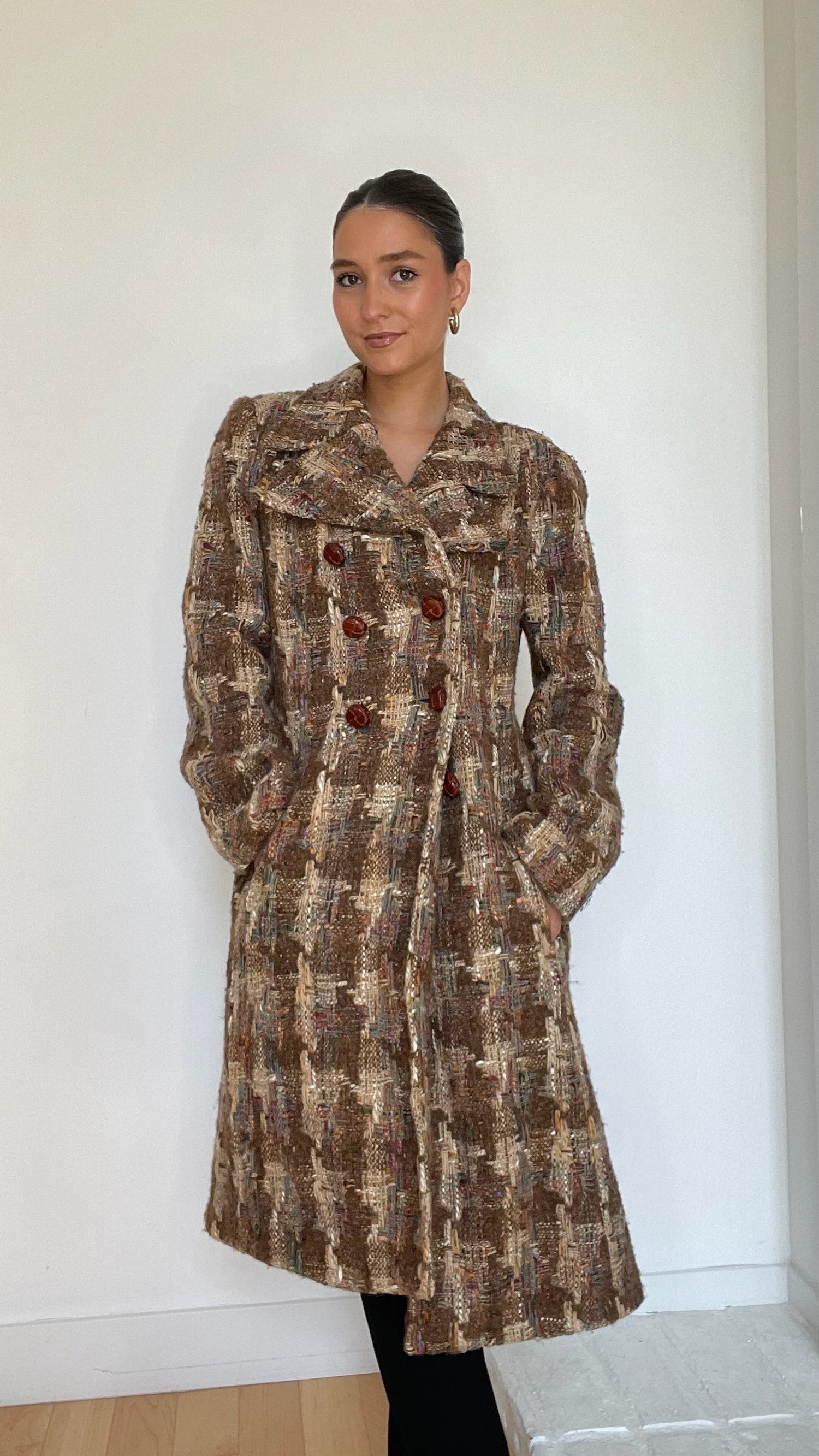 Moschino tweed coat. Trench style and double breasted. Beautiful leather buttons. Designer size 46.