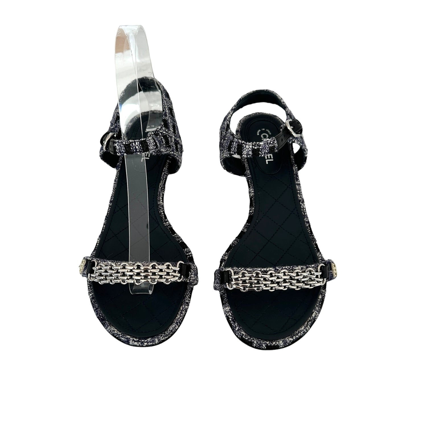 Chanel tweed sandals. Silver-tone reissue chain on top. Faux-pearl CC logo at top. Designer size 37.5.