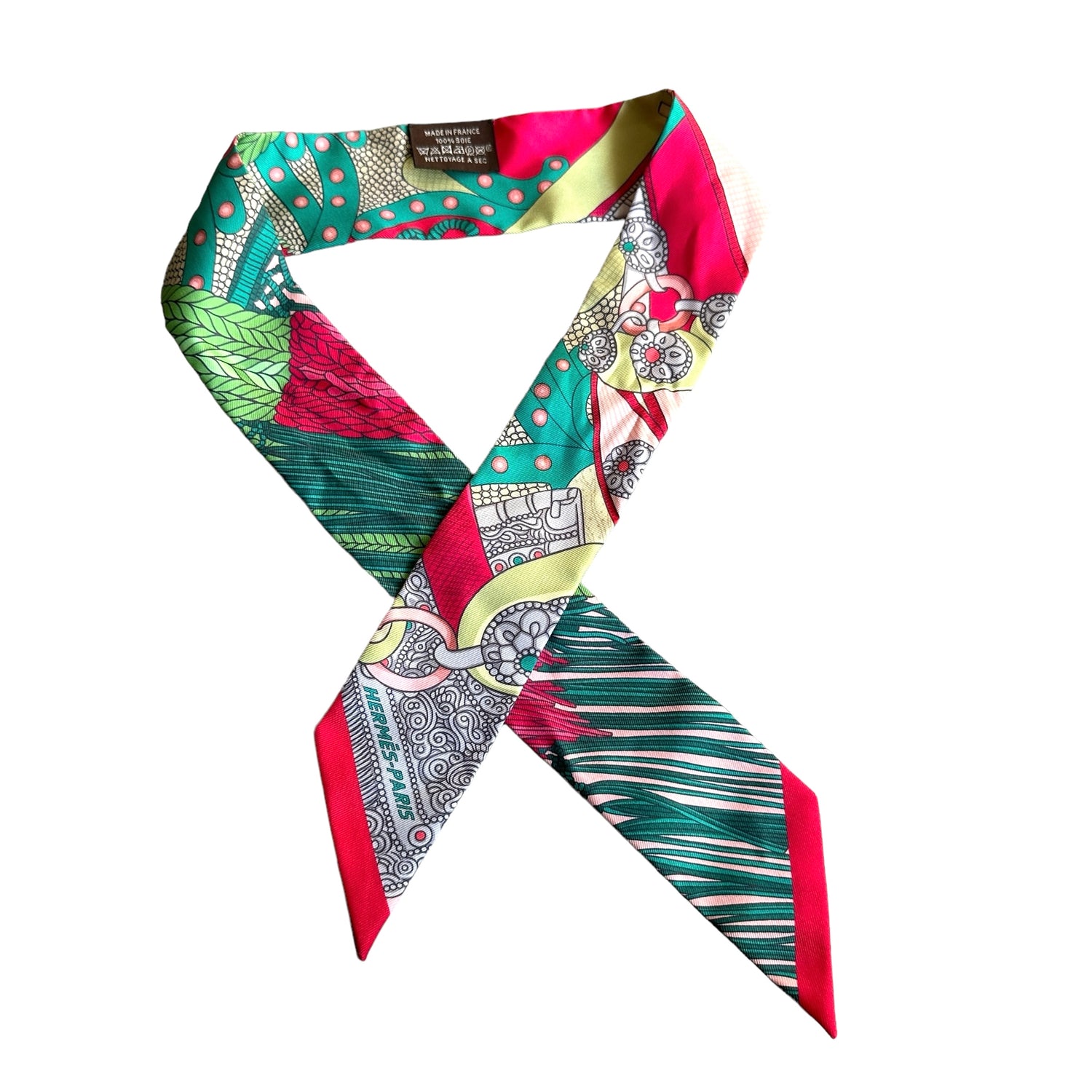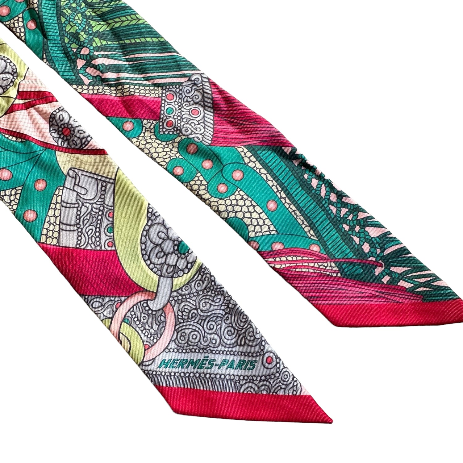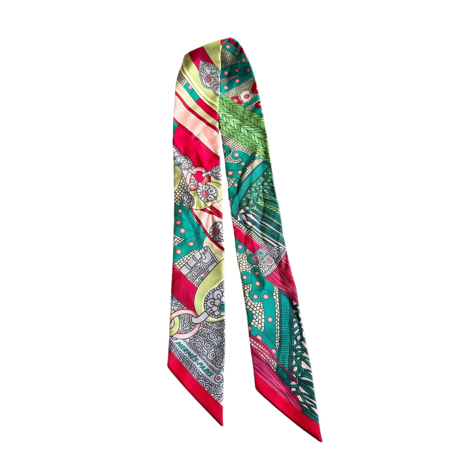 Hermes twilly scarf. Beautiful pink, green and grey colors. Logo at tip.