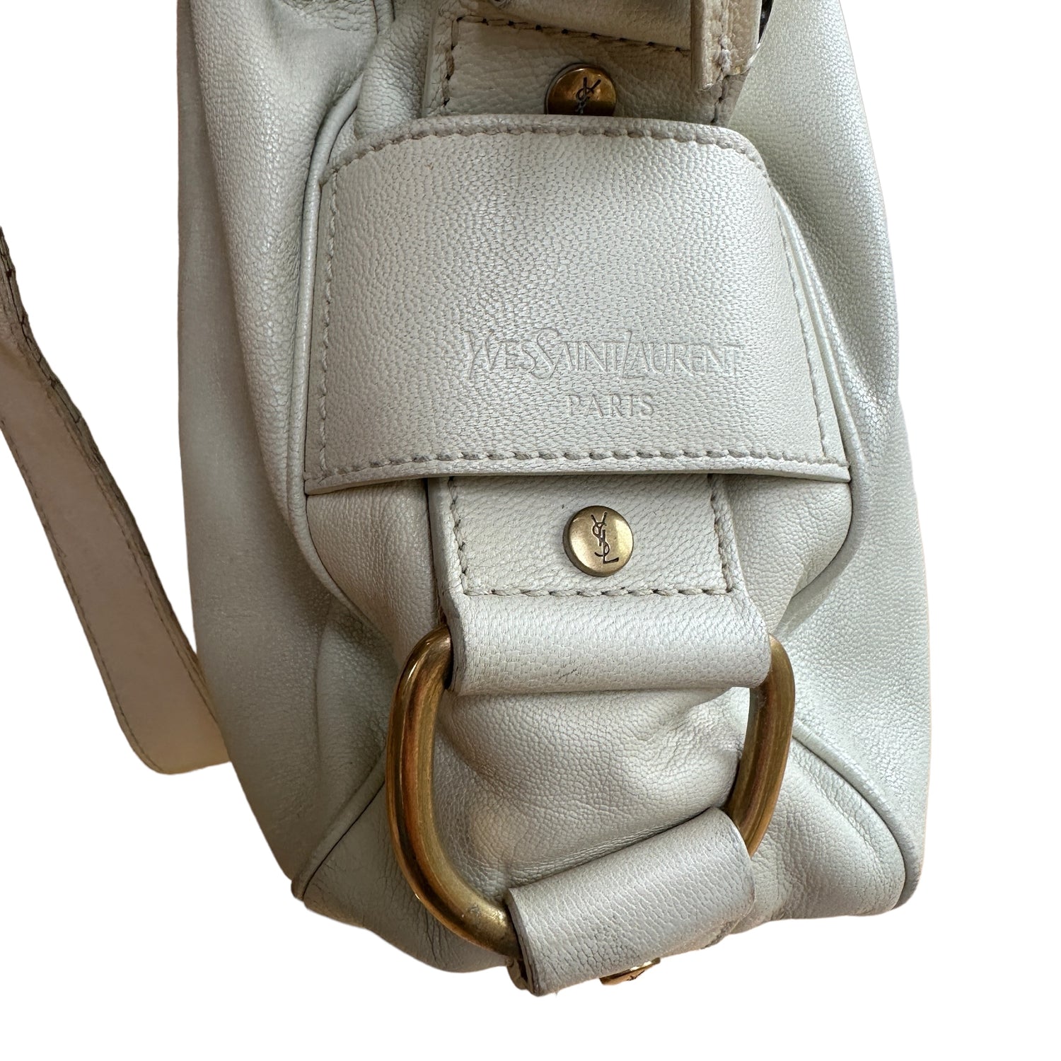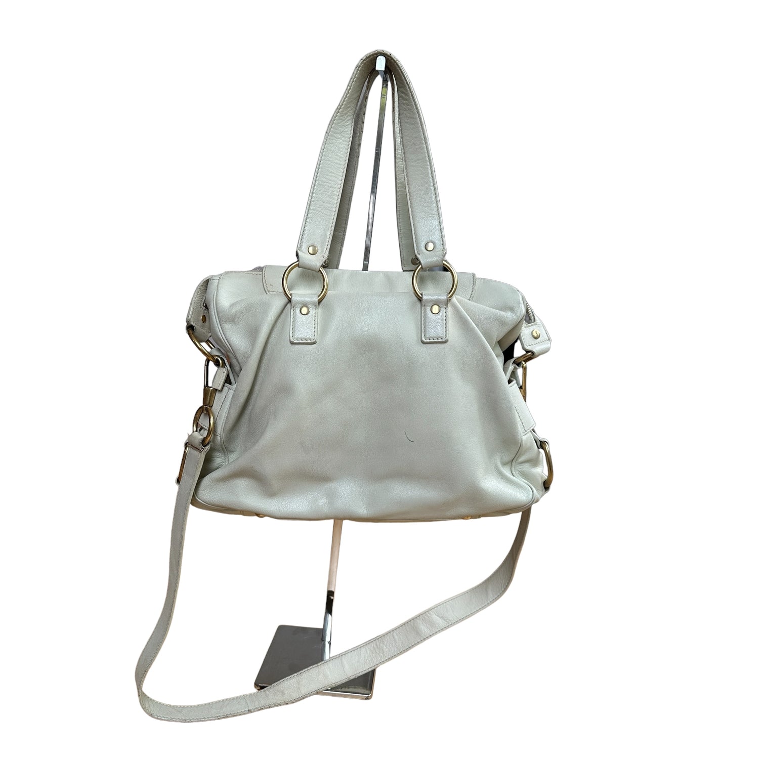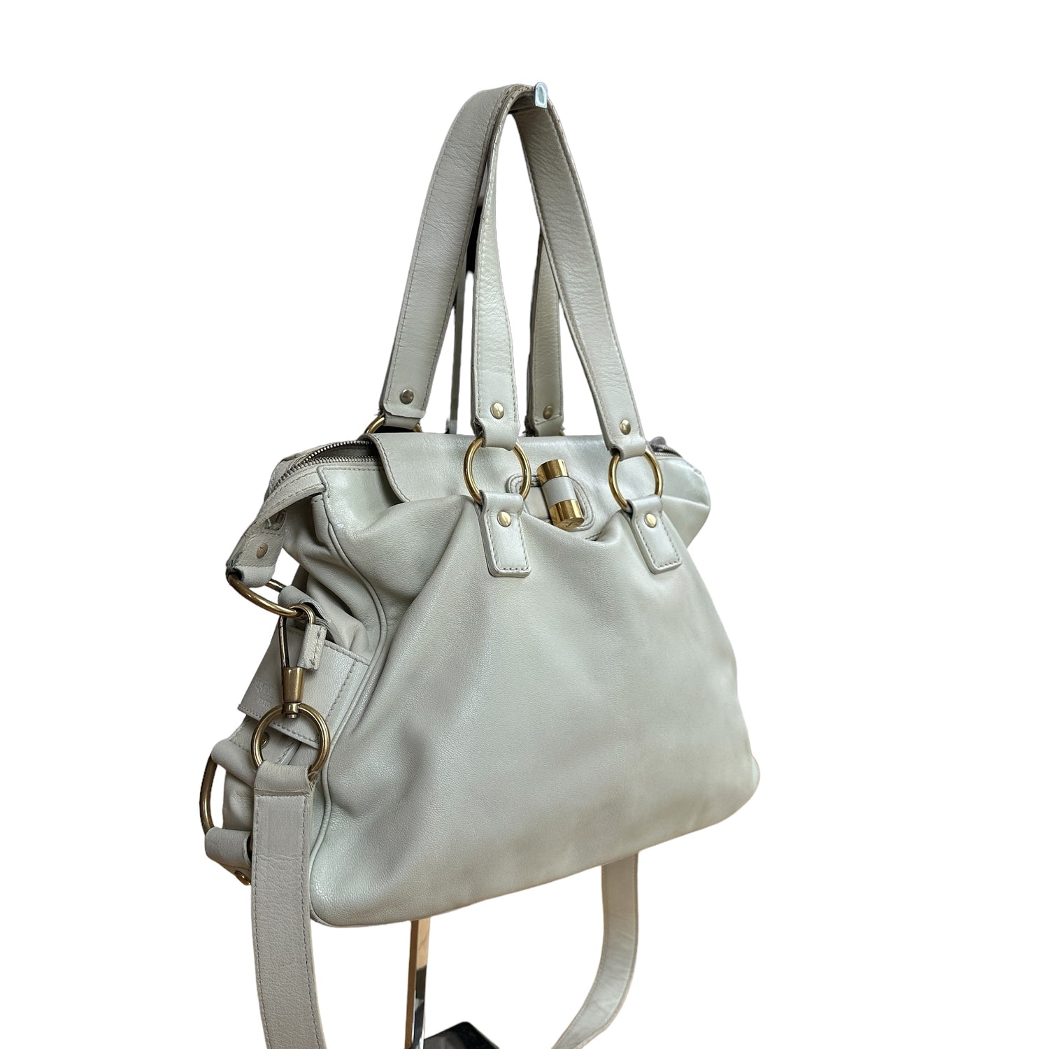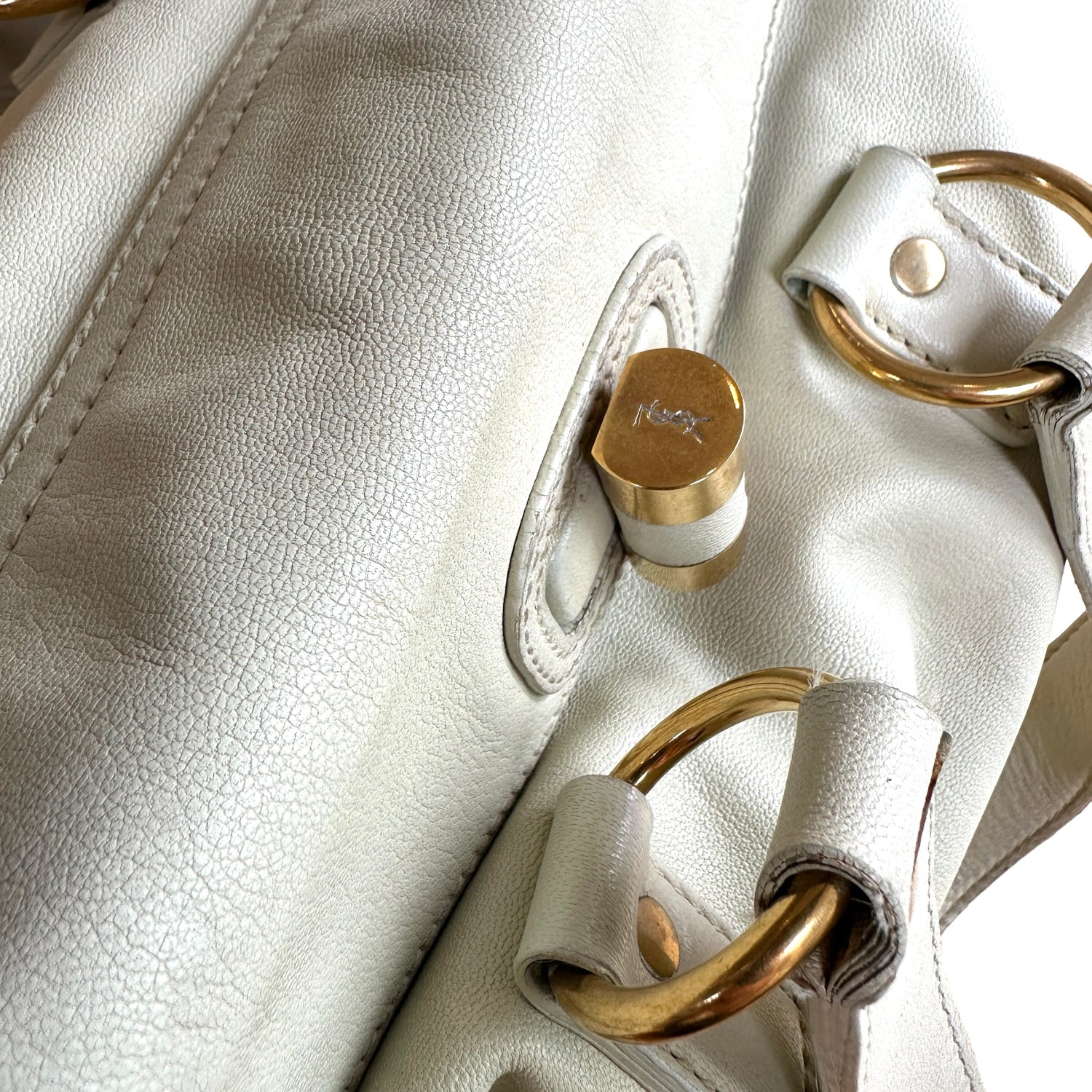 Yves Saint Laurent cream leather tote. Gold-tone hardware. Zipper and turn-lock closure at top. Double flat handles. Protective feet at base. Removable flat crossbody strap.