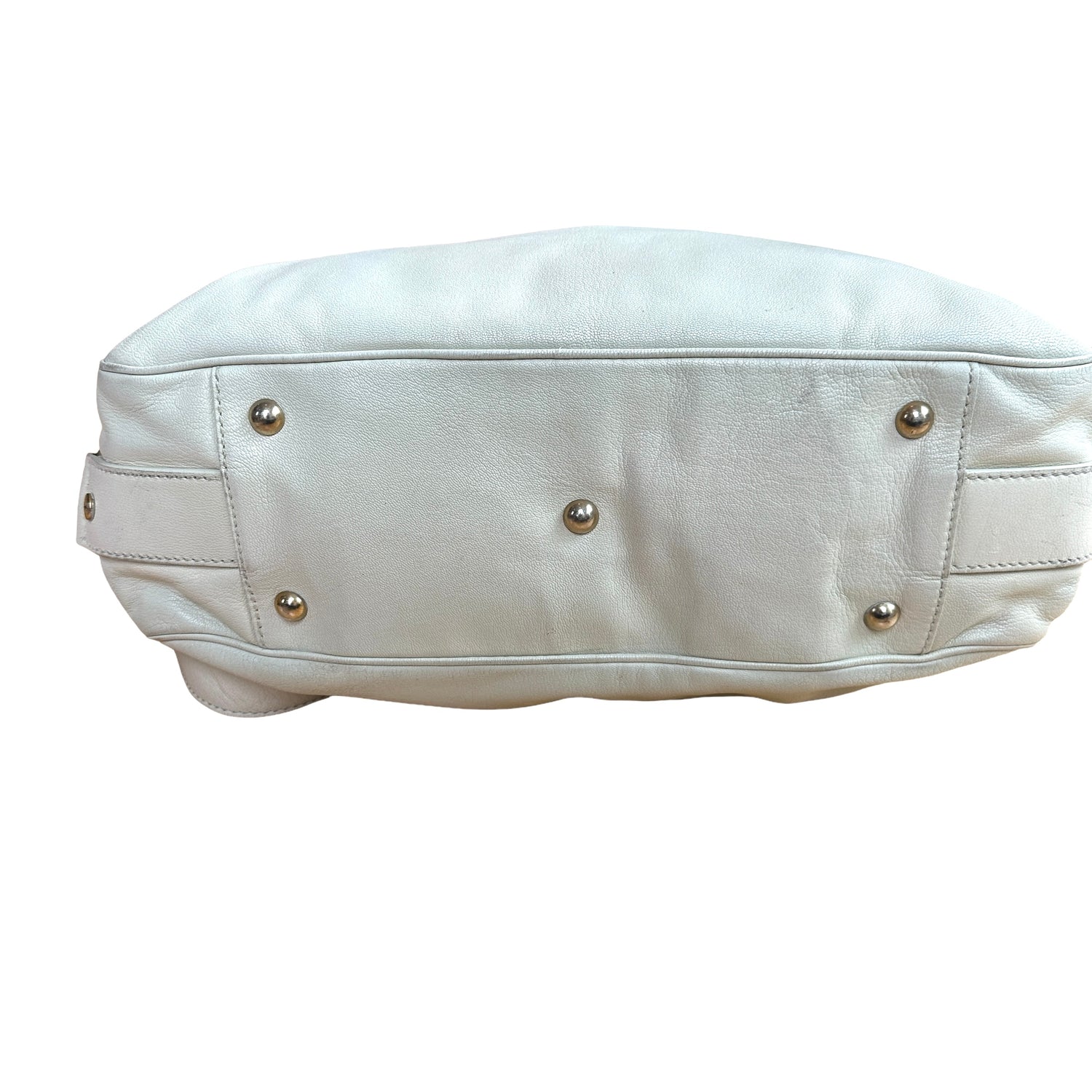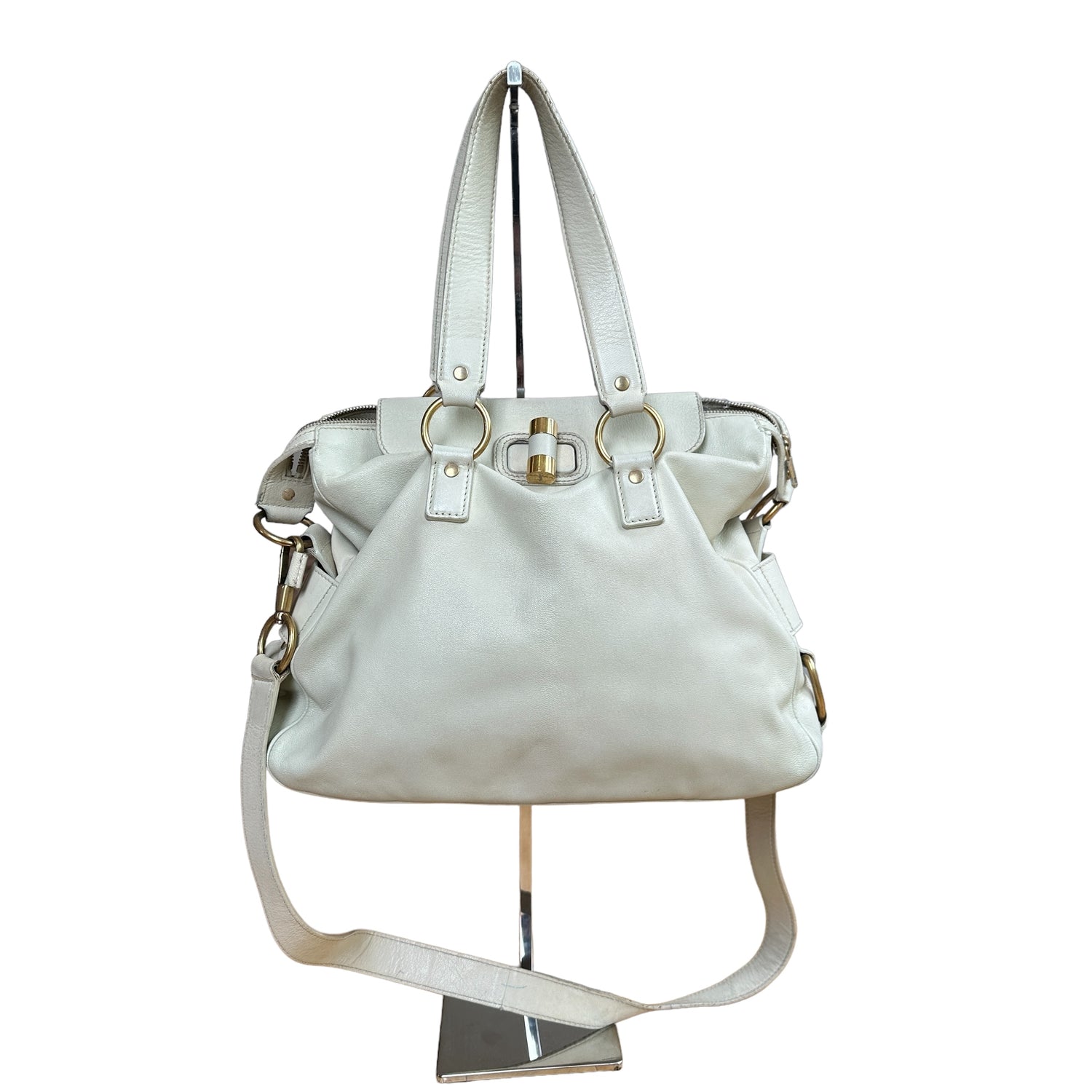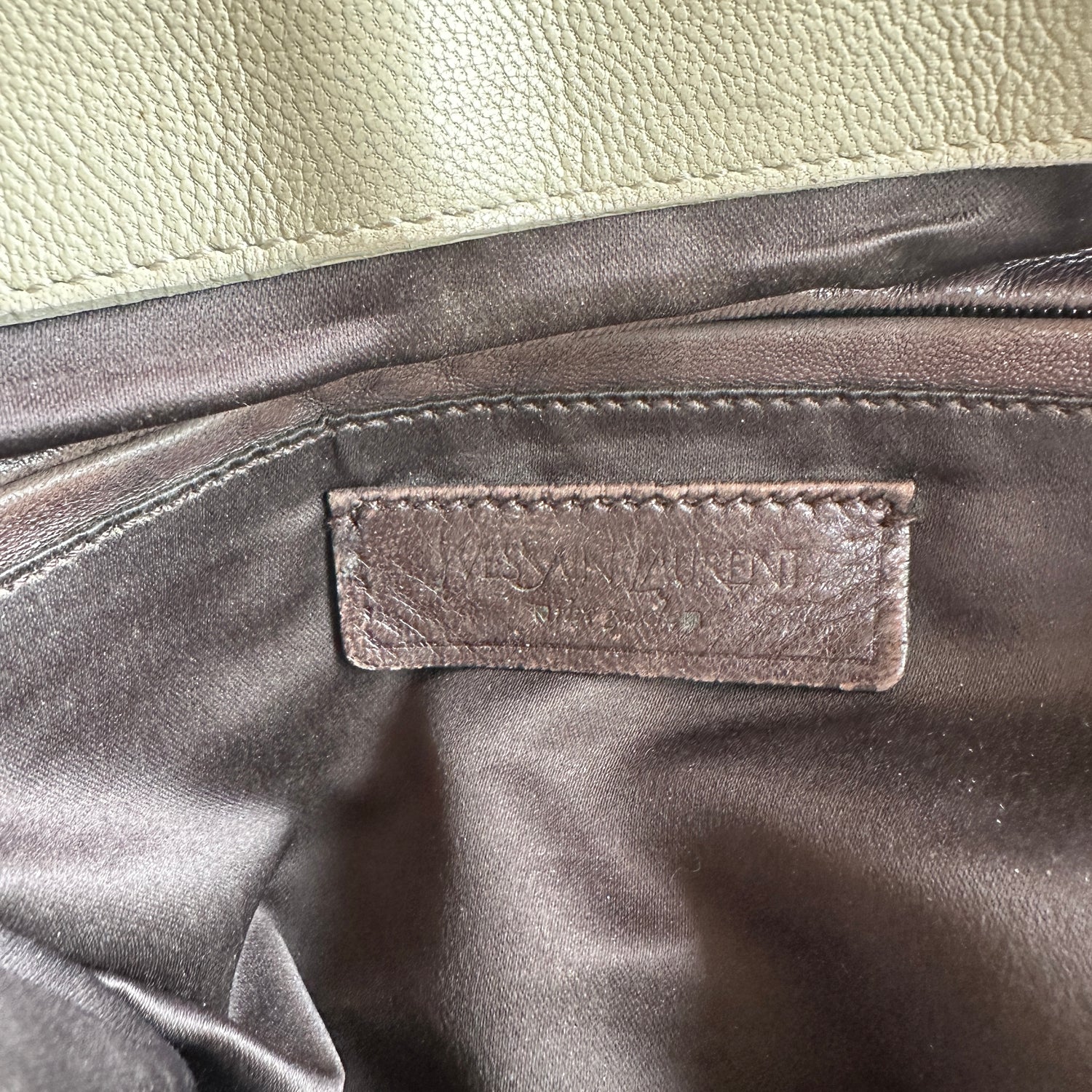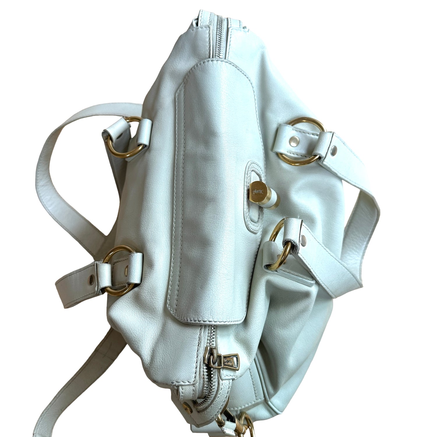 Yves Saint Laurent cream leather tote. Gold-tone hardware. Zipper and turn-lock closure at top. Double flat handles. Protective feet at base. Removable flat crossbody strap.