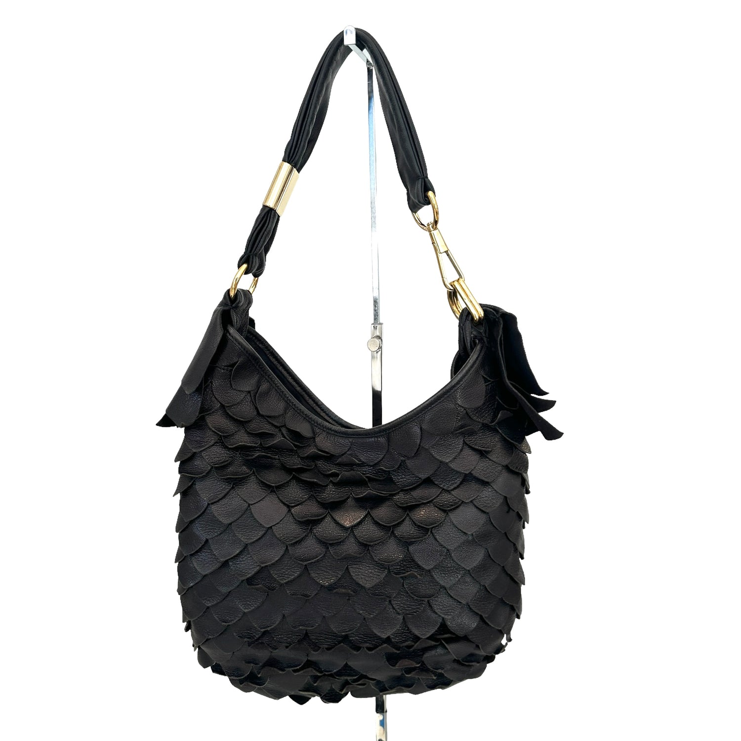 Yves Saint Laurent vintage hobo bag. Black leather. One leather shoulder handle with YSL logo gold-tone hardware and clasp. Magnetic snap closure at top.
